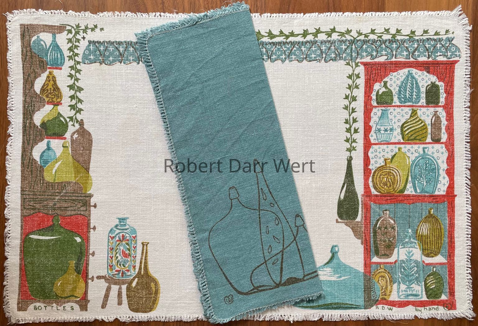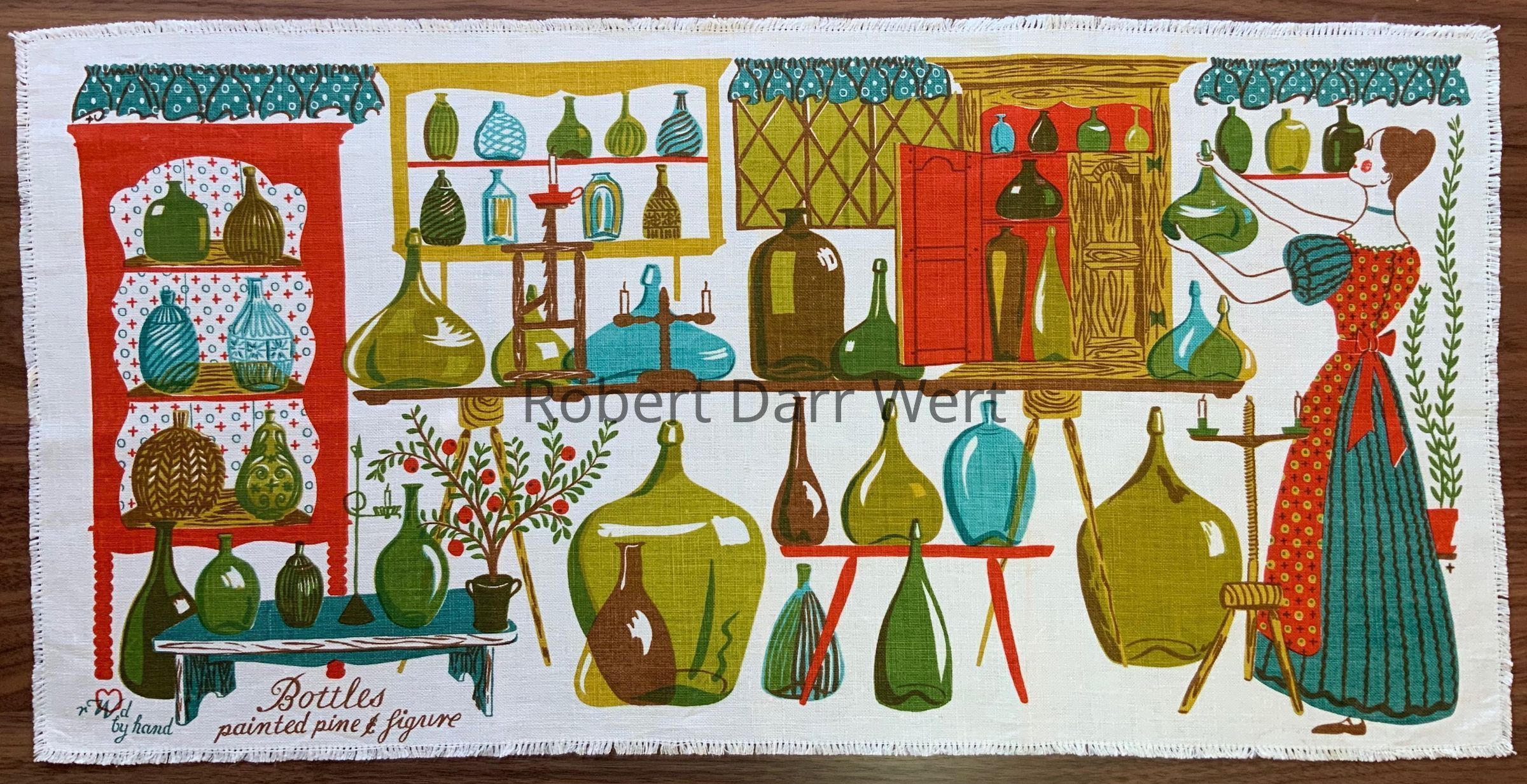 A six-color silkscreen print on off-white linen depicting glass bottles displayed in painted pine cabinets, on tables and on a bench. The forty-five bottles illustrated are hand blown and mold blown. Across the top the design is unified with a blue calico valance. The title “Bottles” appears at lower left.