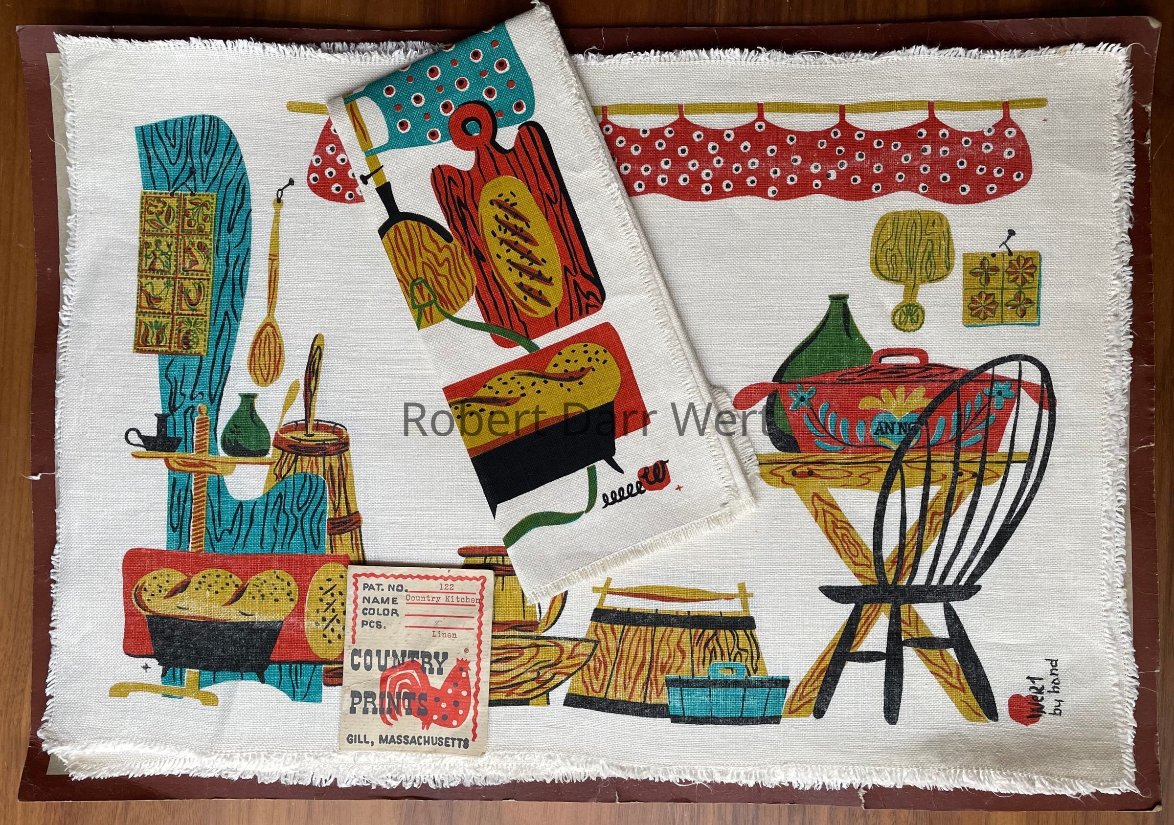 This table runner appears in the c.1954 brochure “Robert Darr Wert/Country Prints Kitchen Hangings” as No.224 Country Kitchen, and the c.1955 price list as 202 Woodenware. The price list states, “Pine furniture and Kitchen Utensils in colors to match Mat #122.”