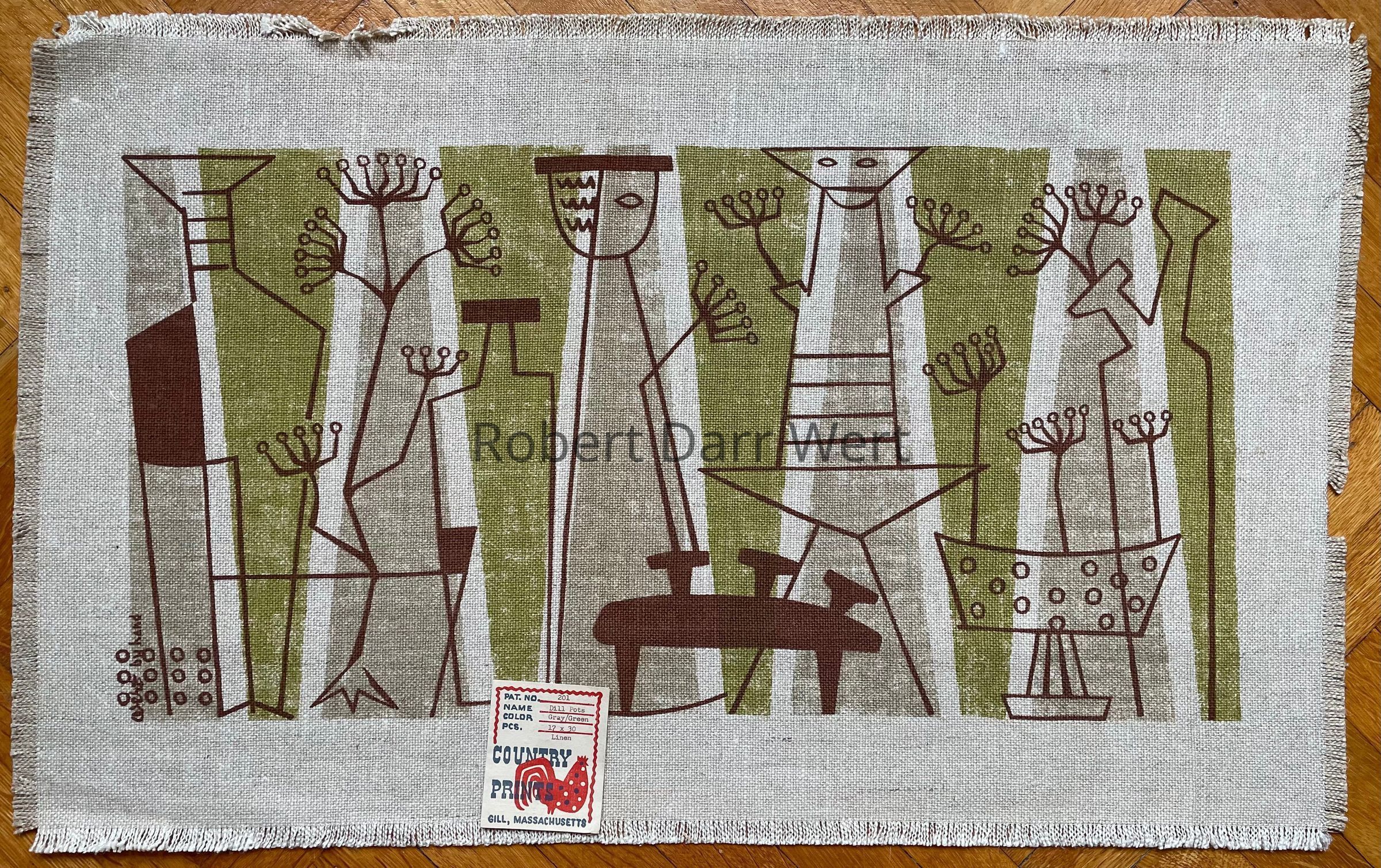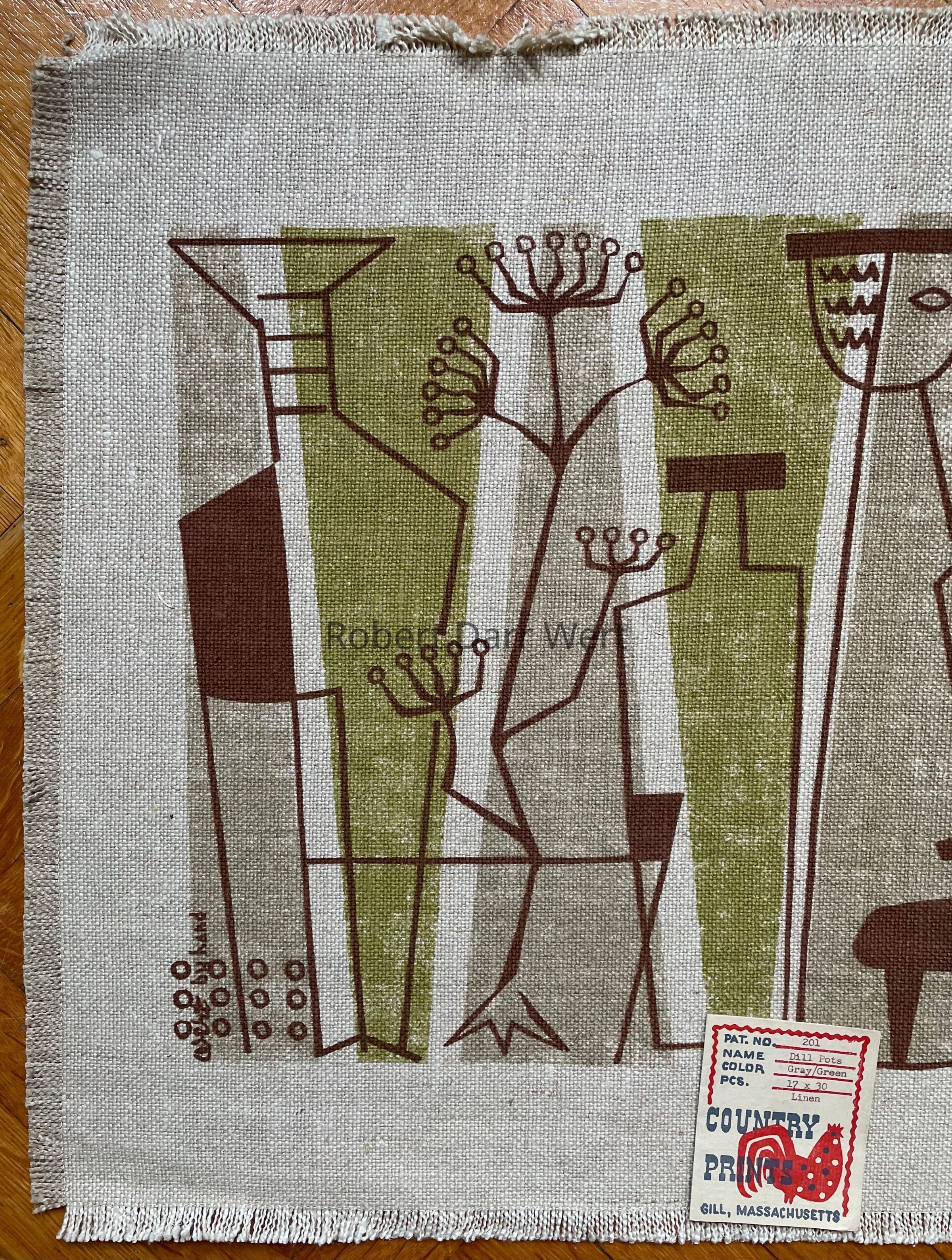 A table runner with a three-color silkscreen print on heavy off-white linen depicting abstractions of mid-century ceramics against trapezoidal fields of green and gray punctuated with dill flowers.