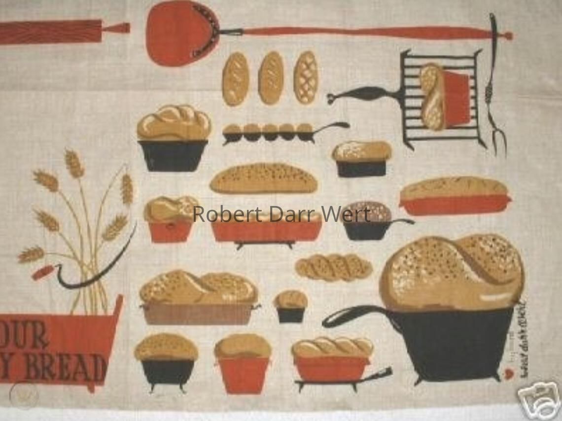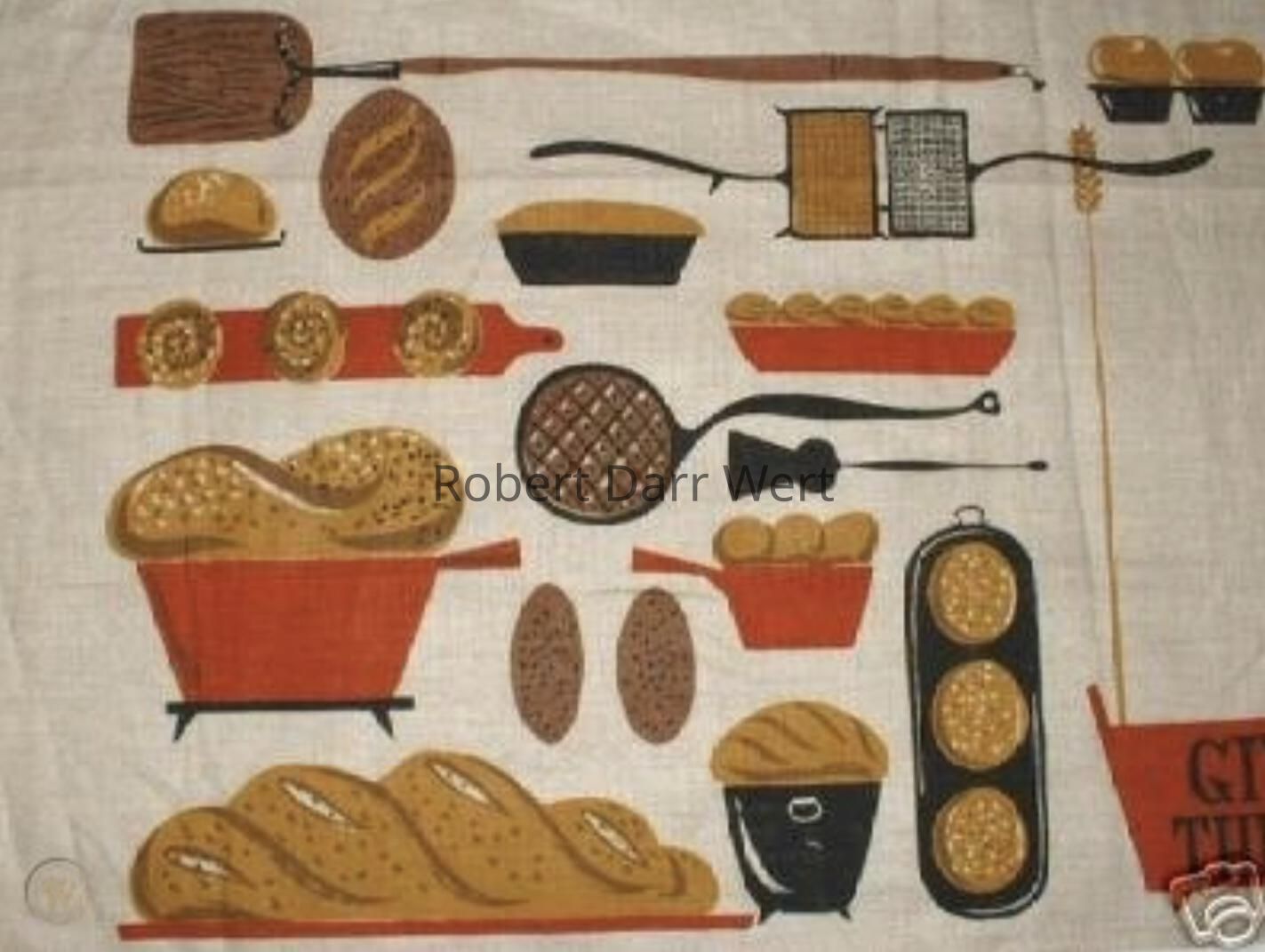 A four-color silkscreen print on natural linen depicting baked breads, wheat stalks, and the tools and implements for baking breads. At lower center, printed on the face of two wooden bins, is a line from the Lord’s Prayer: “Give Us This Day Our Daily Bread”, a recurrent theme in Wert’s work.