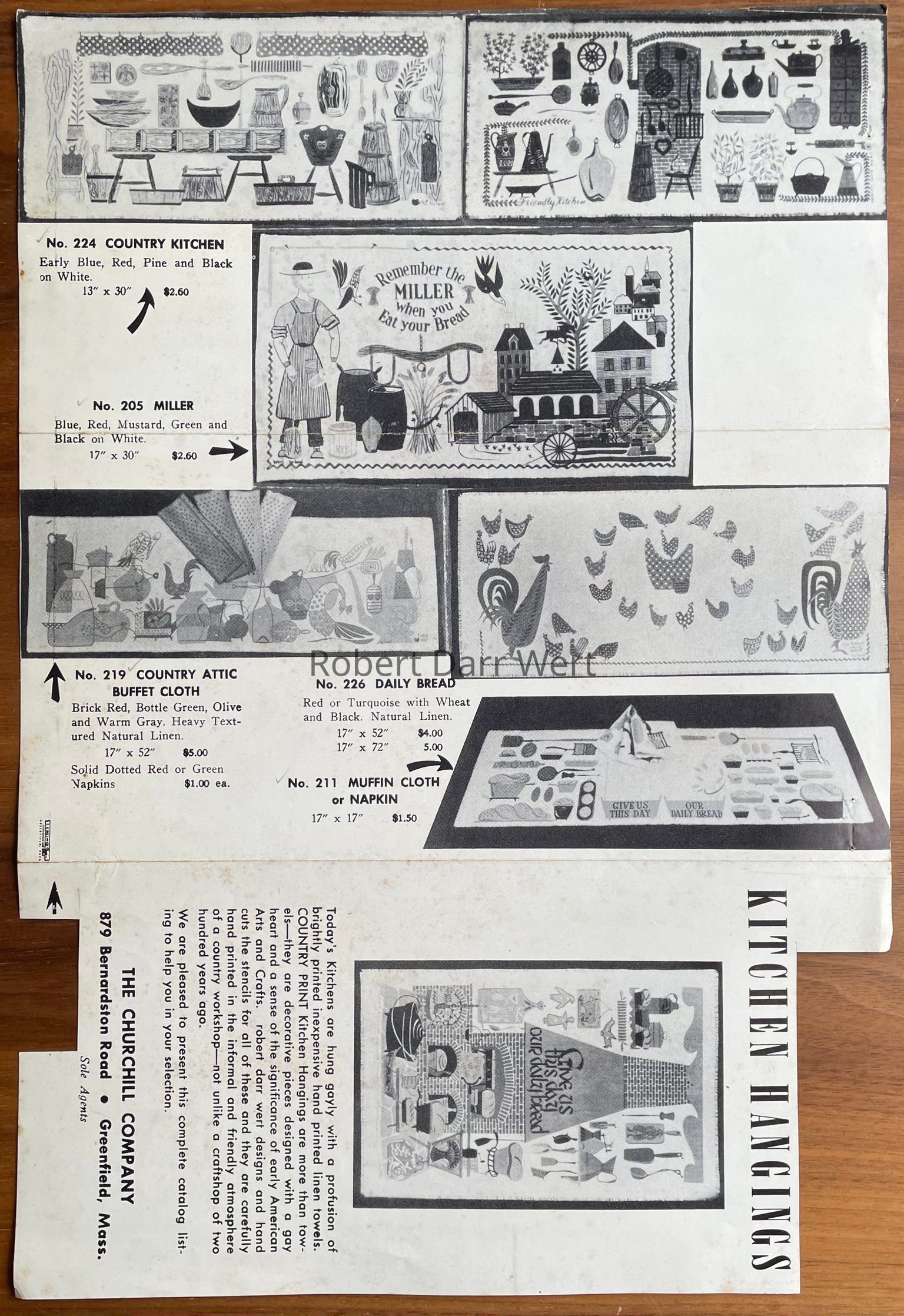 This runner was produced in two colorways: red and blue/turquoise. In a smaller size, this table runner appears in the c.1953 brochure “Robert Darr Wert/Country Prints Kitchen Hangings”, listed in two sizes: 17” x 52”, and 17” x 72”; see images.