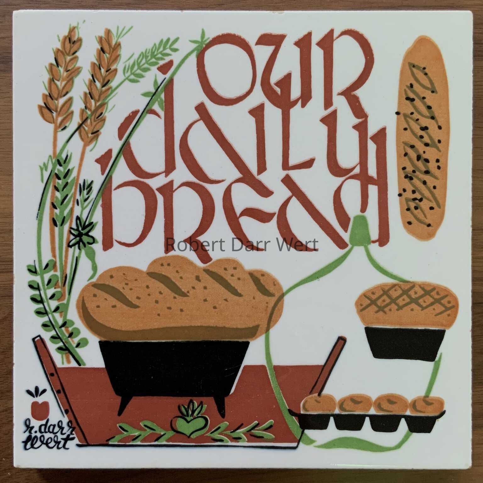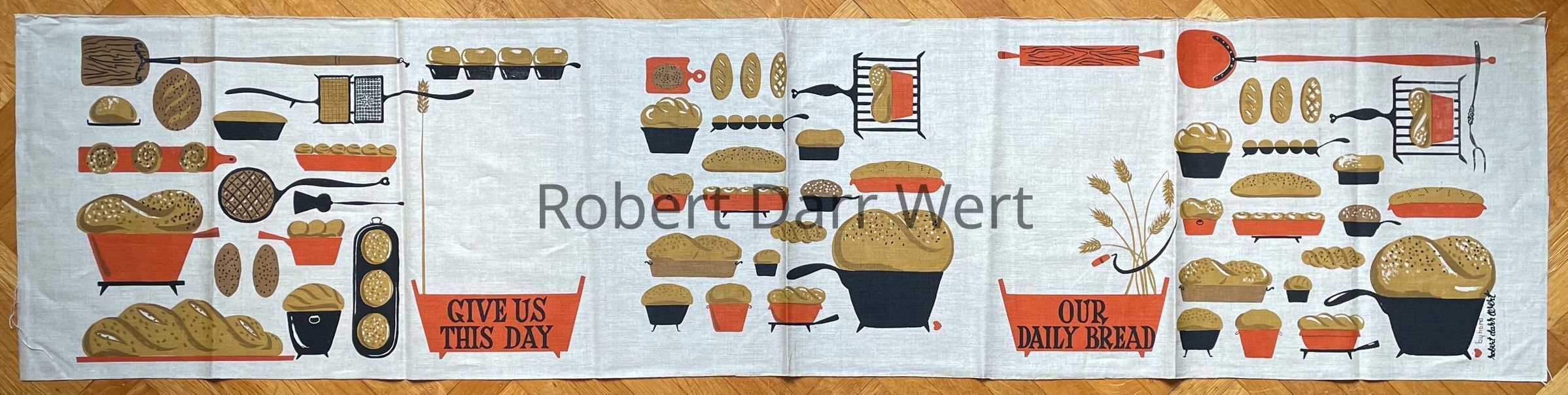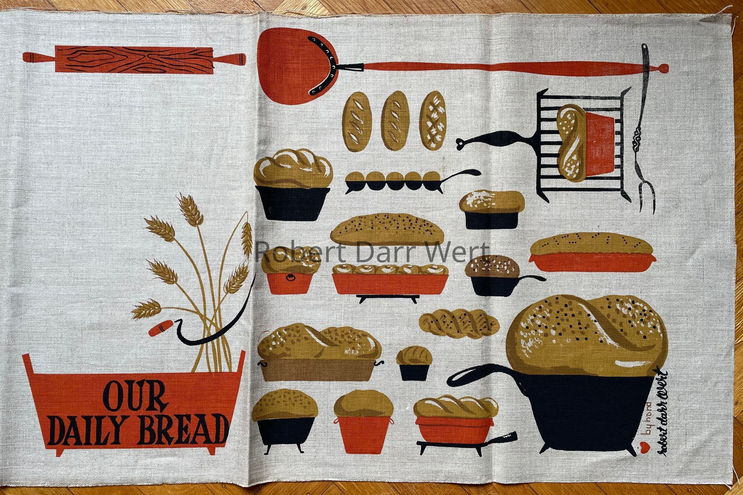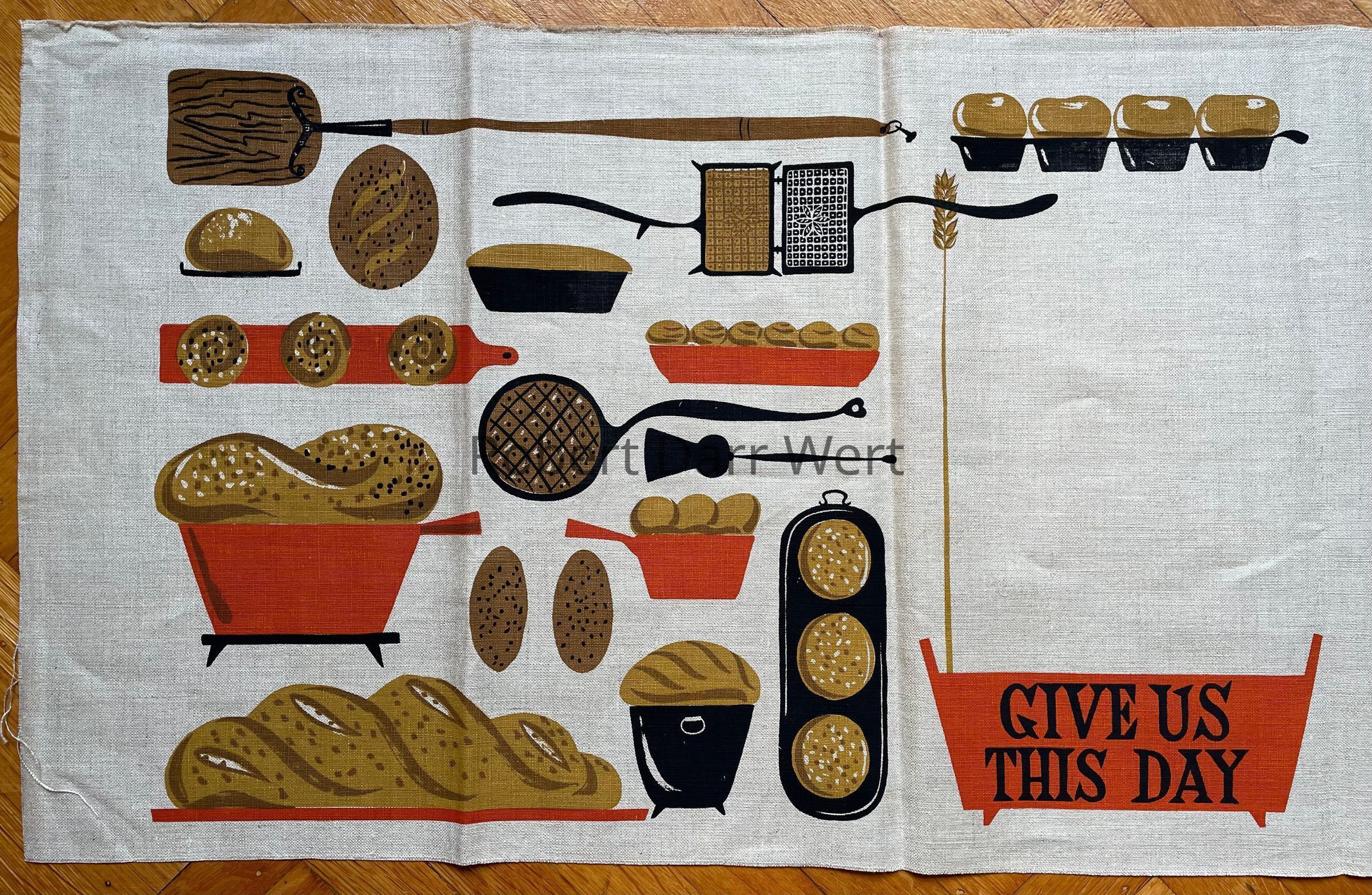 A four-color silkscreen print on natural linen depicting baked breads, wheat stalks, and the tools and implements for baking breads. At lower center, printed on the face of two wooden bins, is a line from the Lord’s Prayer: “Give Us This Day Our Daily Bread”, a recurrent theme in Wert’s work.