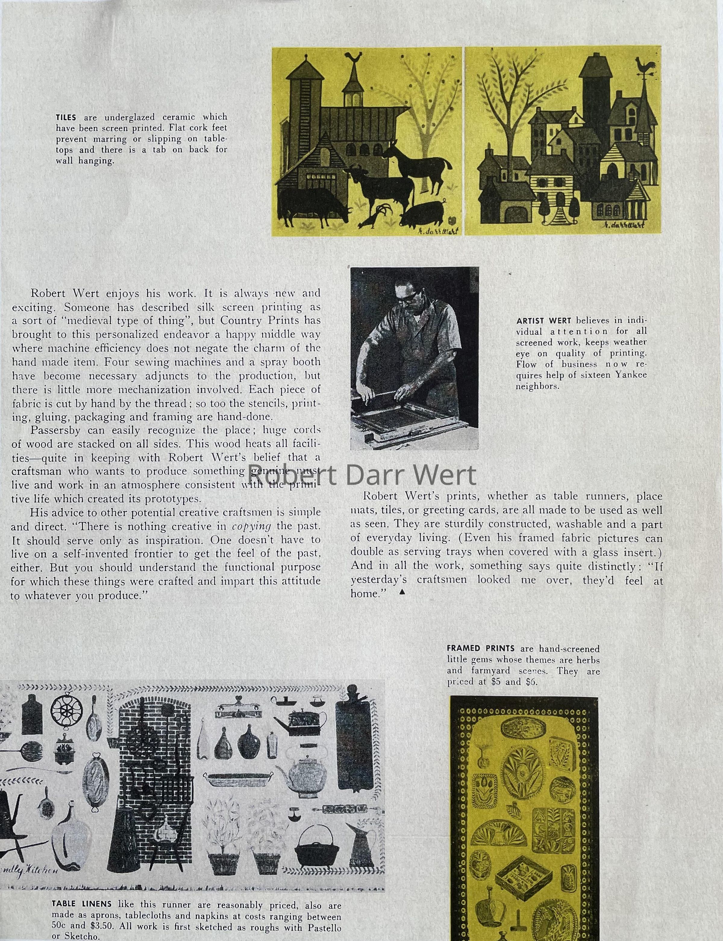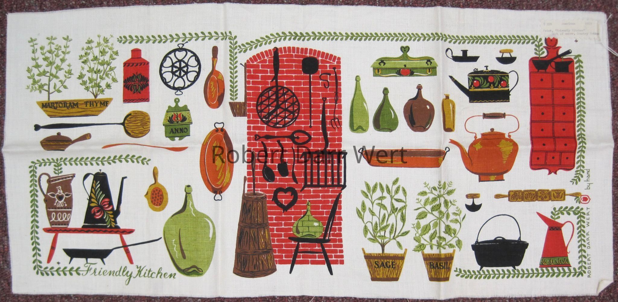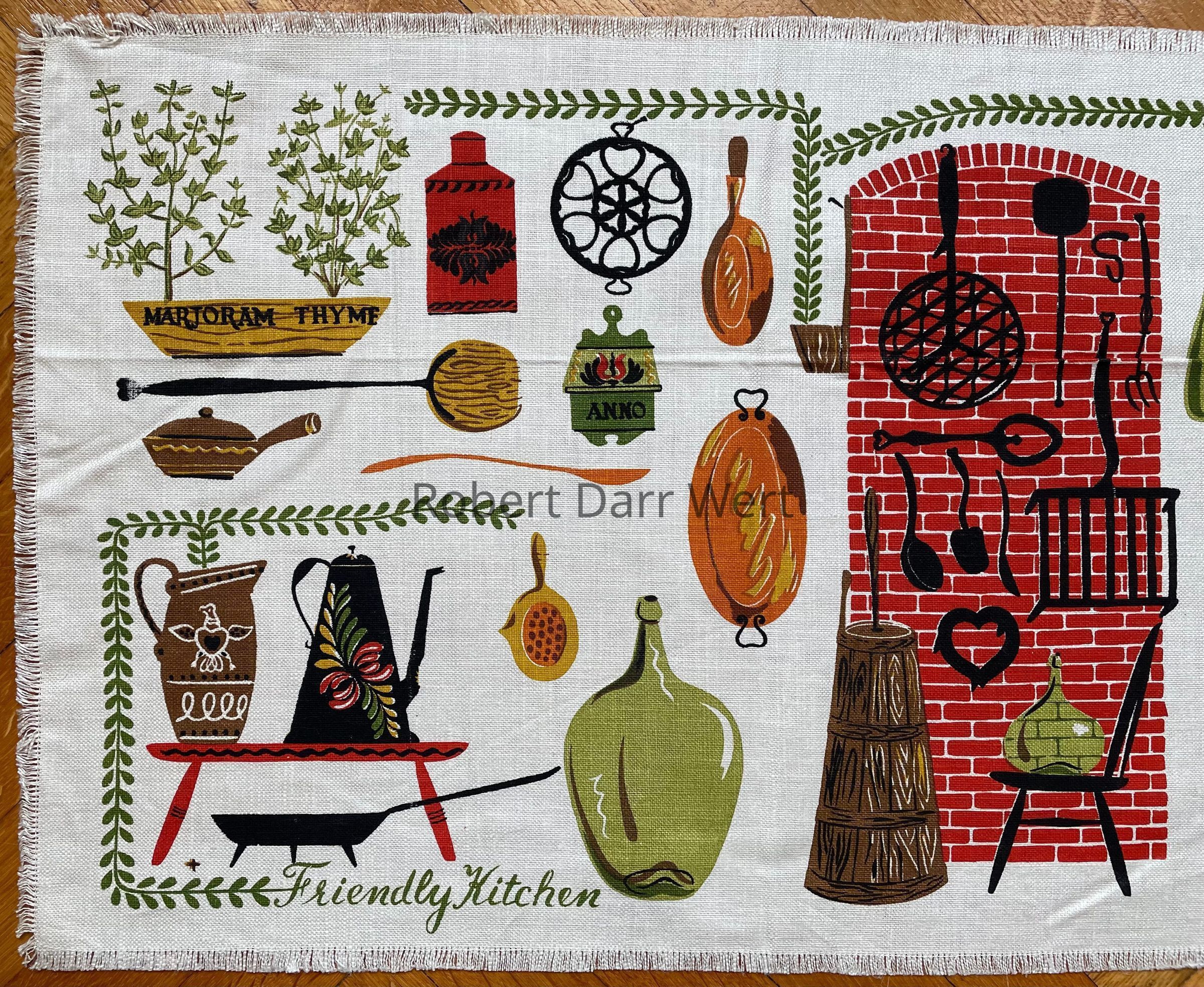 This table runner appears in the c.1953 brochure “Robert Darr Wert/Country Prints Kitchen Hangings”, and in a 1955 article about Robert Darr Wert and Country Prints in the art journal Design; see images. It is also included in The University of Connecticut Historical Costume and Textiles Collection, gift of the artist, 1953; see web link.