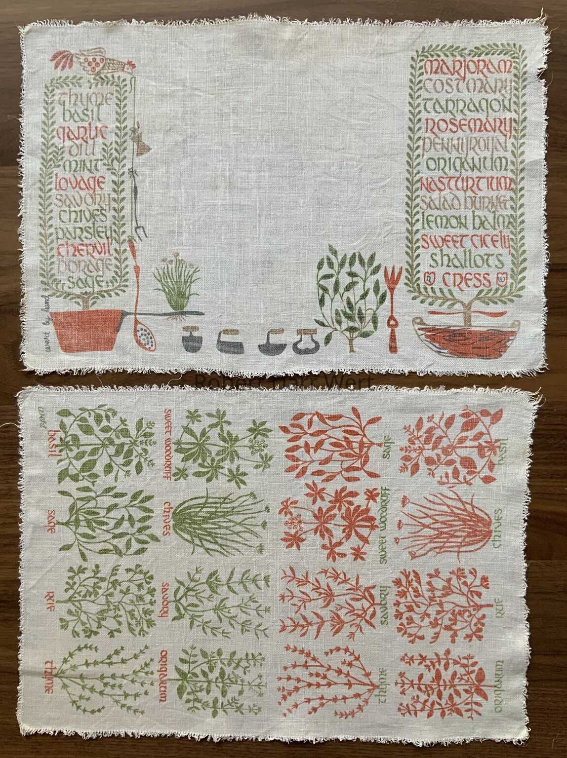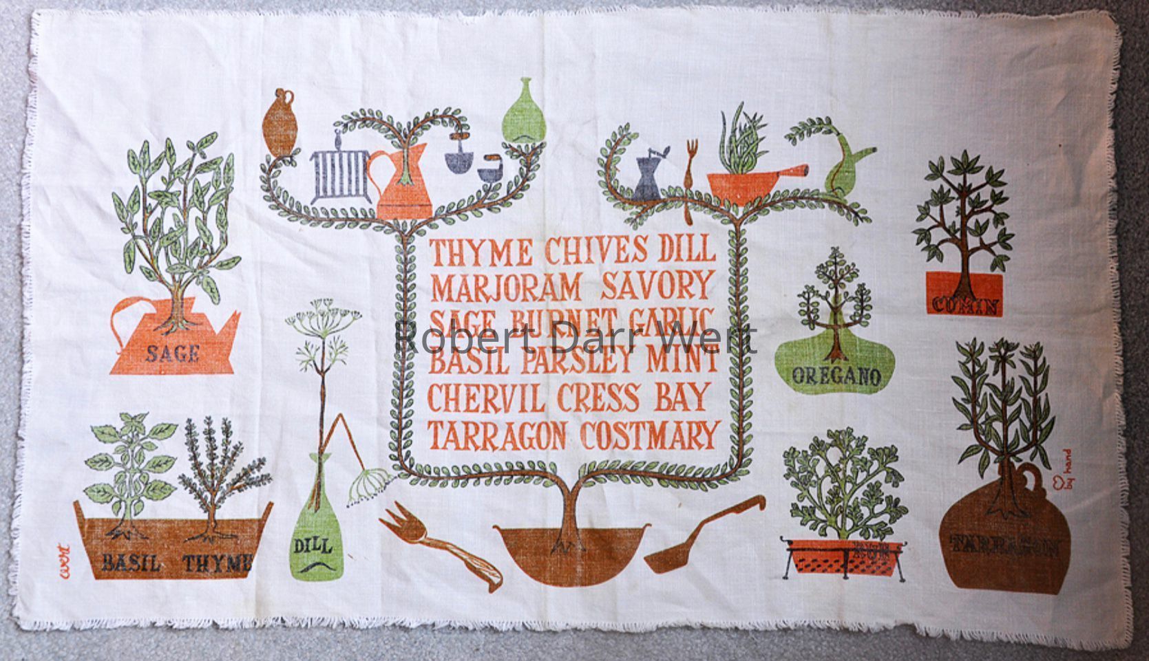 A table runner with a four-color silkscreen print on off-white linen depicting herbs planted in various kitchen vessels of copper, tin, wood and ceramic.