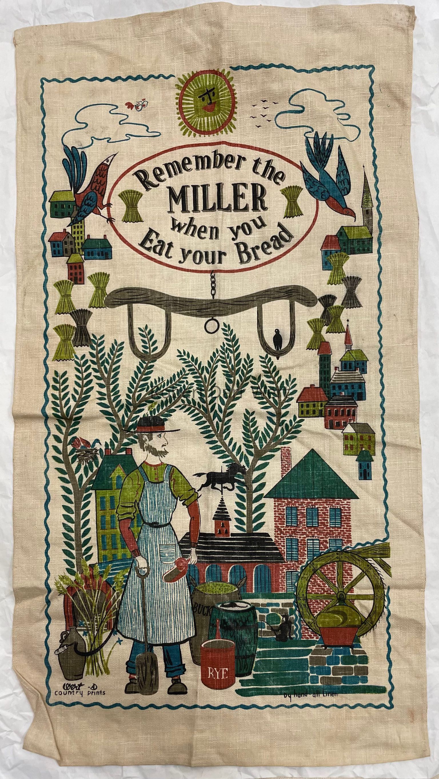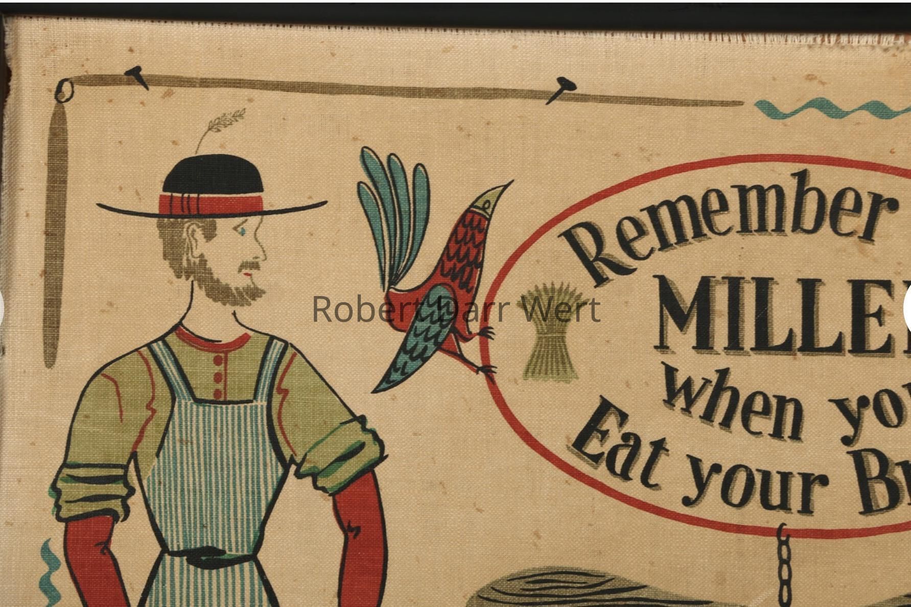 A six-color silkscreen print on off-white linen depicting a miller with barrels of his product set alongside a village with a mill and waterwheel supporting the phrase, “Remember the miller when you eat your bread”. This is a c.1954 update of an earlier design of the same name and number.
