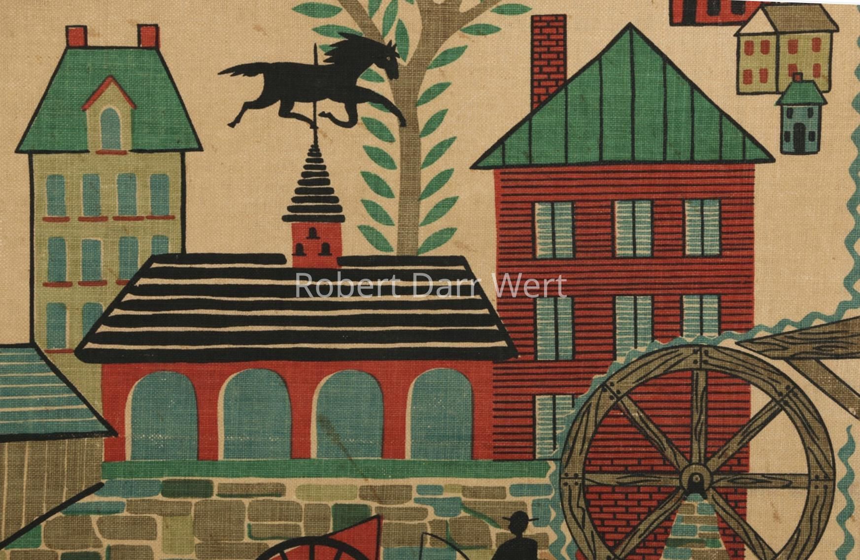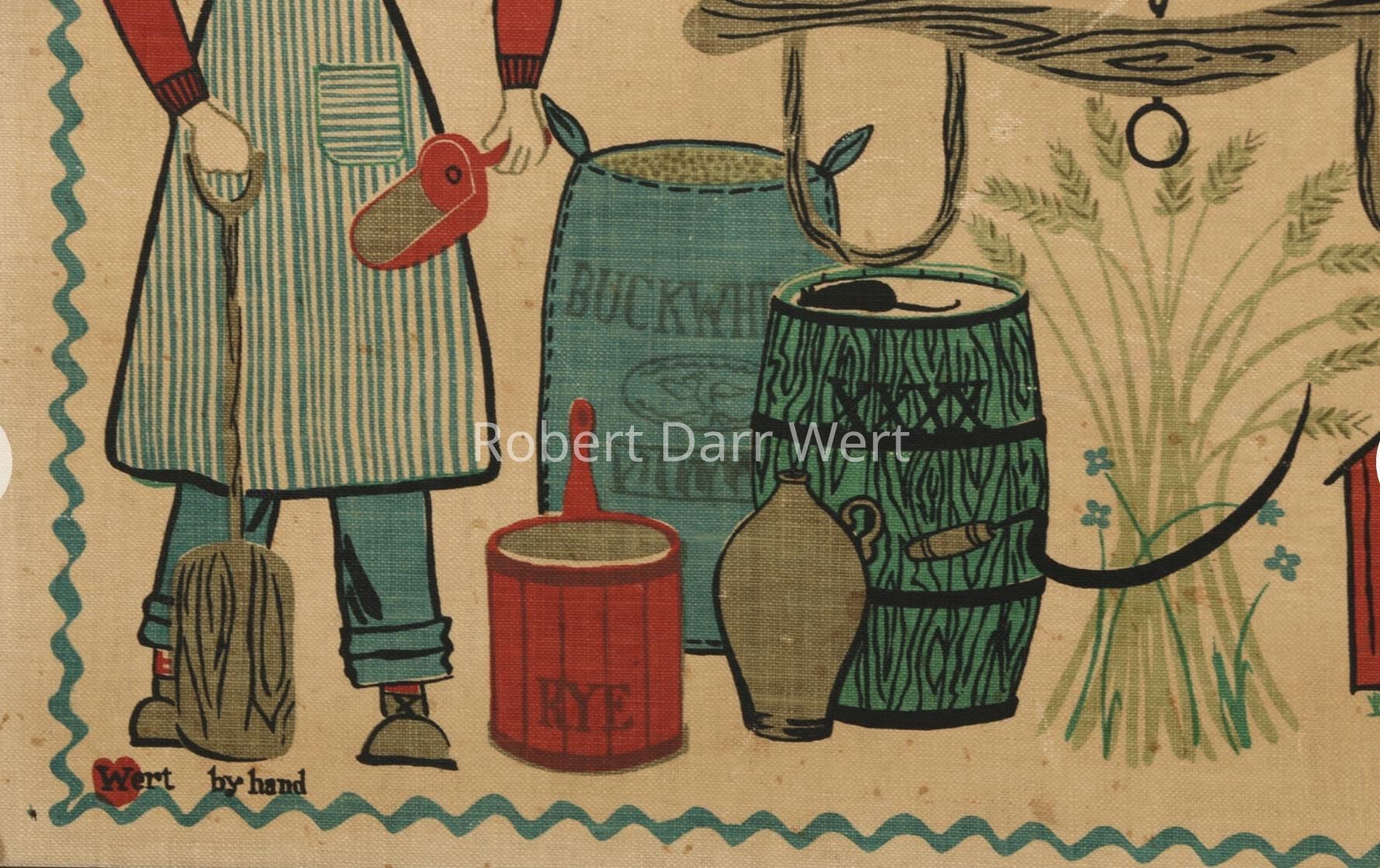This towel/wallhanging/runner appears in the c.1954 brochure “Robert Darr Wert/Country Prints Kitchen Hangings”; see images.