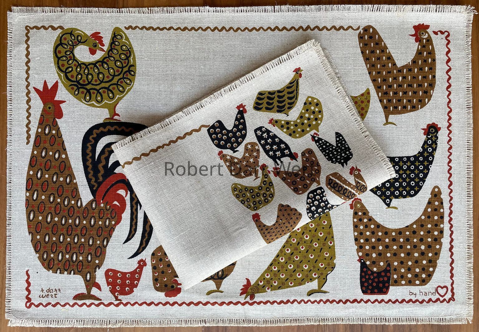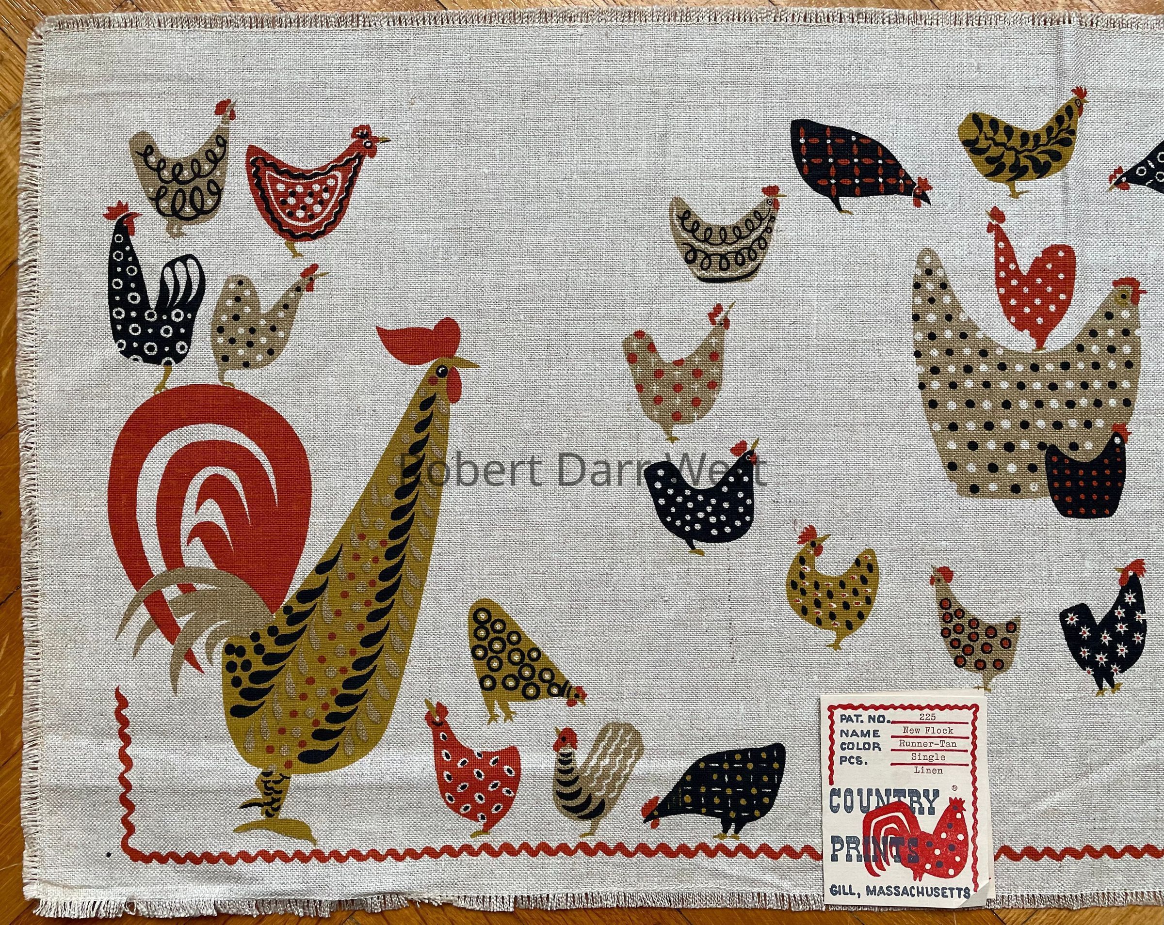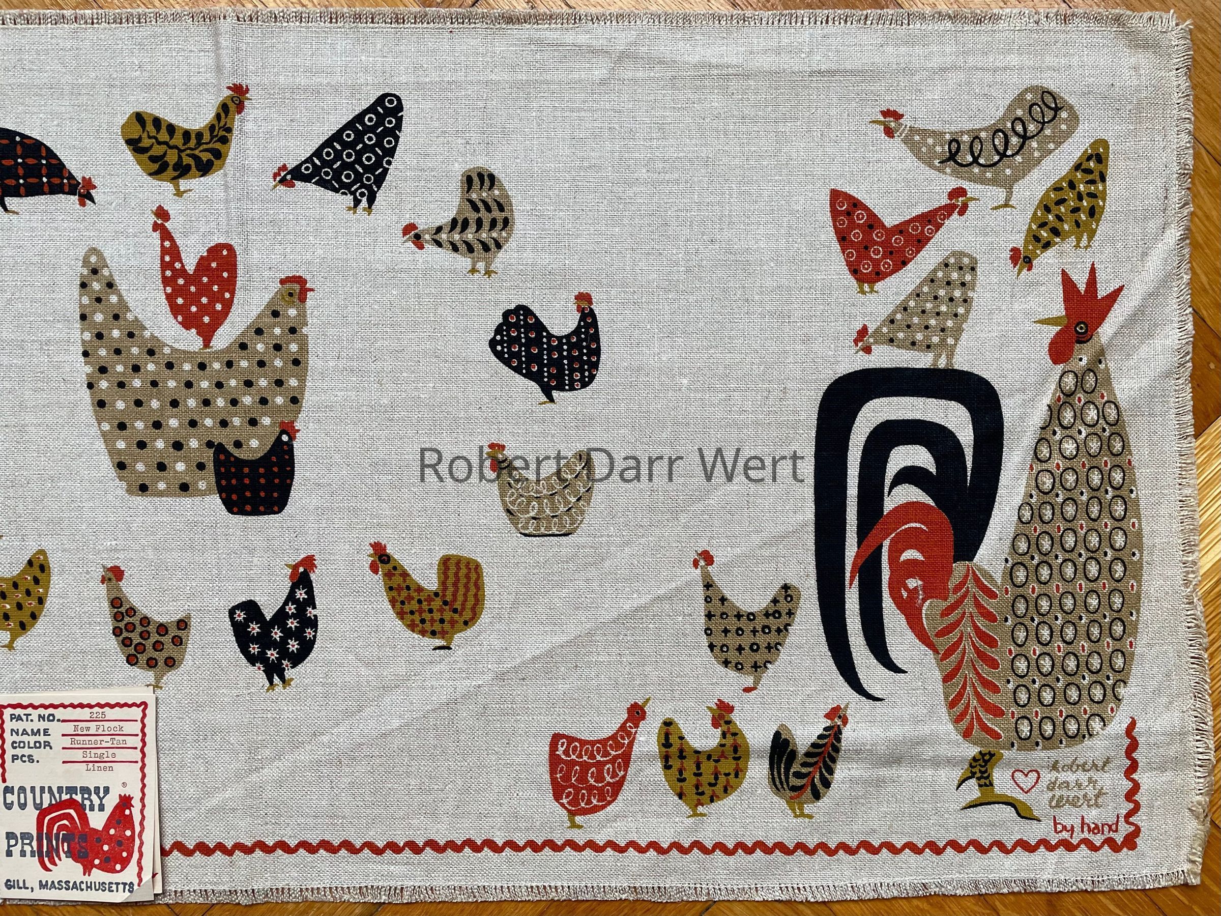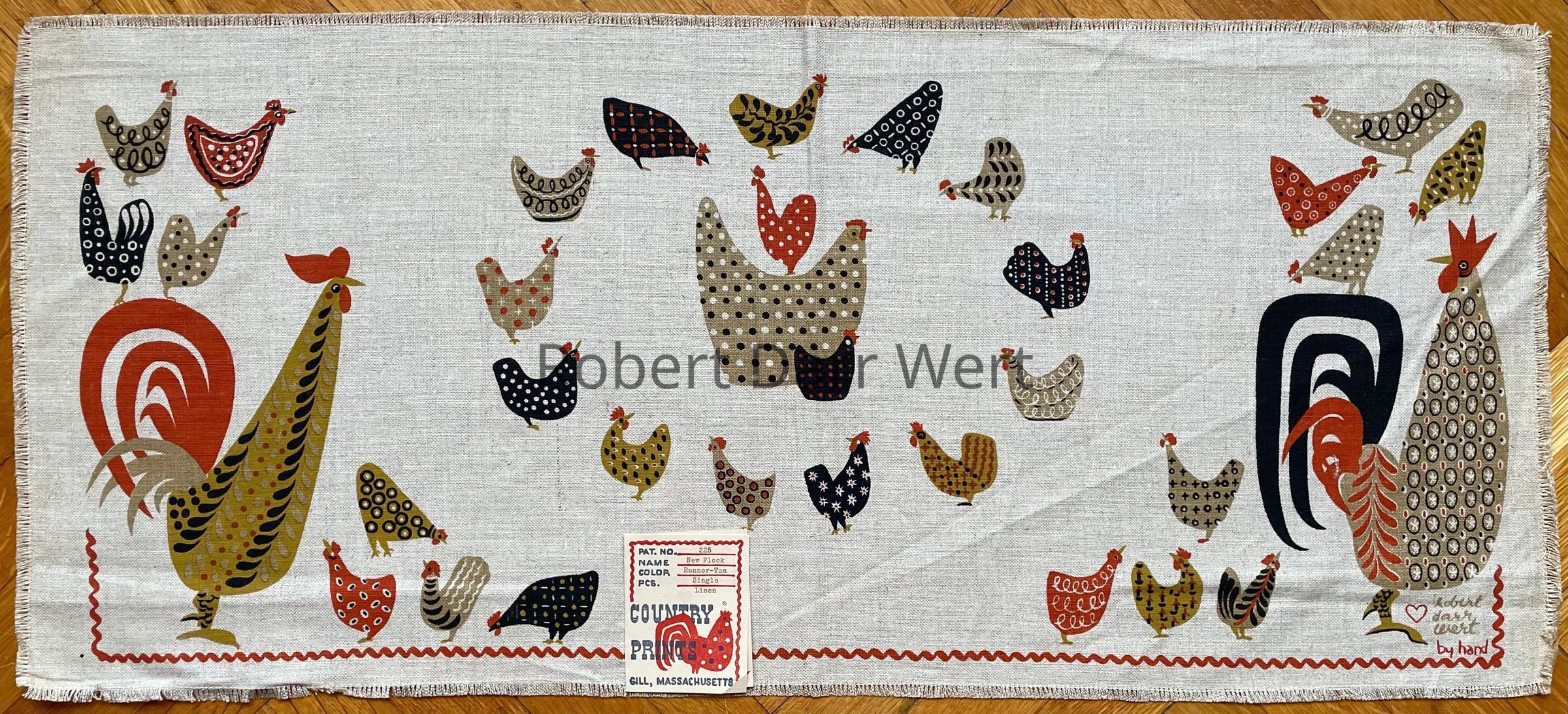 A table runner with a four-color silkscreen print on natural linen depicting thirty-four roosters and hens scattered across an imaginary farmyard. Roosters watch over their flock from the lower right and left corners. All birds are superimposed with Wert’s interpretation of calico print patterns.