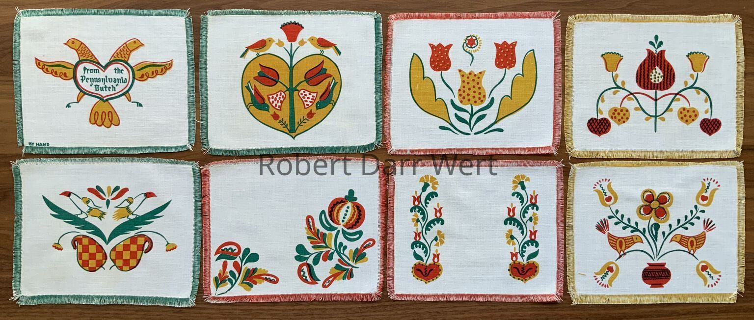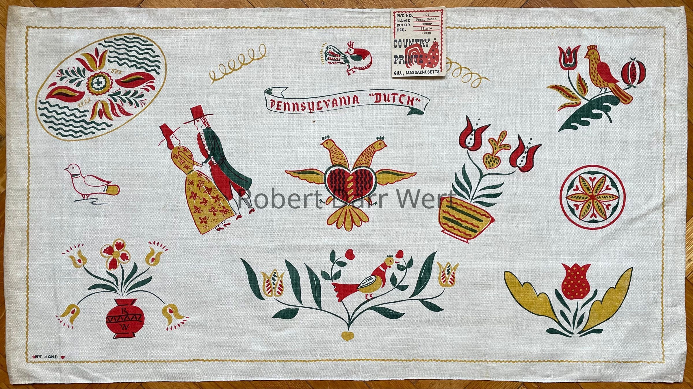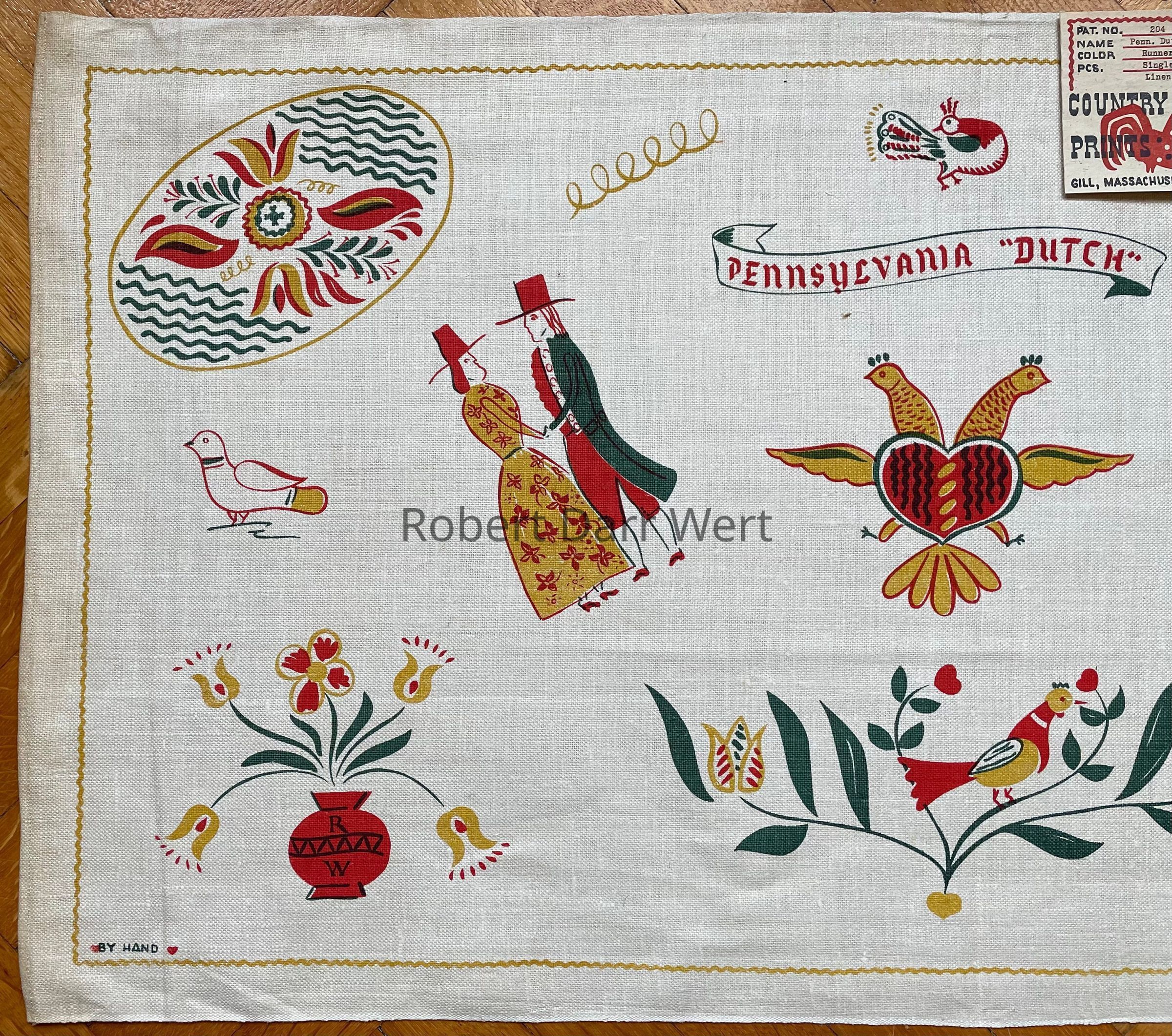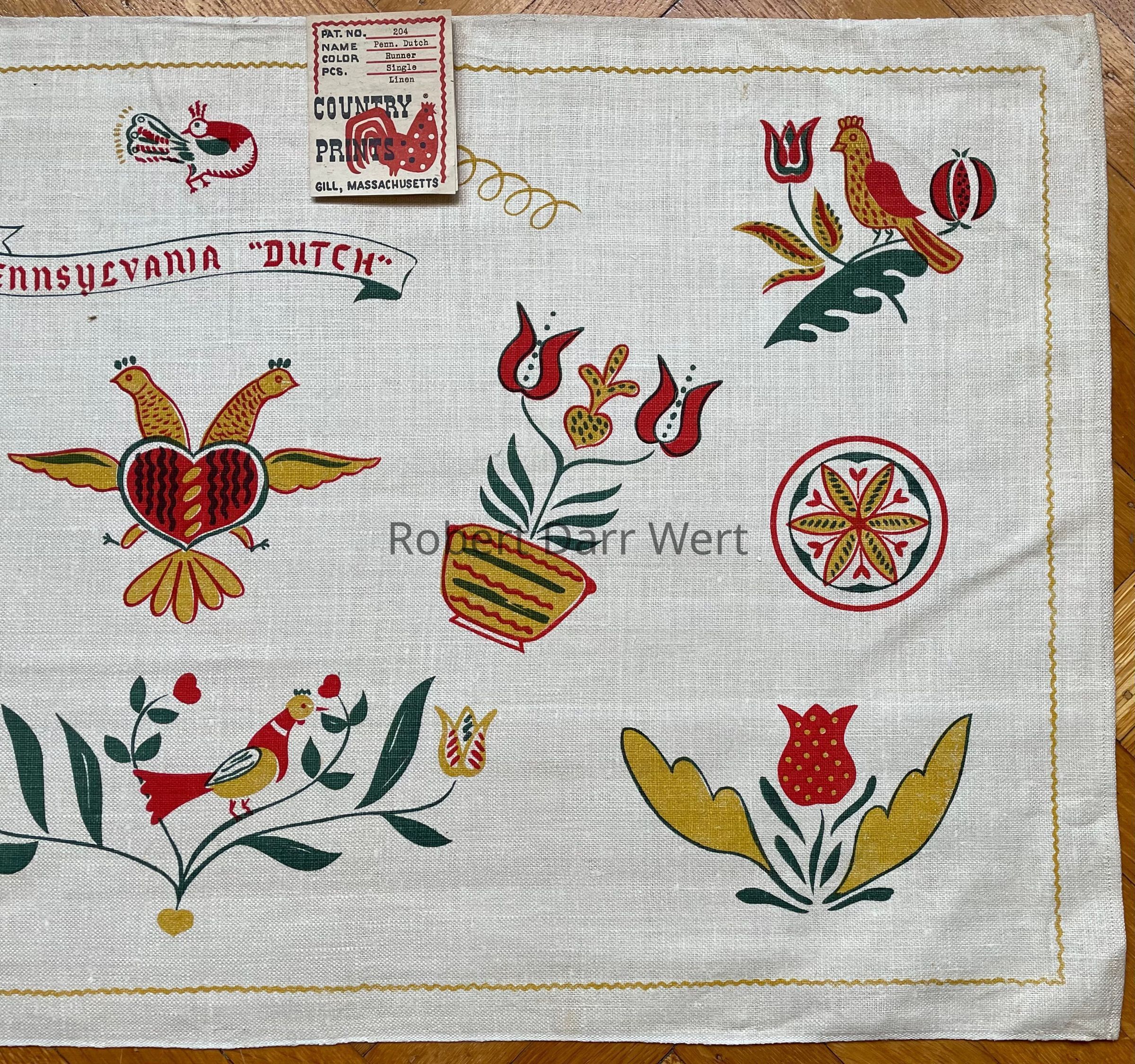 A towel/wallhanging/runner with a three-color silkscreen print on off-white linen depicting Wert’s interpretation of Pennsylvania “Dutch” folk art motifs.