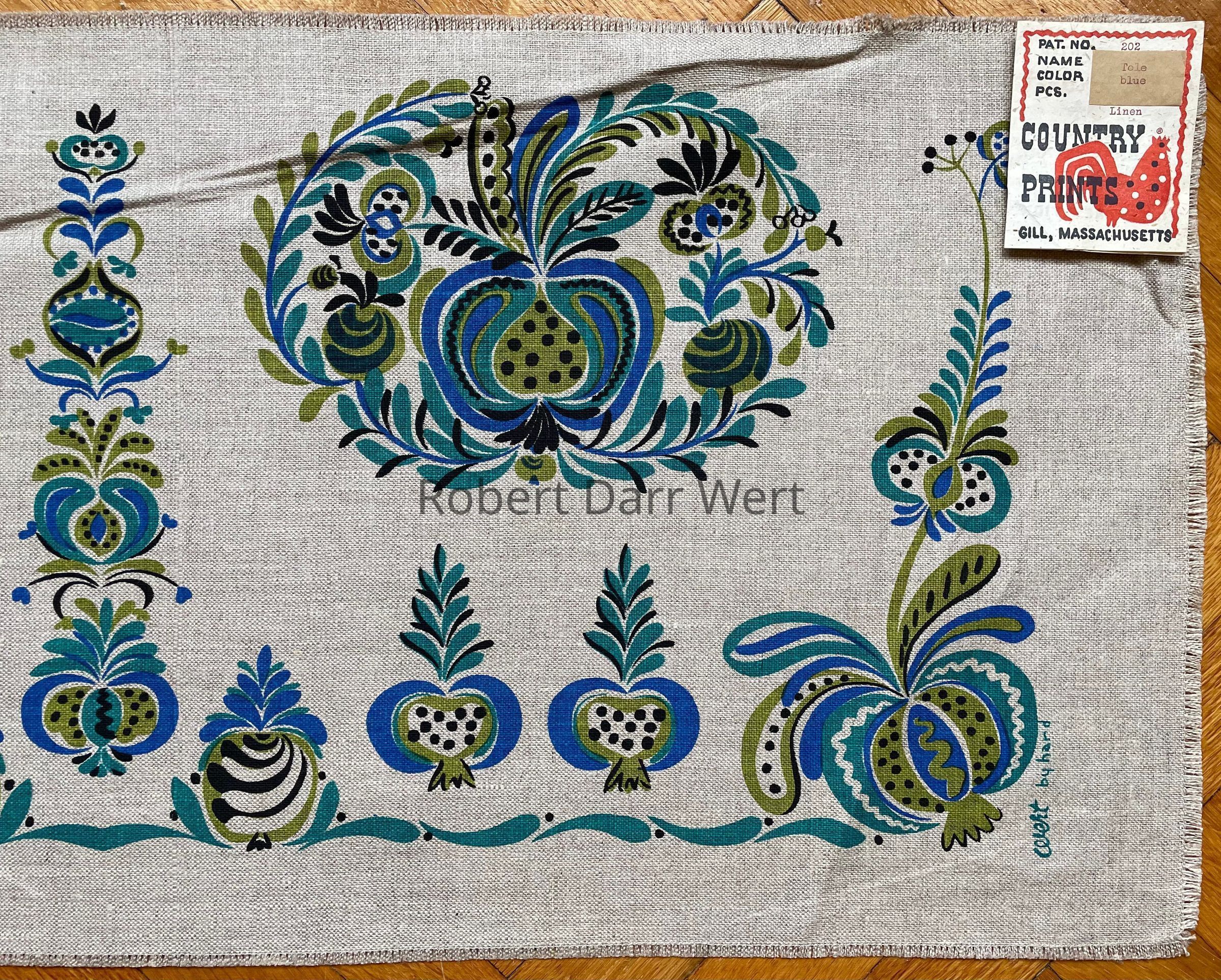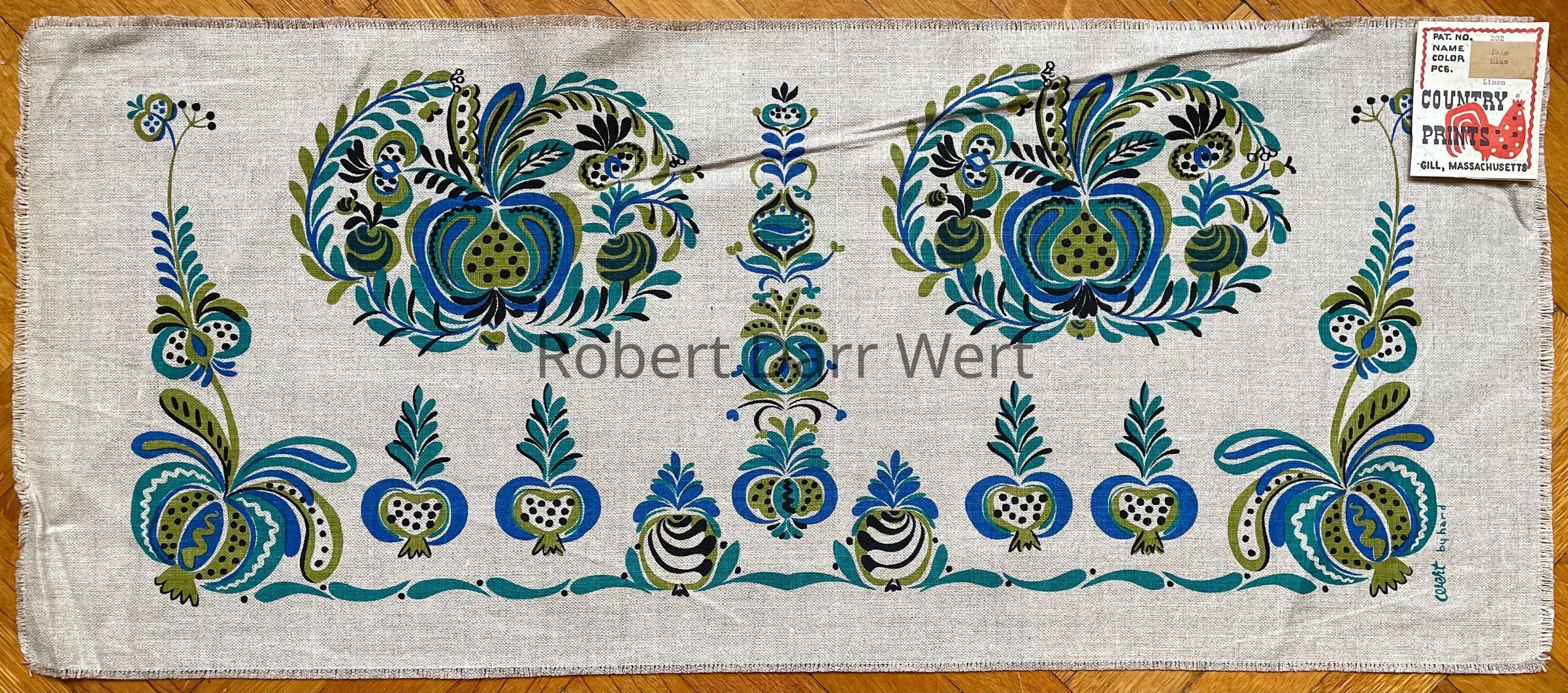 This runner is listed on the January 1960 Country Prints price list in three colorways (pink, blue, or green), and appears in the c.1960 brochure “Mat Sets by Robert Darr Wert/Country Prints”; see images.
