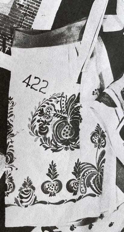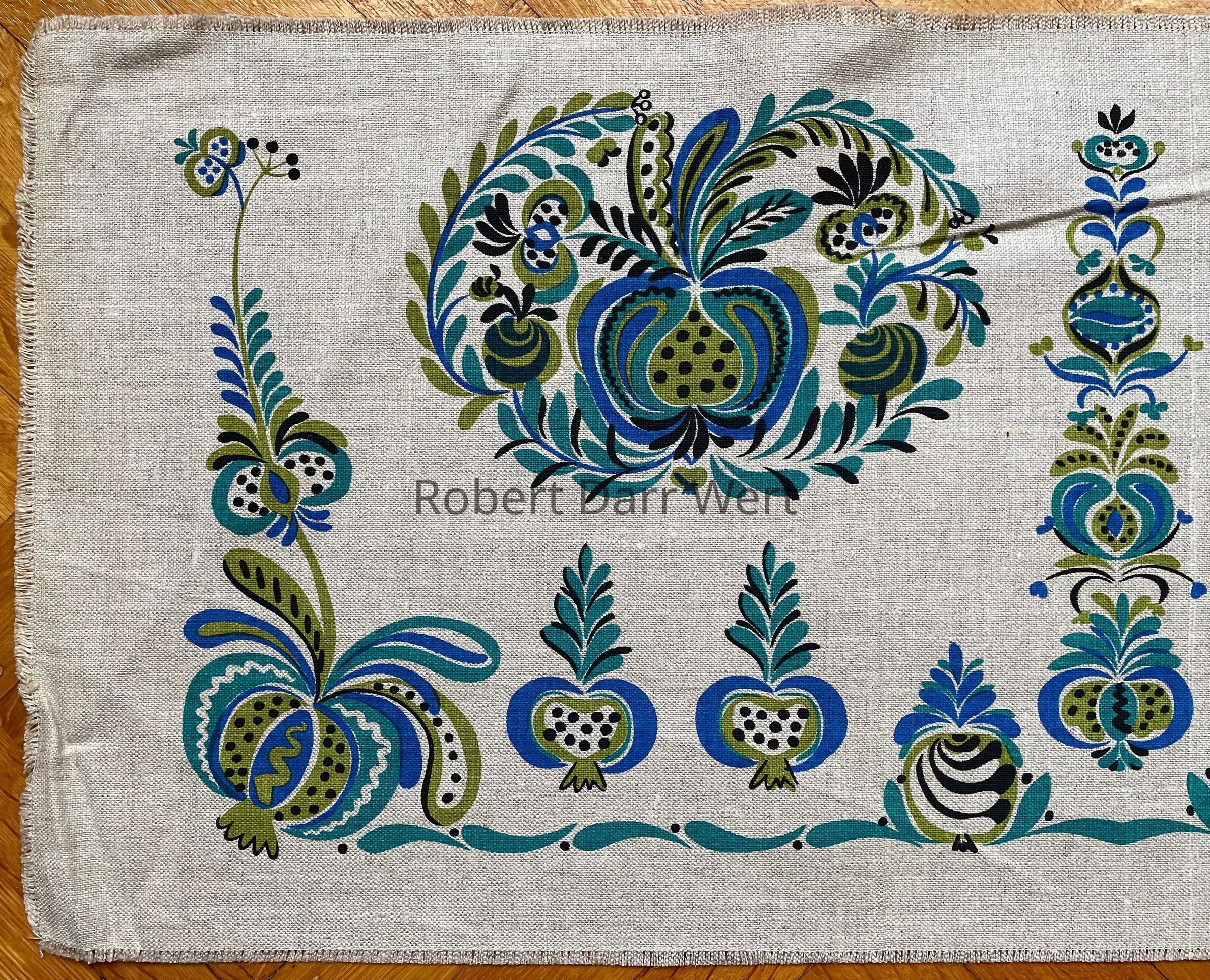 A four-color silkscreen print on natural linen depicting design motifs typically found on painted tin, or toleware.