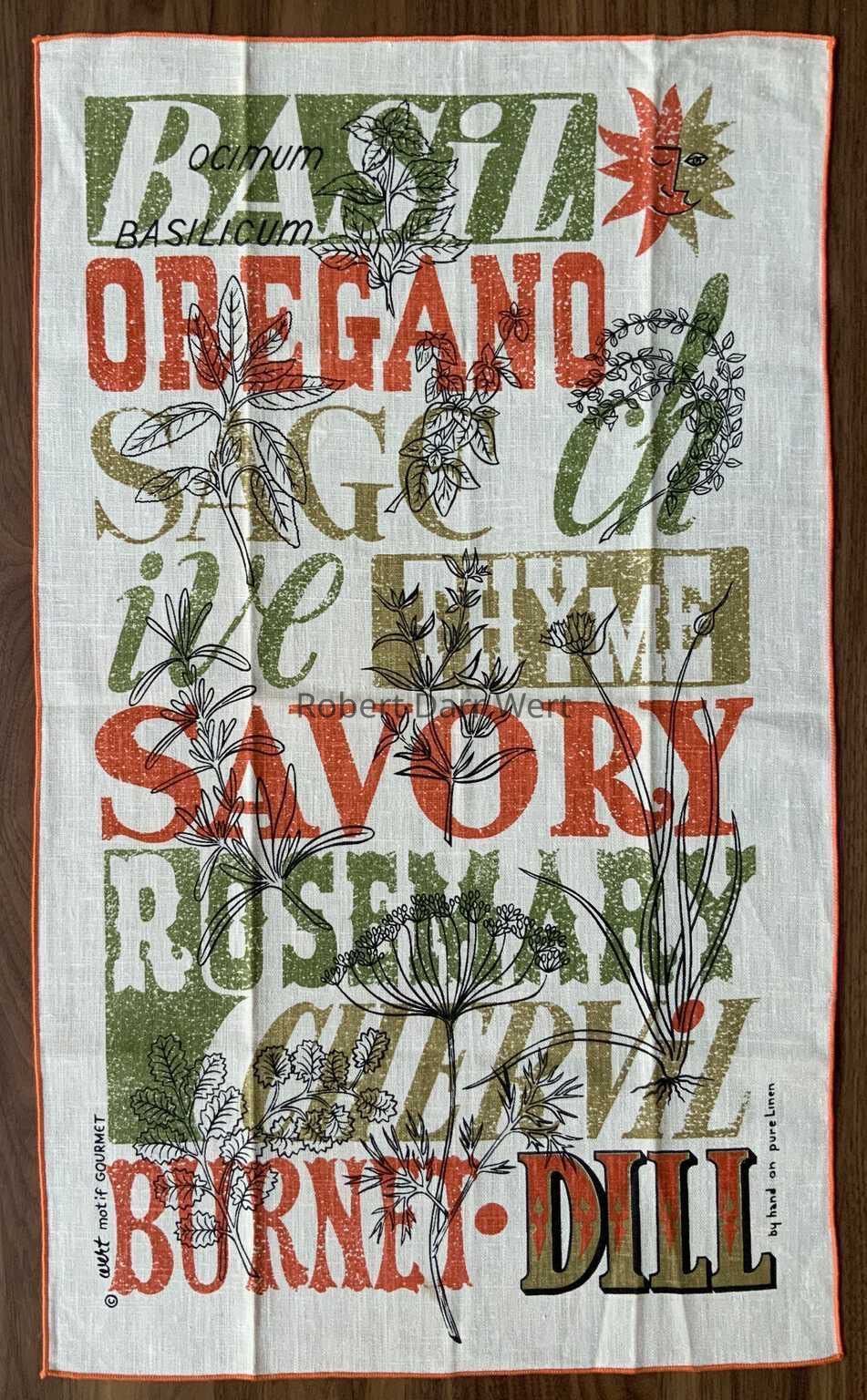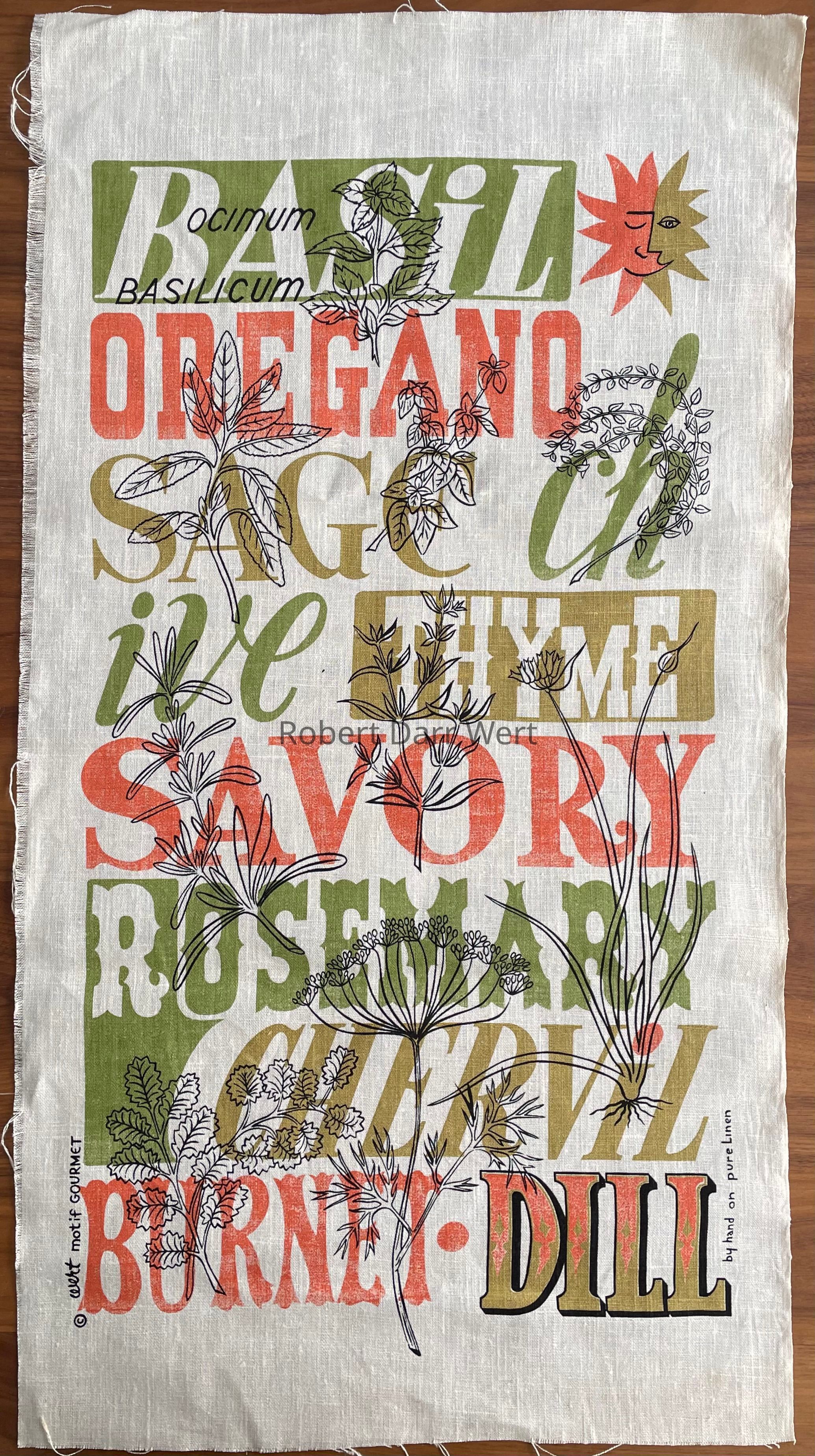 Two strike-offs of the Motif Gourmet towel Herbs 280 in orange. The four-color printing of the strike-offs is nearly identical to later production examples. The colors are true to the final prints, however the green and orange areas lack the mottling added to the production pieces; see last image.Made/Created