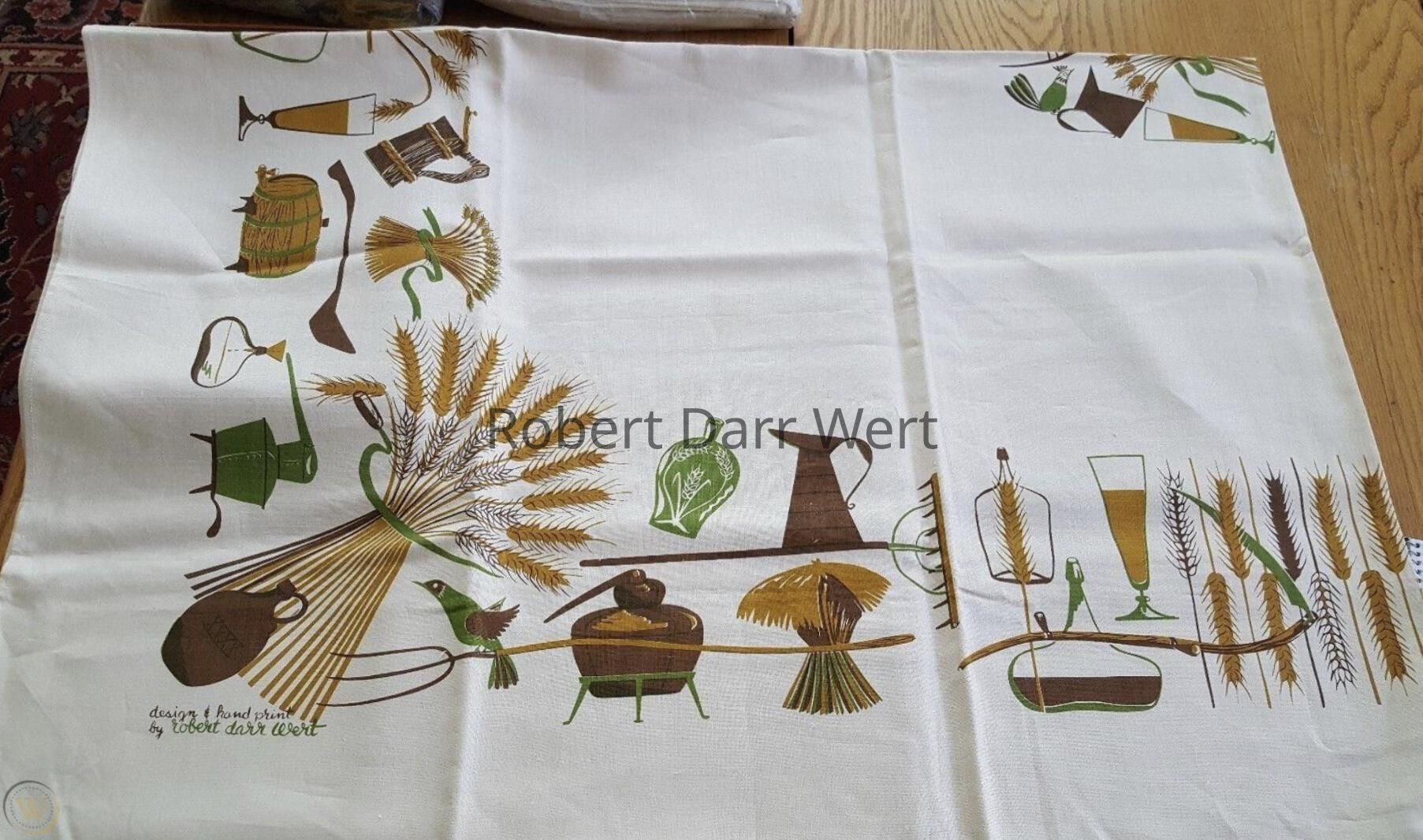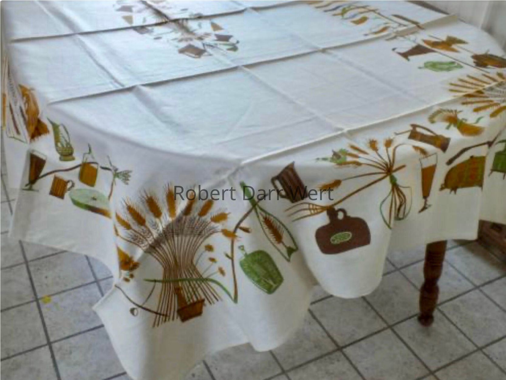 A tablecloth with a three-color silkscreen print on off-white linen depicting wheat, harvest tools, and the tools for making and serving alcohol.Made/Created