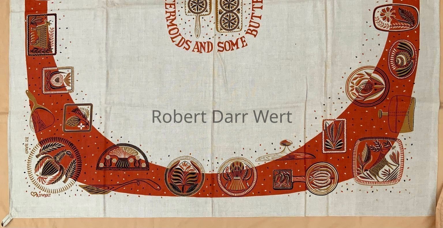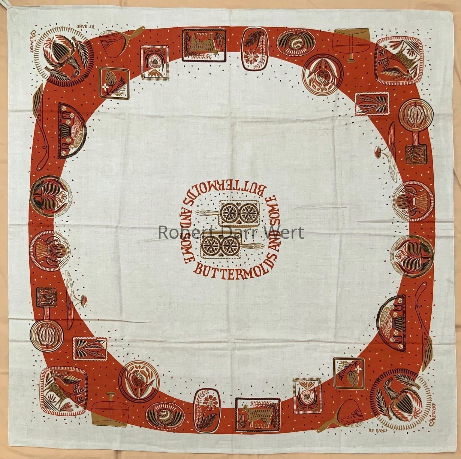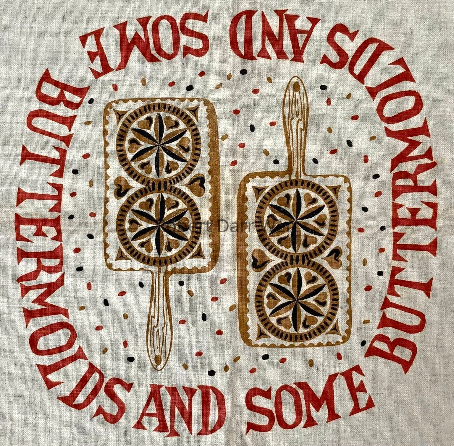 A tablecloth with a three-color silkscreen print on natural linen depicting numerous carved wood buttermolds set amongst brick red border. At center is a medallion framed with the repeating phrase, “SOME BUTTERMOLDS AND SOME BUTTERMOLDS…”.