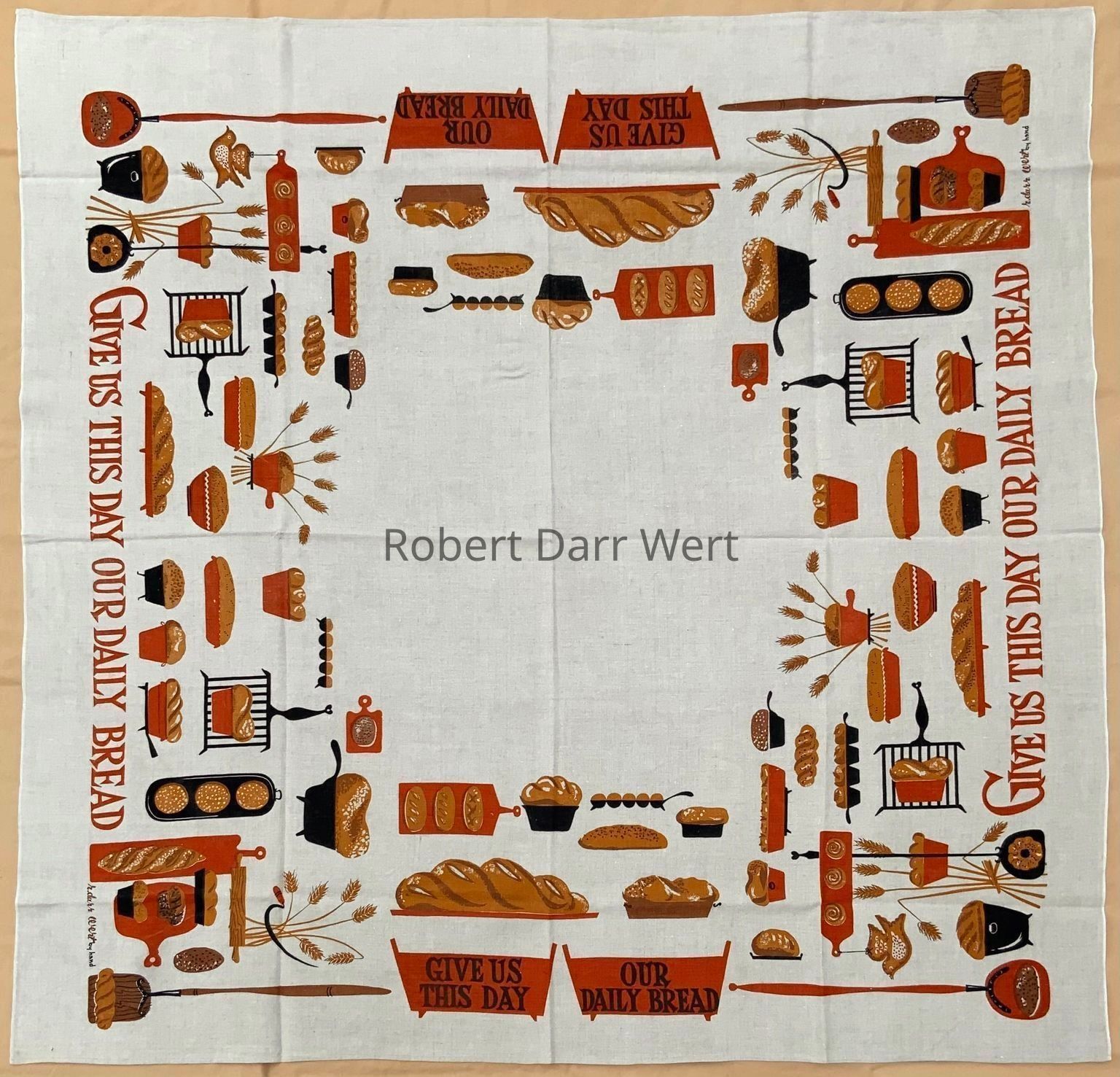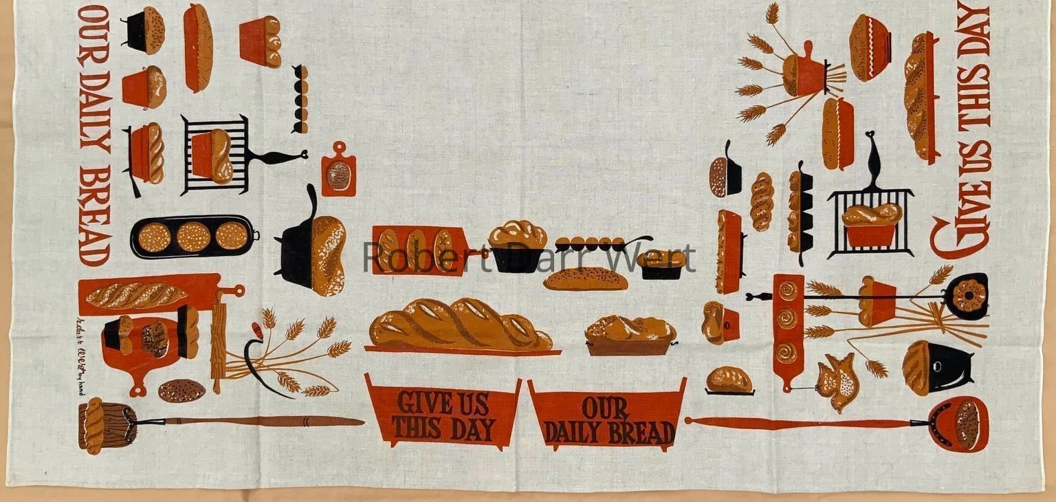 A tablecloth with a four-color silkscreen print on natural linen depicting numerous types of breads and baking implements supporting the phrase from the Lord’s Prayer, “Give us this day our daily bread”.