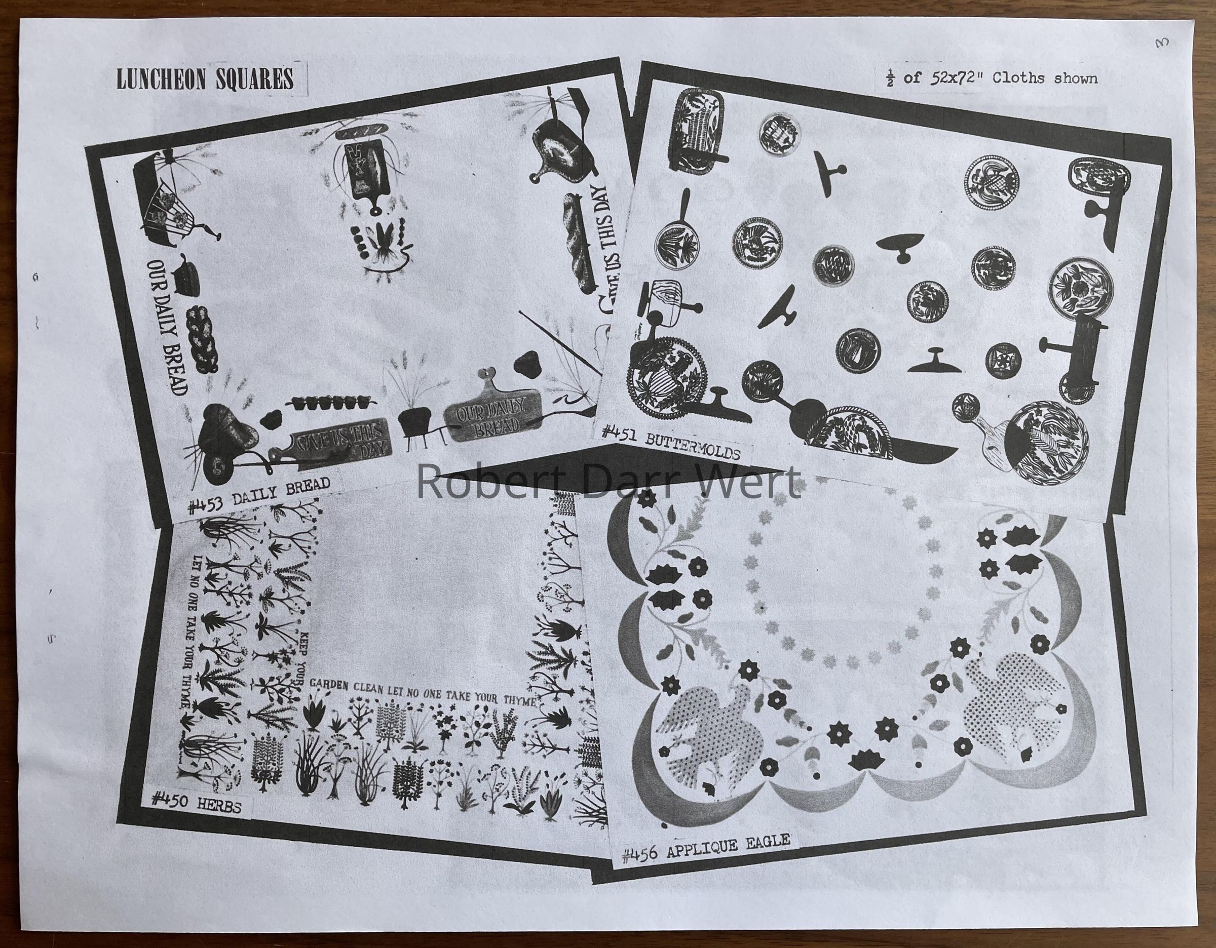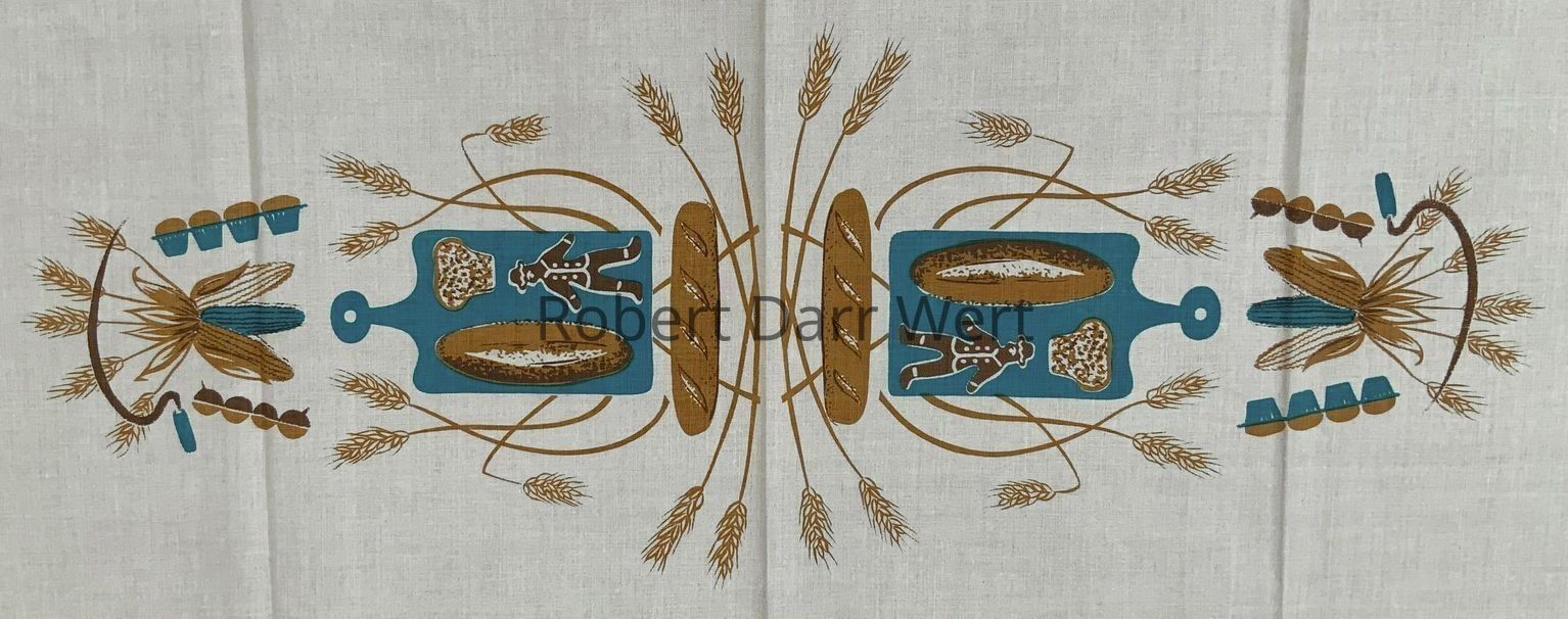 This tablecloth is listed in the January 1960 Country Prints price list in two sizes (52” x 52”, 52” x 72”), and two colorways (brick red or blue). It appears in the brochure “Mat Sets by Robert Darr Wert/Country Prints”, c.1960.