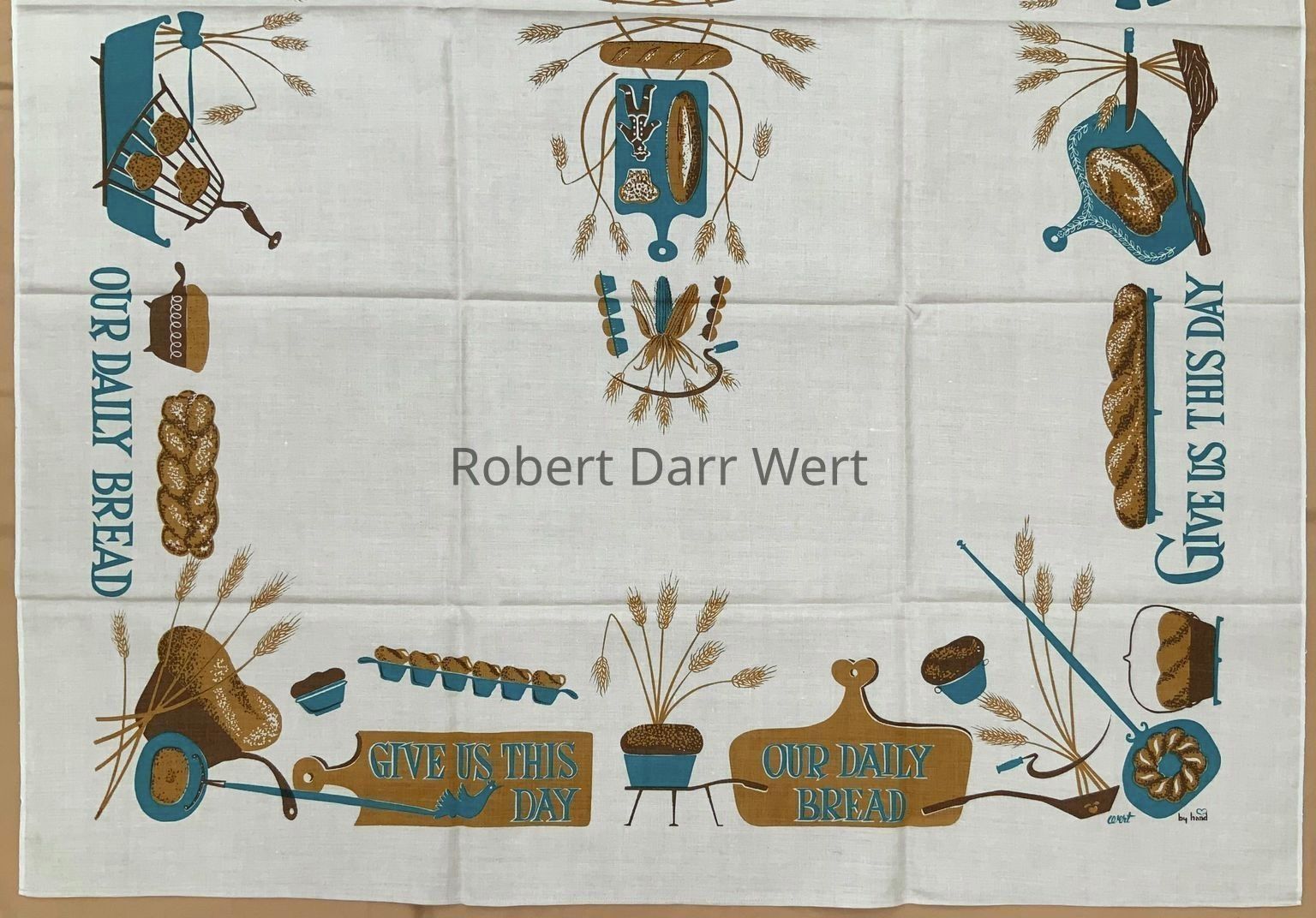 A tablecloth with a three-color silkscreen print on natural linen depicting numerous types of bread and baking implements supporting the phrase from the Lord’s Prayer, “Give us this day our daily bread”.