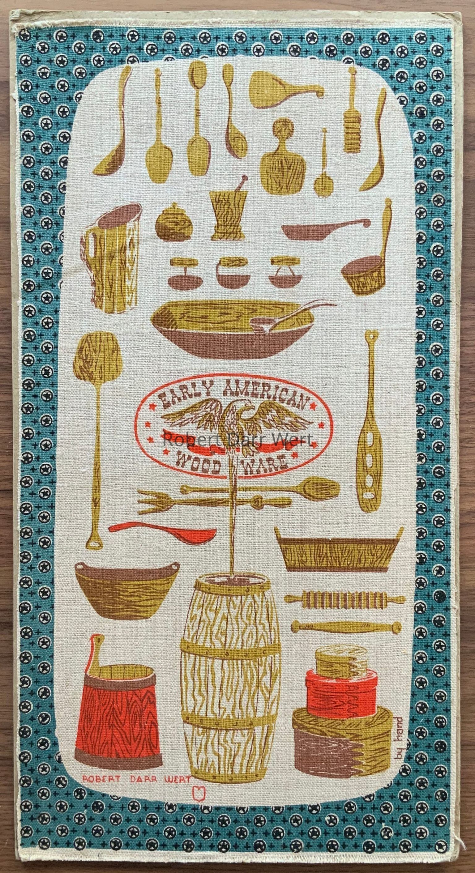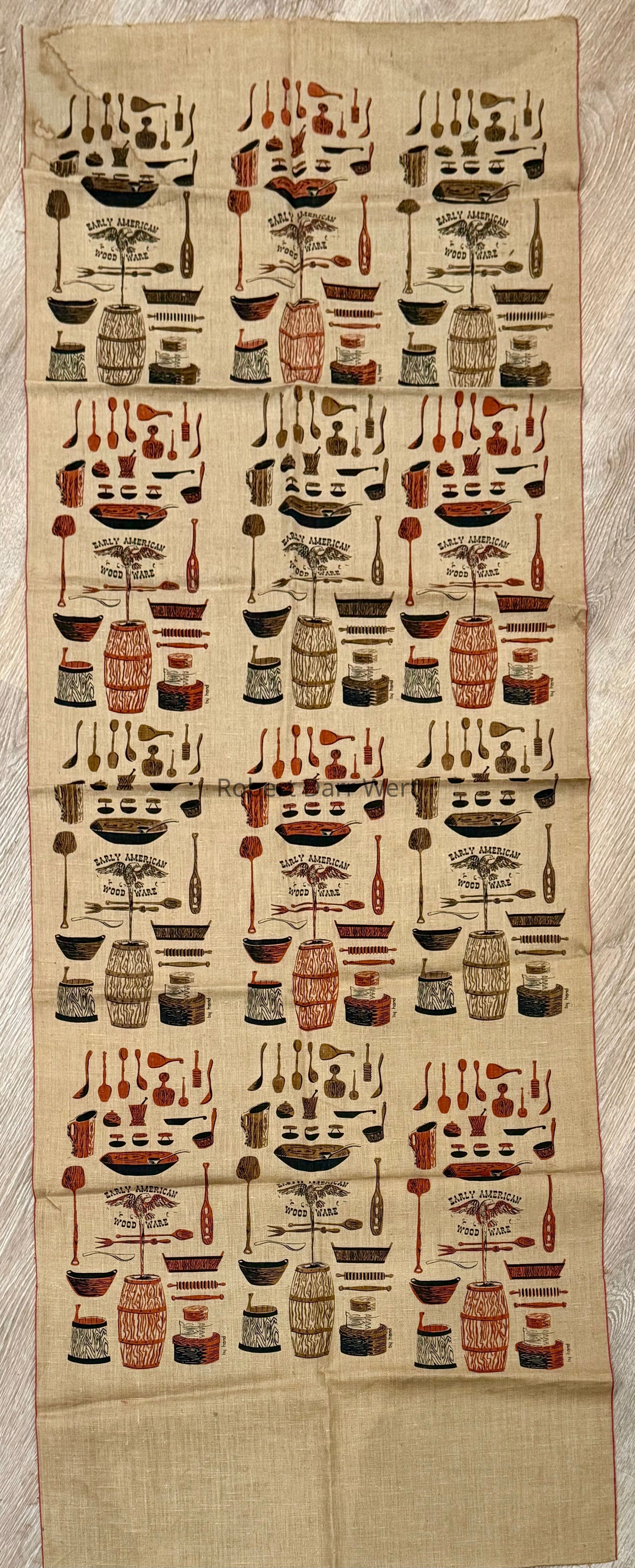 A four color silkscreen print on natural linen depicting early American woodenware goods in repeat. The print name, “Early American Wood Ware”, appears at the center of each repeat. The repeat is borrowed from an early 1950’s Country Prints framed print titled “Wood Ware”, but is reinterpreted without the original calico print border; see images for comparison.
