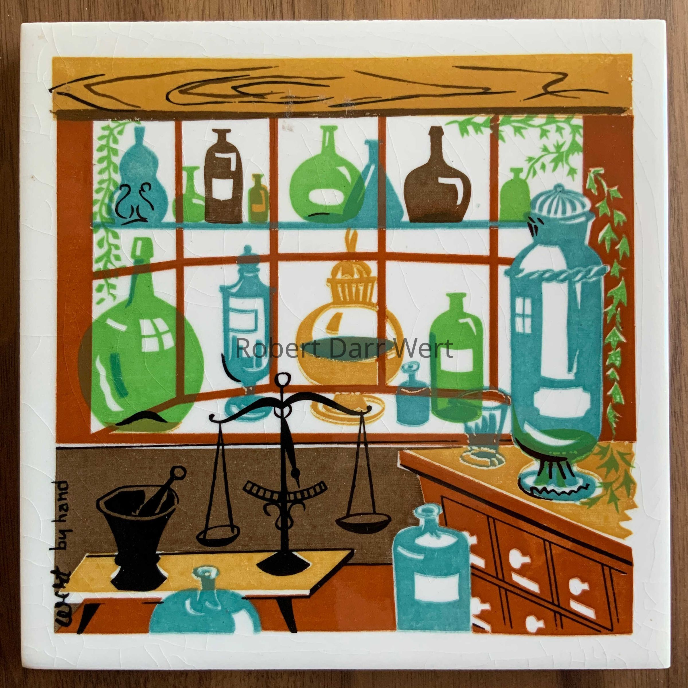 A six-color silkscreen underglaze print on a white tile blank depicting an apothecary shop interior, looking outward through a large bay window. The shop is outfitted with a table holding a scale and mortar and pestle, a counter with labeled drawers below, and numerous blown and molded glass vessels. Vines trail around the bay window and counter.