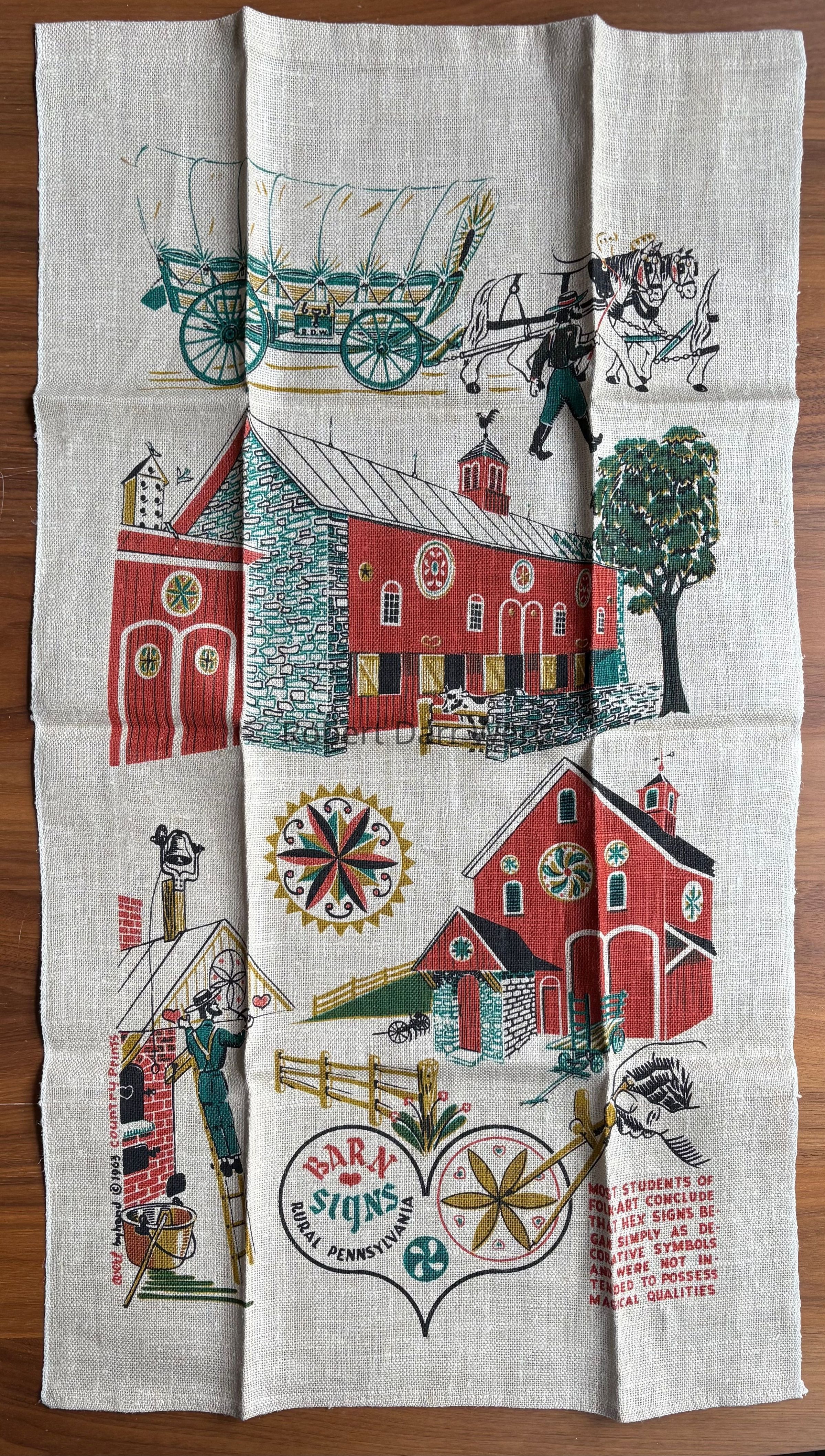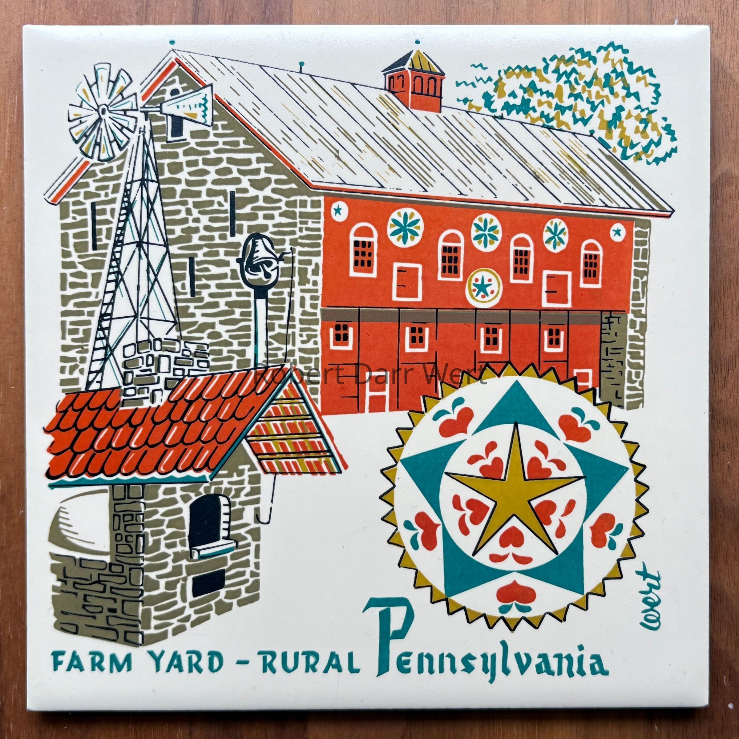 A five-color silkscreen overglaze print on a white glazed tile blank depicting a stone-ender barn with numerous hex signs, a windmill for drawing water, and an outdoor bread oven, in support of the text, “Farm Yard - Rural Pennsylvania”. A matching towel/wallhanging was also produced; see images. These items were available singly or in matched gift sets.