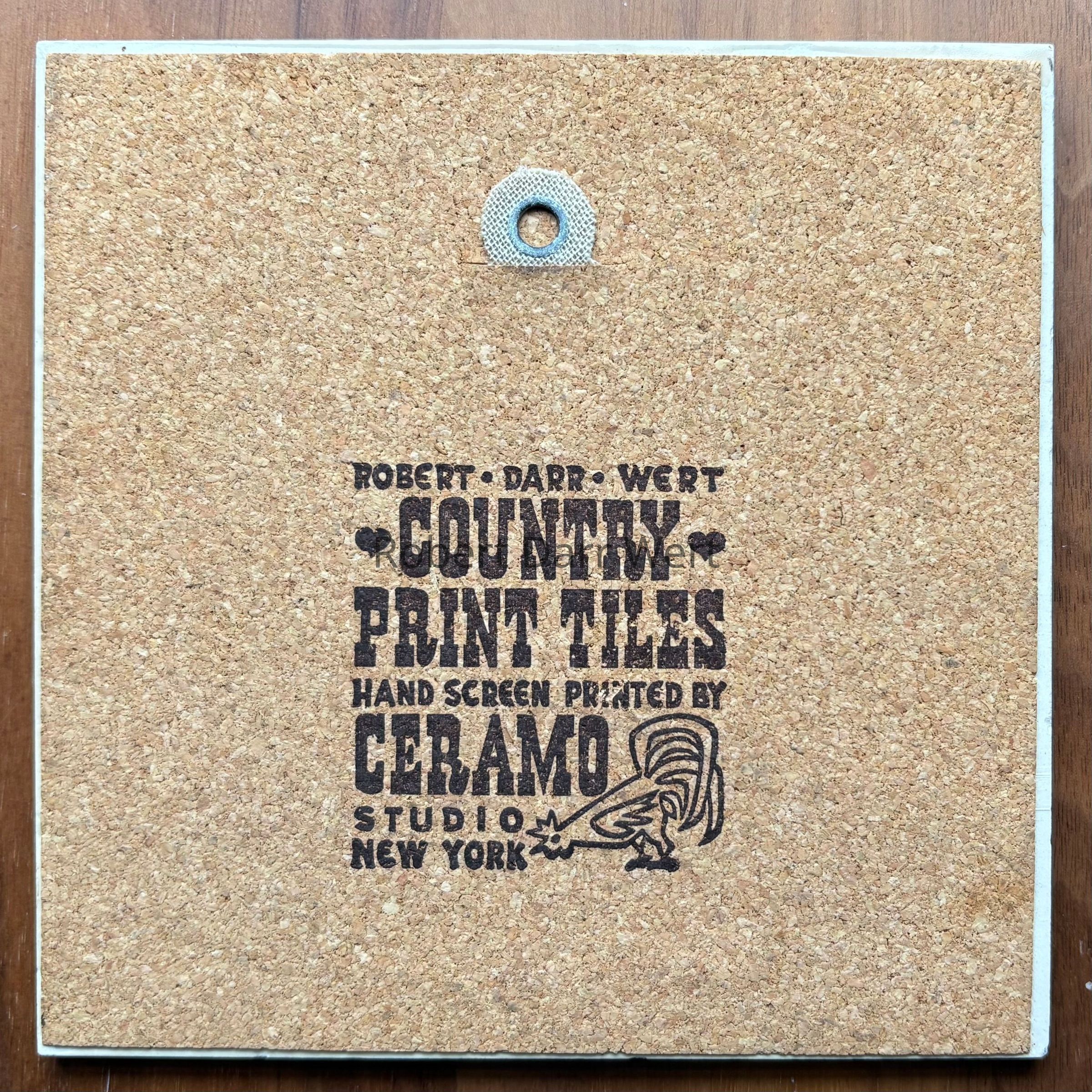 This design is printed on the thinner tile body used by Country Prints/Ceramo Studio from 1962 onward. Design, screen production, and mixing of colored overglazes performed at the Country Prints workshop, Gill, MA. Screen printing of overglaze colors, firing and finishing by Ceramo Studio, NYC.