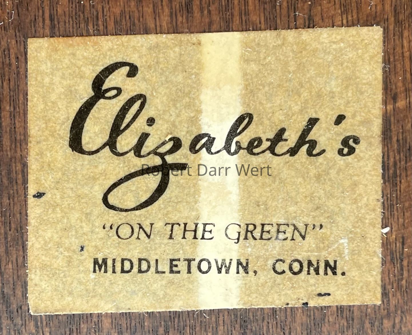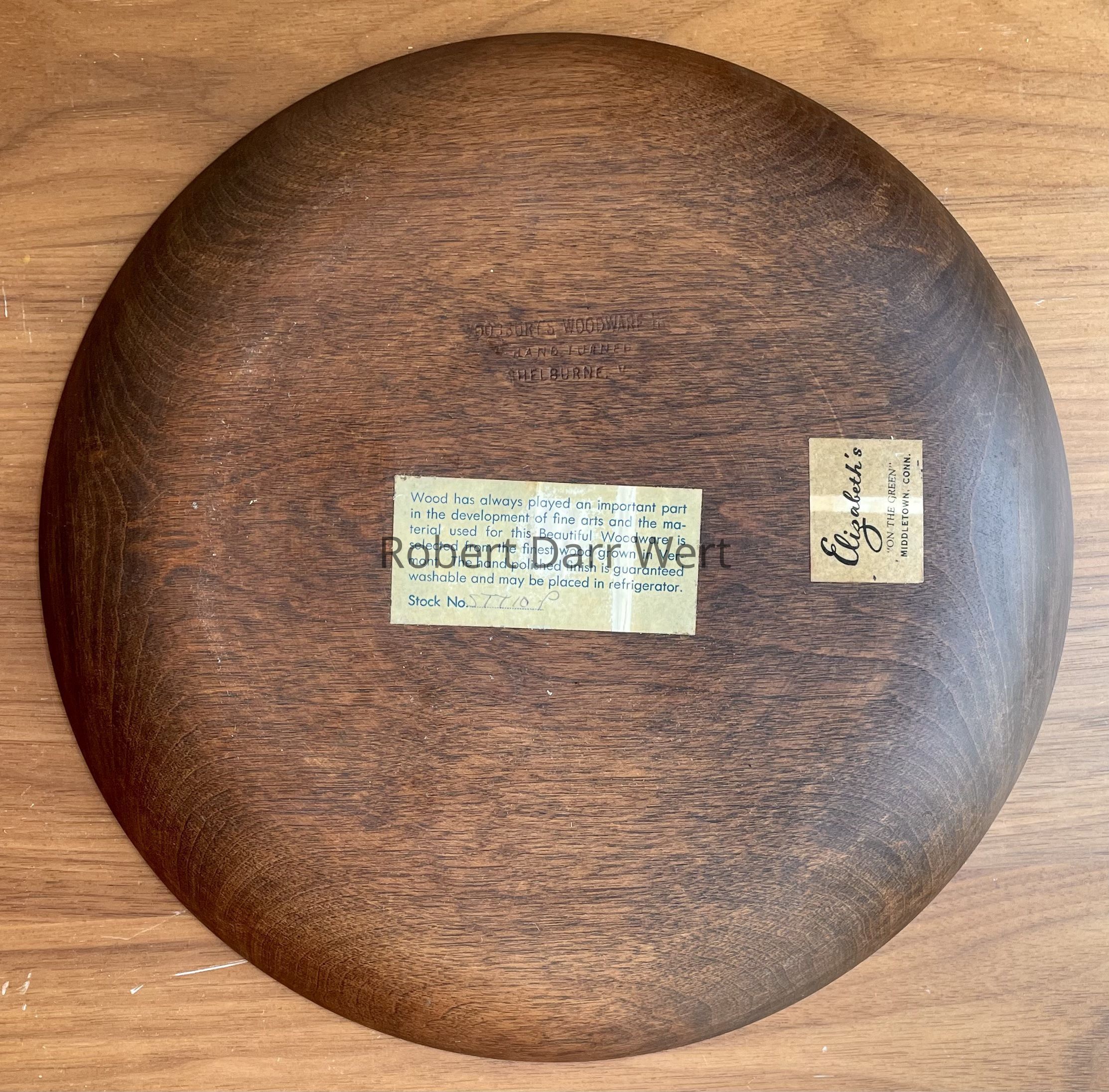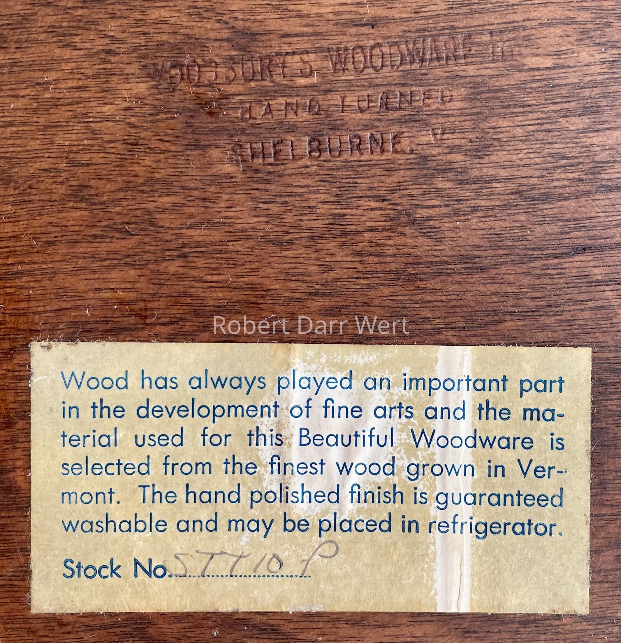 Front: “wert by hand” in brown glaze, left side of tile face. Back: “Woodbury’s Woodware, Hand Turned, ……ington VT …….” (…… indicates illegible portions of imprint), along with printed adhesive labels for Woodbury’s Woodware and retailer Elizabeth’s on the Green.Dimensions