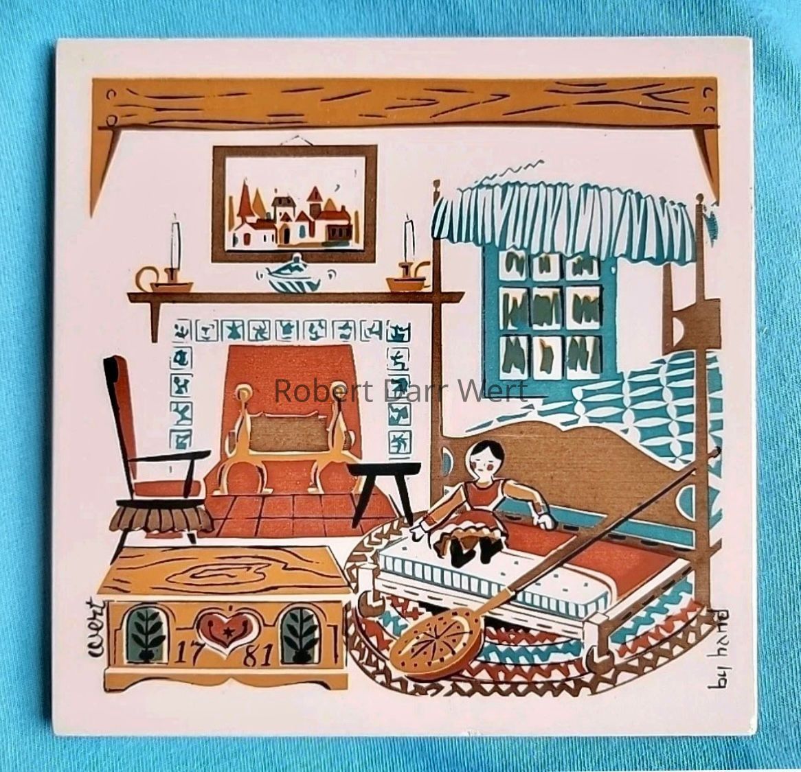 The scene is set in a cold season, noted by the bed warmer lying across the trundle bed and a fire ready to be lit in the fireplace. A doll on the trundle indicates a child, probably a little girl, occupies this room with her parents who use the larger four-poster bed. The parents may have been married in 1781 based on the date seen on the blanket chest. Delft tiles with figural designs decorate the fireplace surround. The framed village scene above the mantle resembles some of Wert’s early 1950’s village prints.