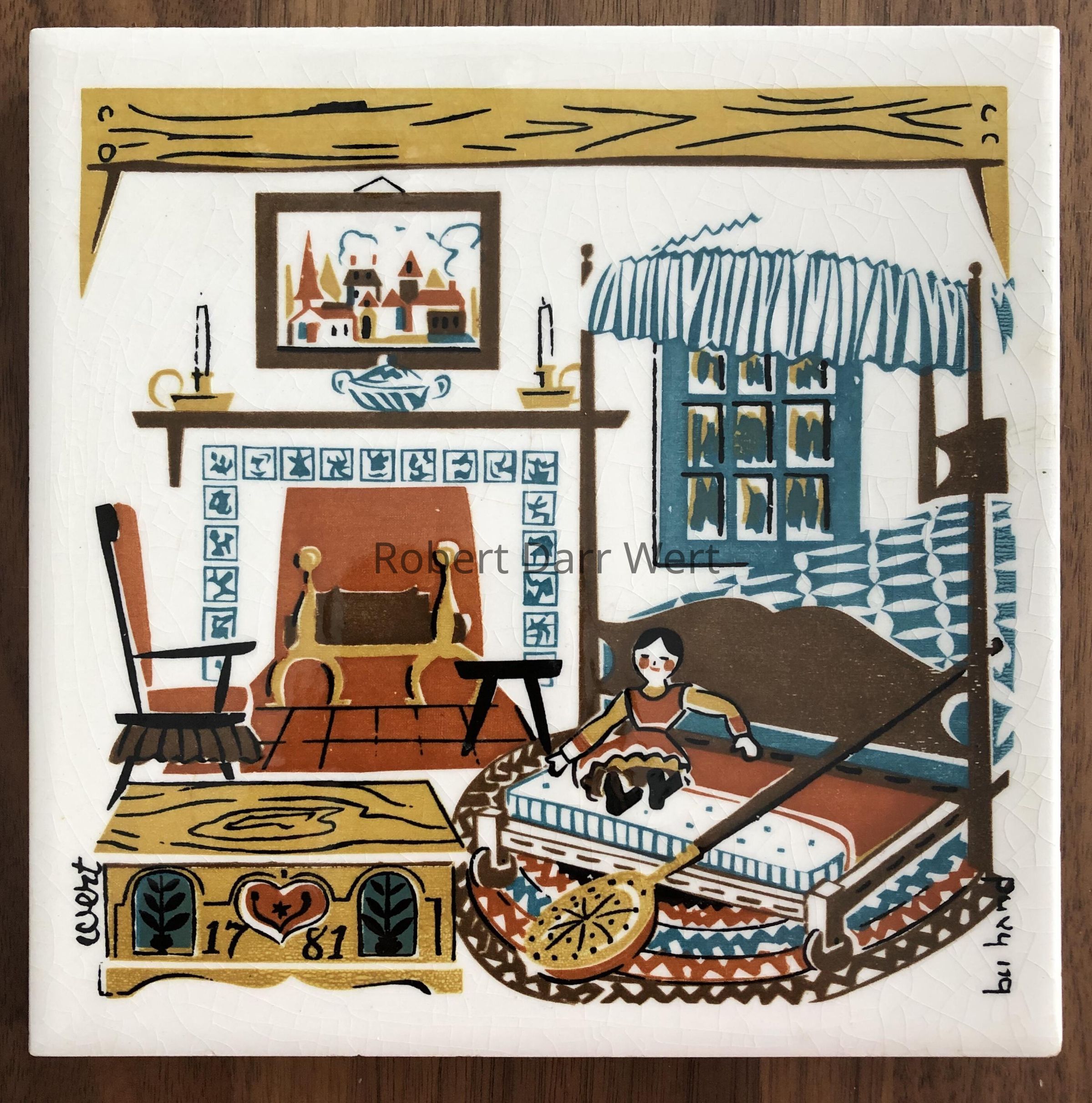 A five-color silkscreen underglaze print on a white tile blank depicting an early American bedroom.