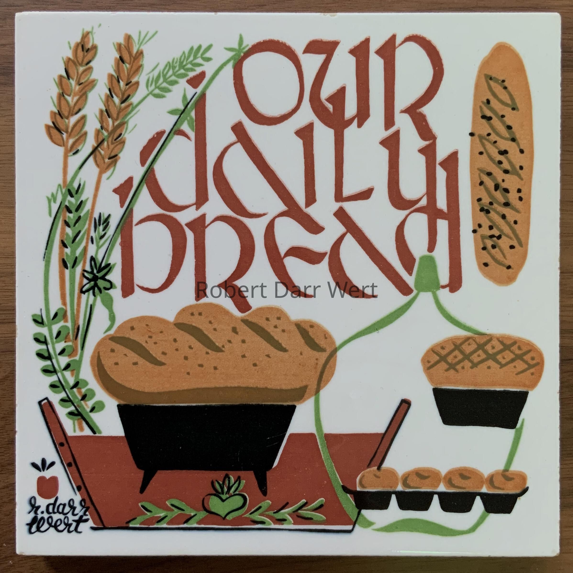 A four-color silkscreen underglaze print on a white tile blank depicting wheat, breads, a wooden basket in silhouette and a glass demijohn in outline arranged around the text, “our daily bread”, from the Lord’s Prayer.