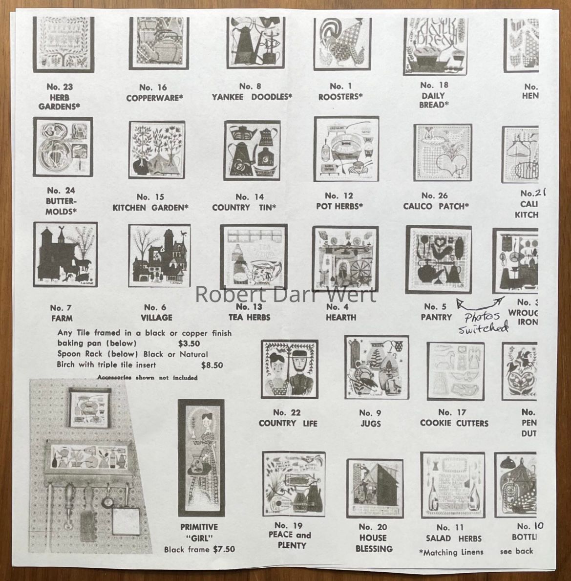This tile appears in the c.1953 brochure “Robert Darr Wert/Country Print Tiles”, the c.1956 brochure “Country Prints Tiles designed by Robert Darr Wert”, and the c.1960 brochure “Robert Darr Wert/Country Prints Tiles”; see images.