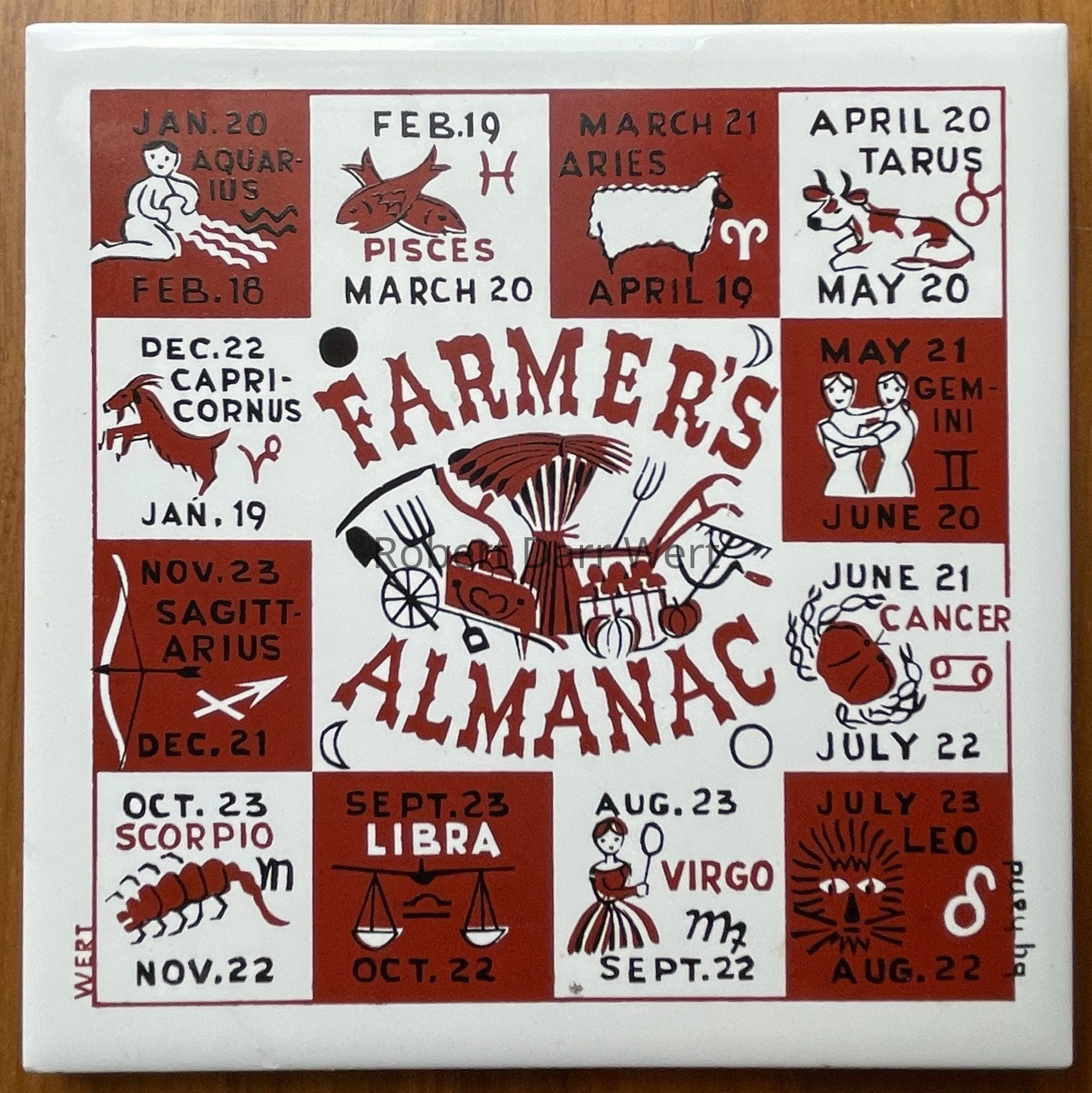A two-color silkscreen overglaze print on a glazed white tile blank depicting zodiac symbols and corresponding dates, as well as the tile name, “Farmer’s Almanac”. At center is a shock of wheat and an assortment of farm tools and produce. This design was produced in three colorways: red, yellow and blue. This example is in red; see images.