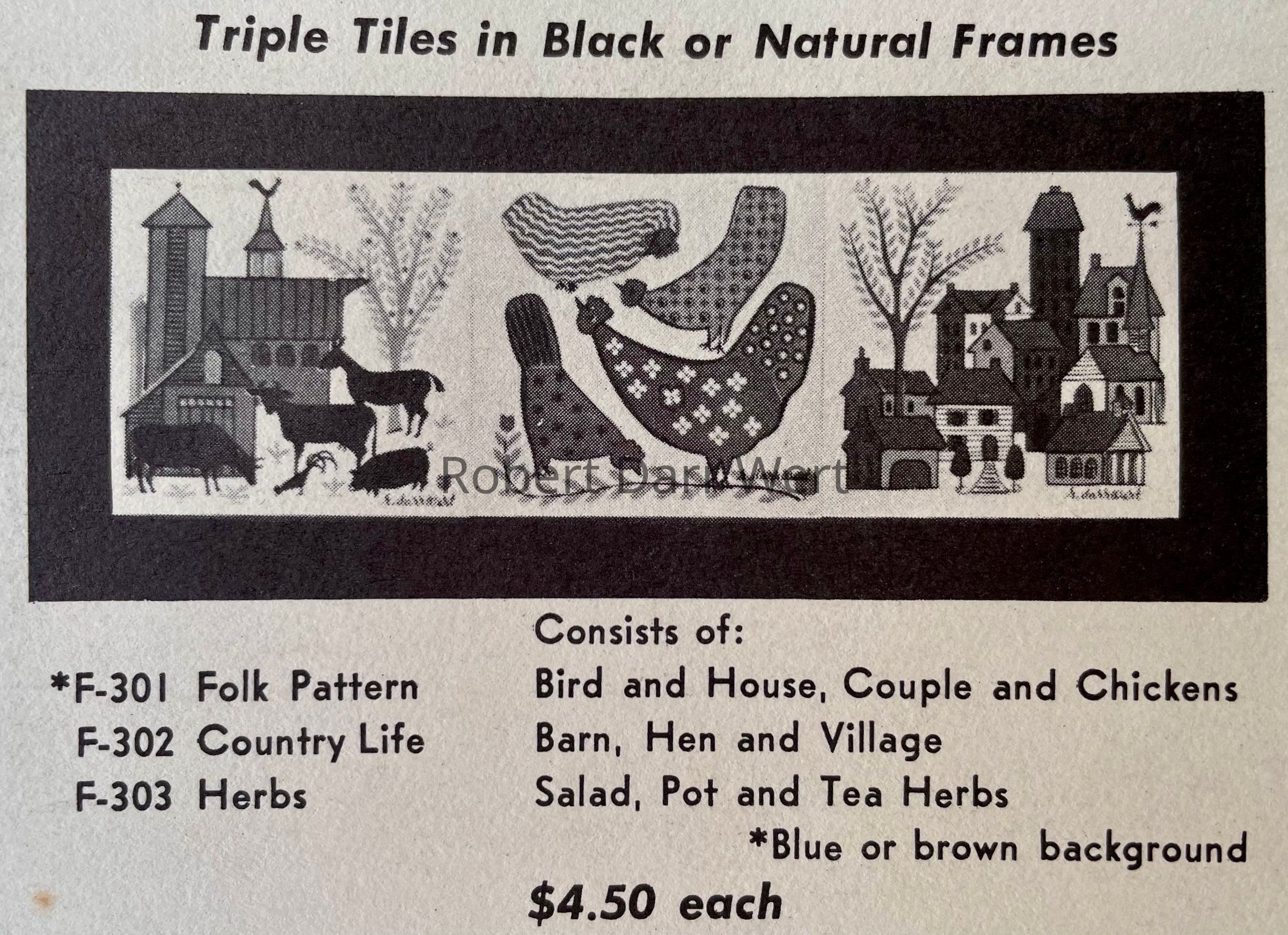 Tiles designed by Robert Darr Wert and produced by Ceramo Studio, NYC, for Country Prints. Frames produced near Gill, MA. Framed tiles assembled and finished by Country Prints in Gill, MA.