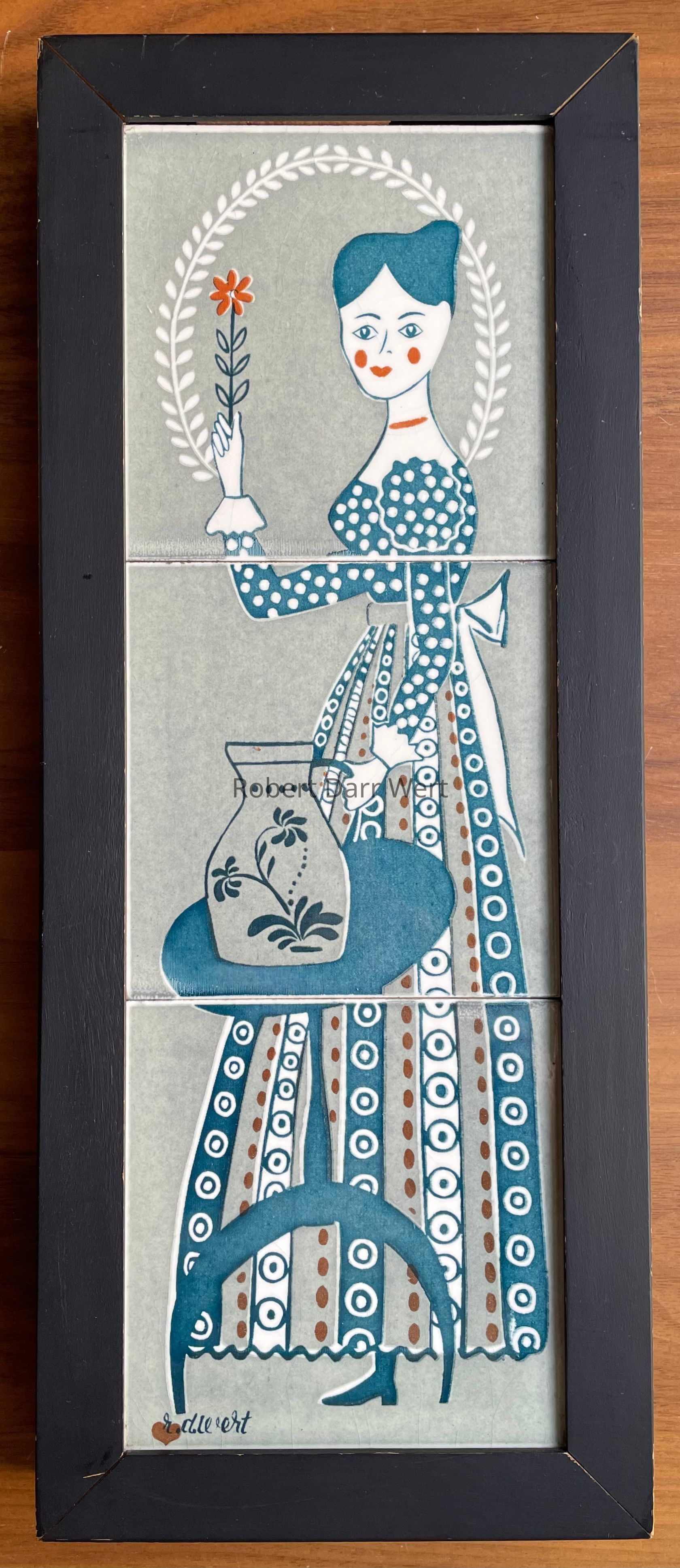 This item appears in the c.1953 brochure “Robert Darr Wert/Country Print Tiles” as “Primitive Girl”, and is listed on a packing slip/order form of the same year as “Girl With Flower 305-F”.