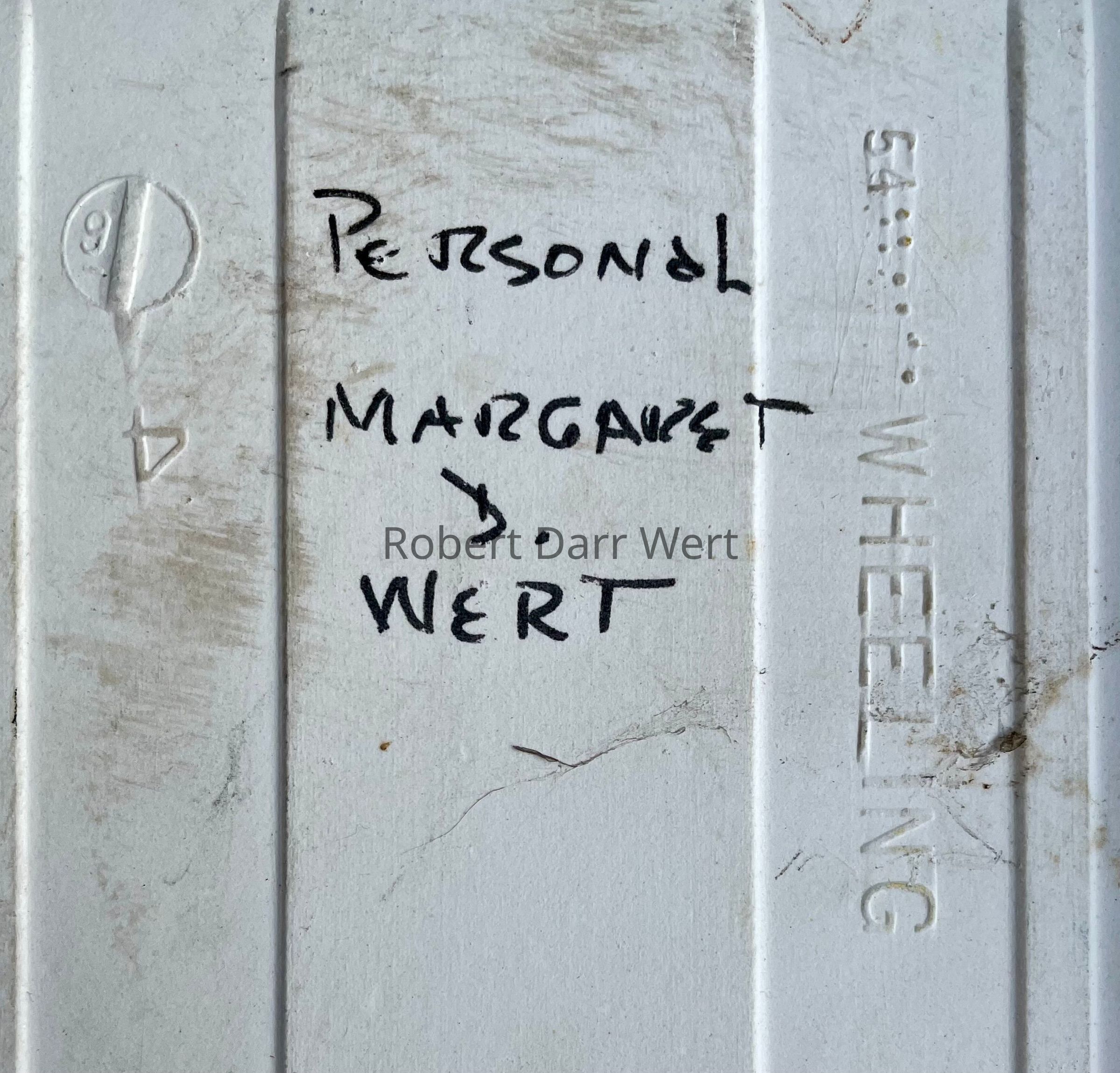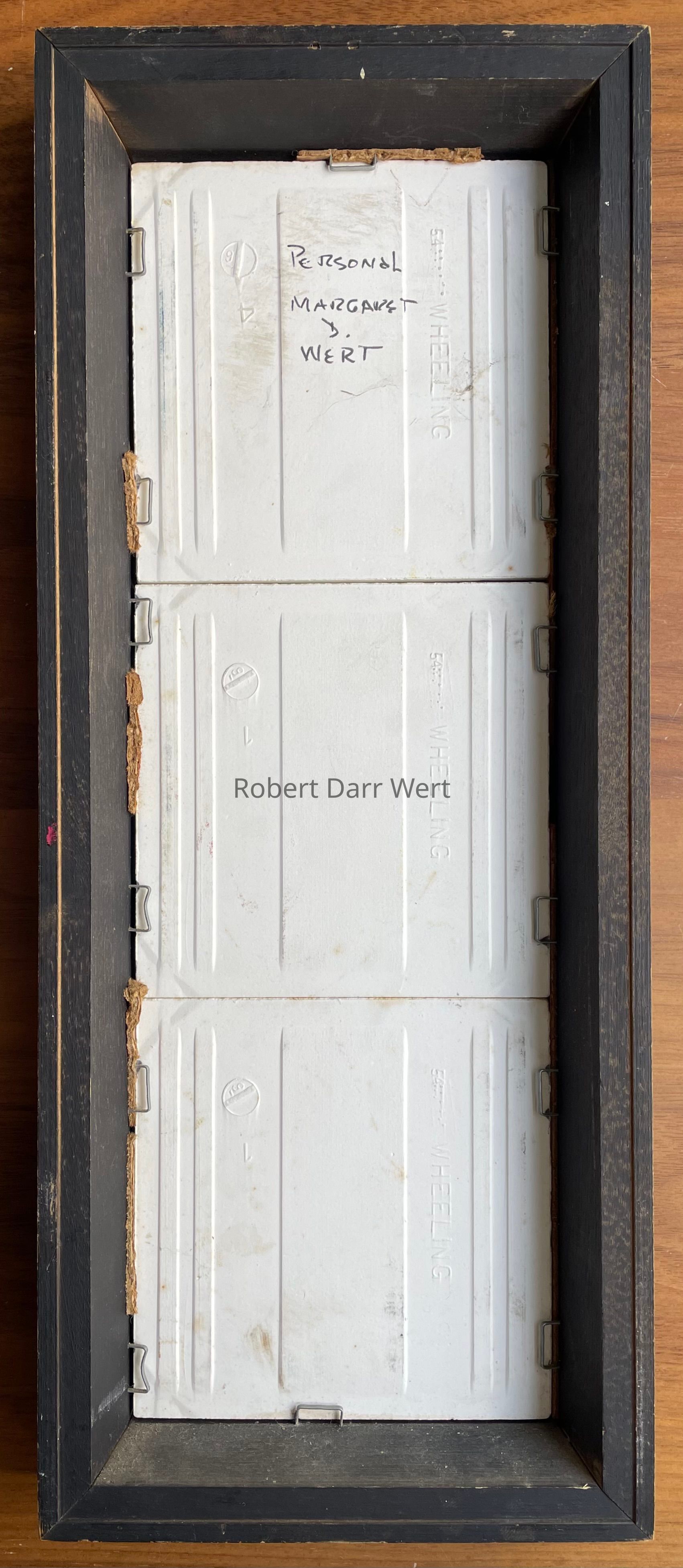 This framed triple tile belonged to Margaret D. Wert, wife of Robert Darr Wert. The lack of a backing board may indicate this was an early product sample. The tile backs are embossed with the name of the tile blank manufacturer, Wheeling Ceramics of Wheeling, West Virginia. To the right of the name is the number 54 followed by nine dots, Wheeling’s code for the year and month of production, September 1954.Made/Created