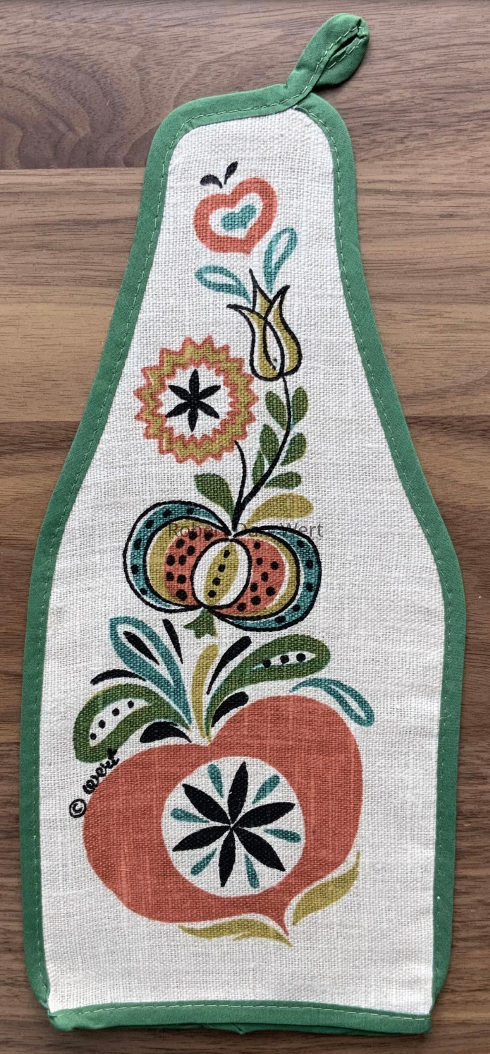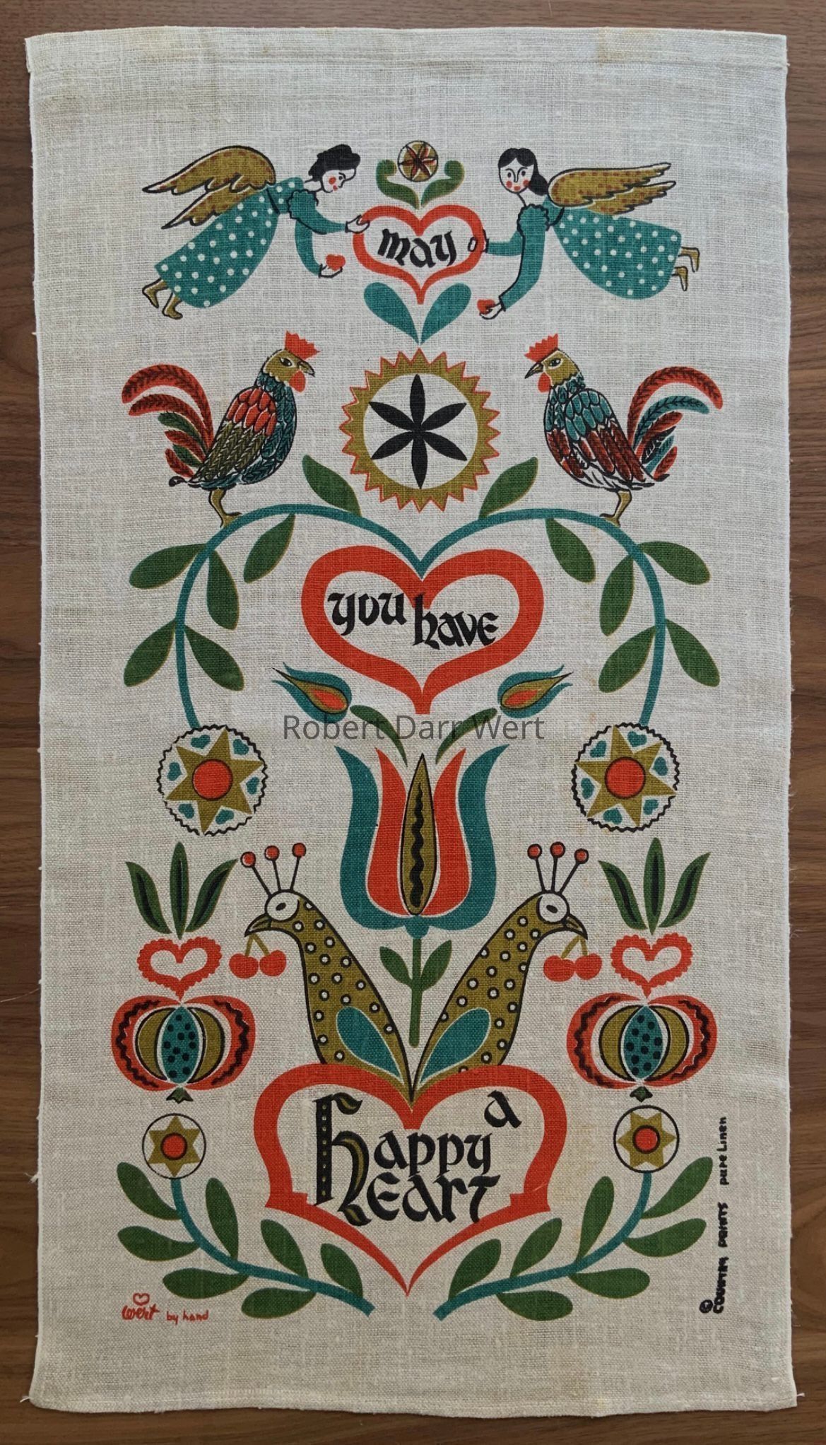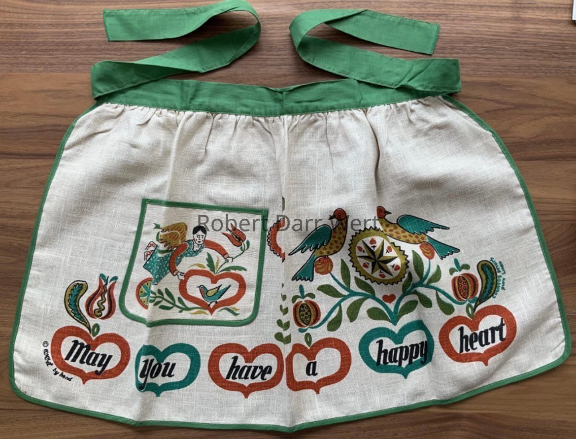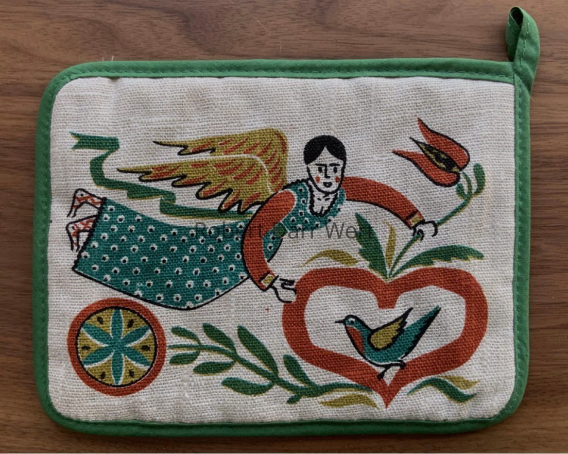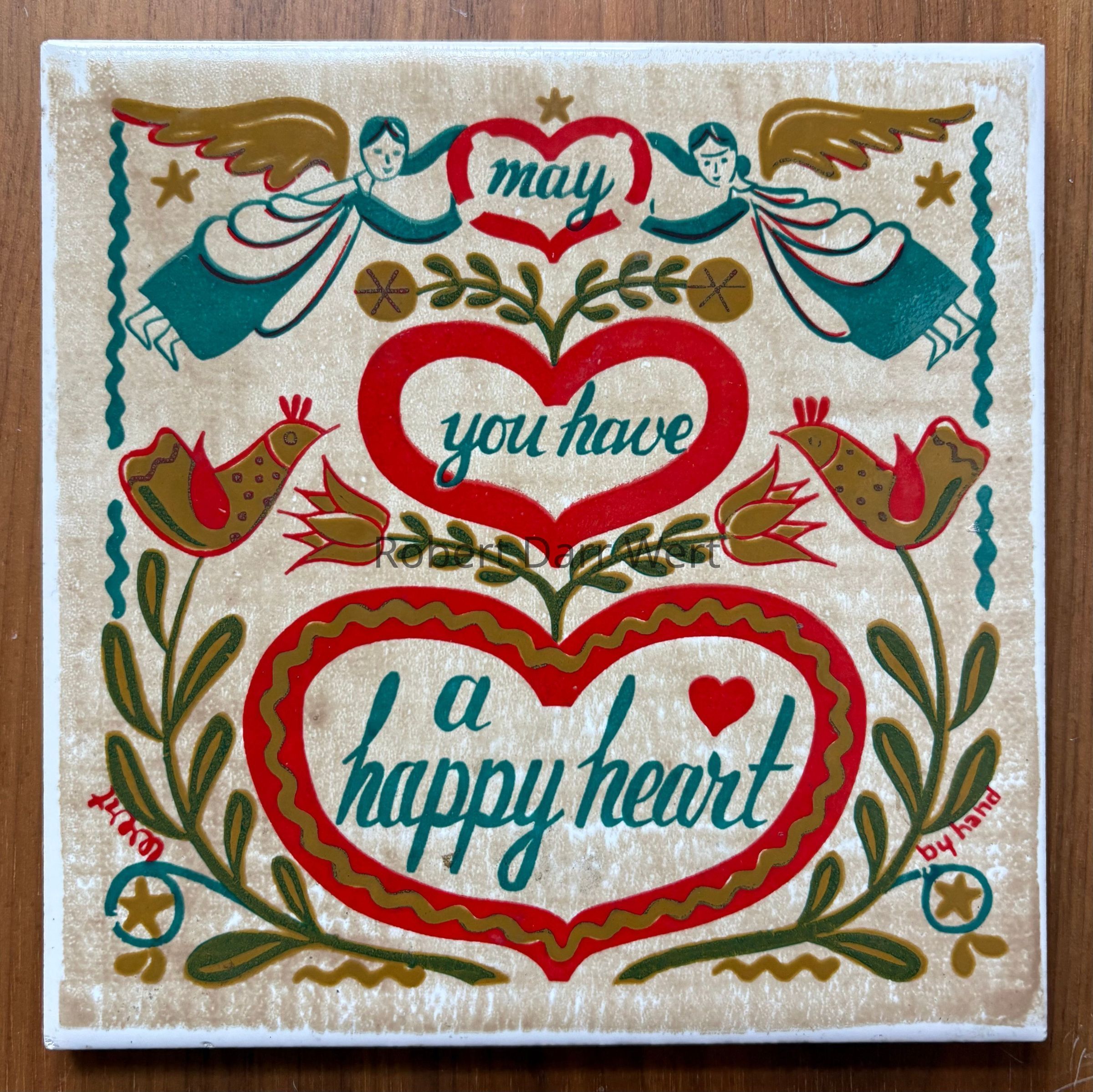 A four-color silkscreen overglaze print on a glazed white tile blank depicting a Pennsylvania “Dutch” inspired composition of angels, birds, flowers and hearts supporting the phrase, “may you have a happy heart”. This design varies from the previous version and includes a mottled beige underlay of color, likely applied to make the background appear to be more like the unbleached linen of the matching kitchen towel and accessories. This version was likely produced in the mid-1960’s.