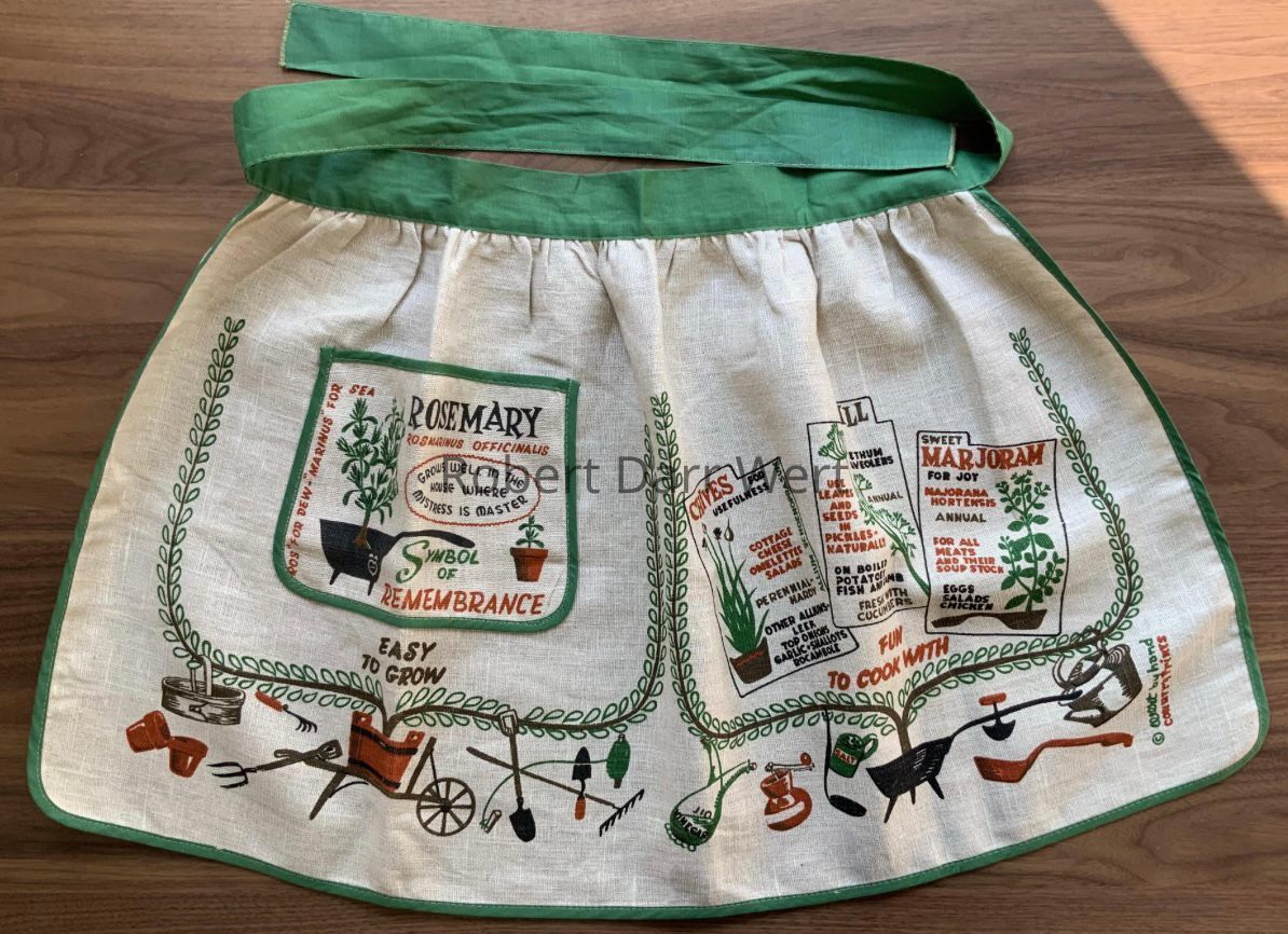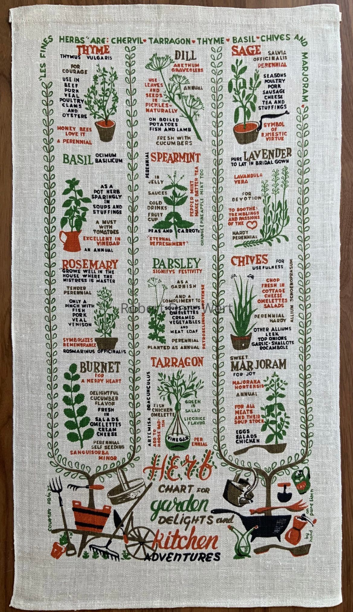 A five-color silkscreen overglaze print on a glazed white tile blank depicting an herb chart listing specific uses for over a dozen annual and perennial herbs. Trailing vines complete the composition. A matching towel/wallhanging and apron were also produced; see images. These items were available singly or in matched gift sets. This tile appears in the brochures “Country Prints by Robert Darr Wert and Neighbors”, c.1963 and c.1966, see images.