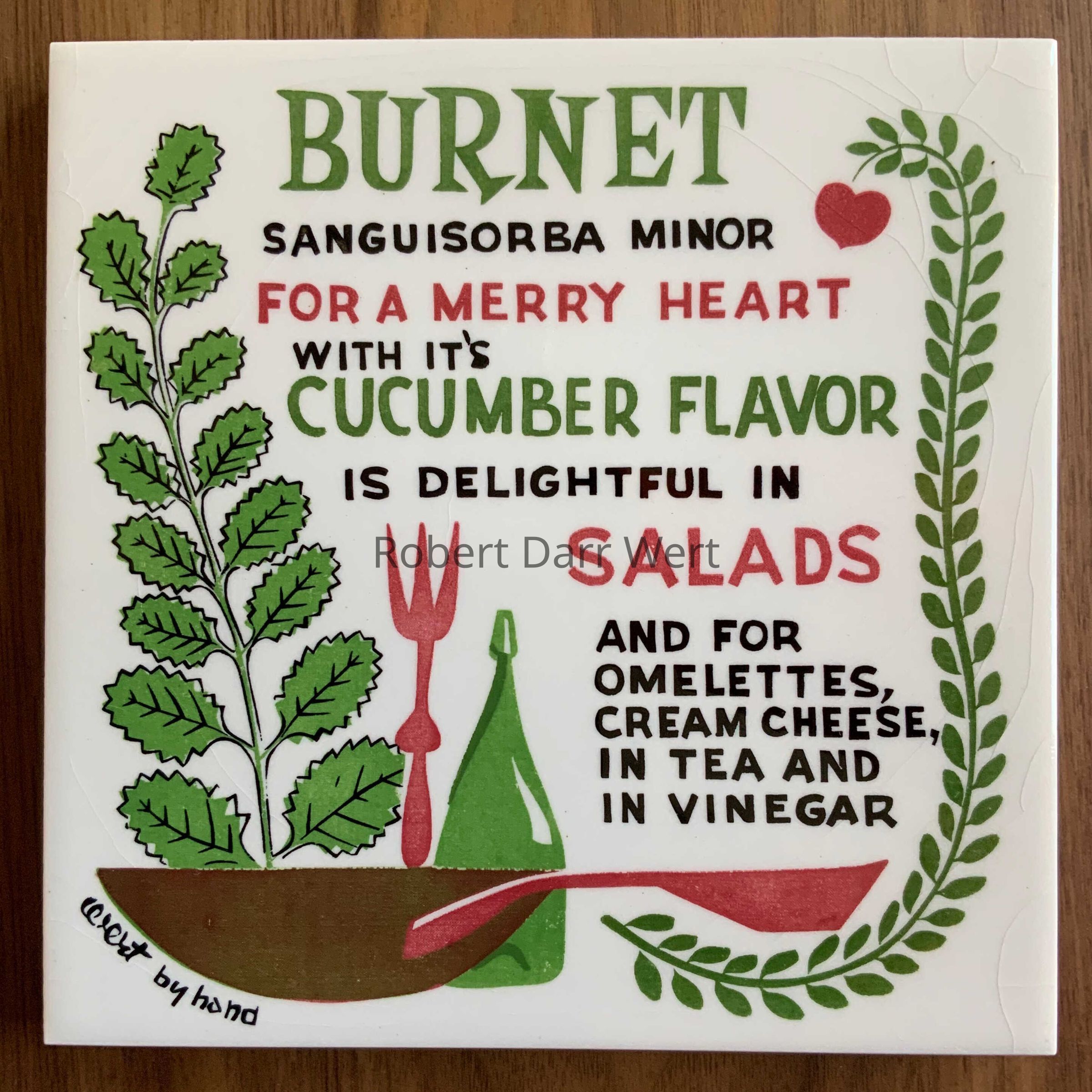 A four-screen/five-color silkscreen underglaze print on a white tile blank depicting the herb burnet with its latin name, flavor description and suggestions for use.