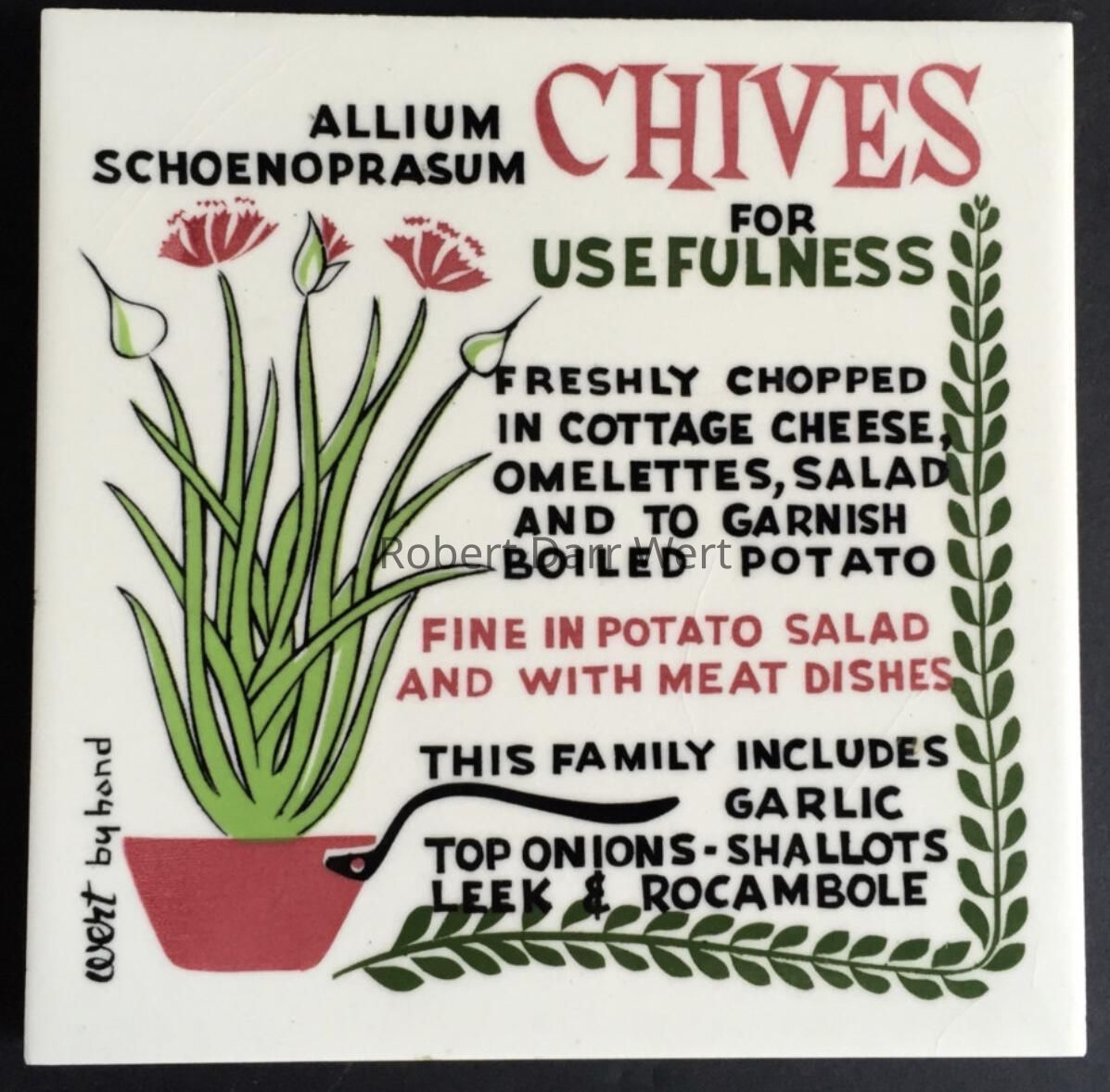 A four-color silkscreen underglaze print on a white tile blank depicting the herb chives, its latin name, and suggestions for use.