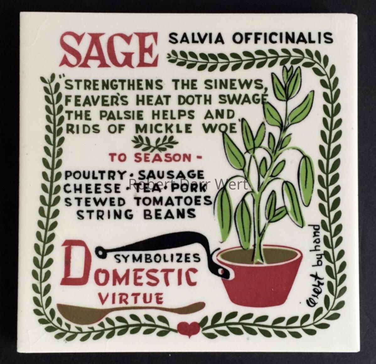 A four-screen/five-color silkscreen underglaze print on a white tile blank depicting the herb sage, its latin name, a quote from an archaic medical text, suggestions for use, and the herb’s symbolism. A sage plant is potted in a copper cooking pot. A trailing vine borders the composition.