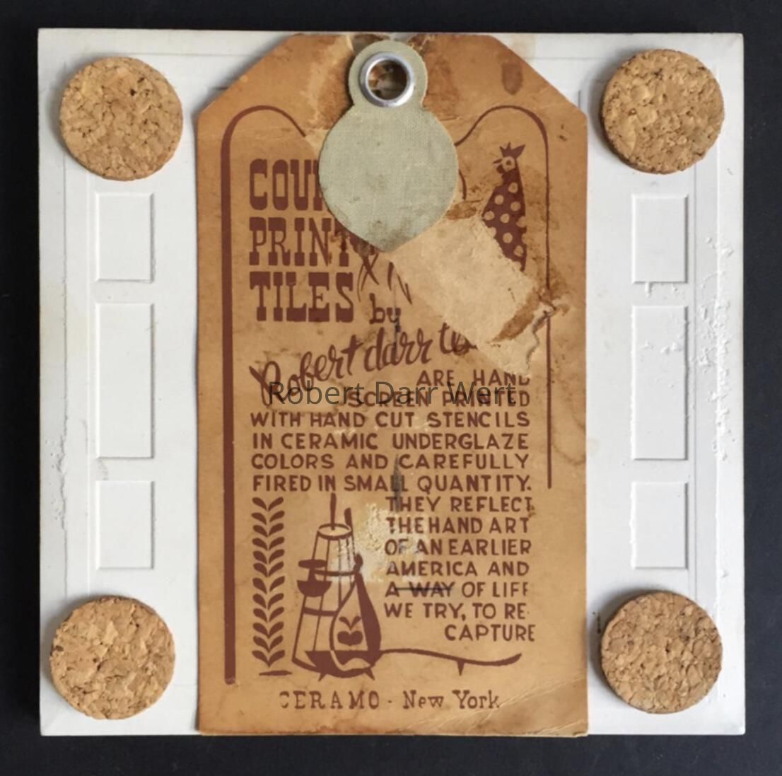 This tile appears in the c.1960 brochure “Robert Darr Wert/Country Prints Tiles”, and is one of a set of six tiles dedicated to single herbs; see images.Made/Created
