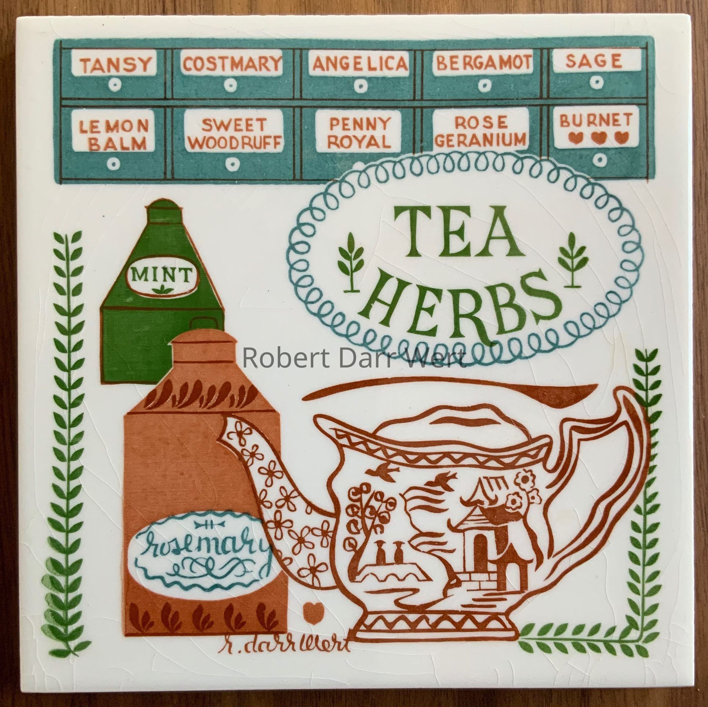 A four-color silkscreen underglaze print on a white tile blank depicting drawers and tins for storing tea herbs, and a Chinese export teapot for serving. Herb names presented: tansy, costmary, angelica, bergamot, sage, lemon balm, sweet woodruff, penny royal, rose geranium, burnet, mint and rosemary.