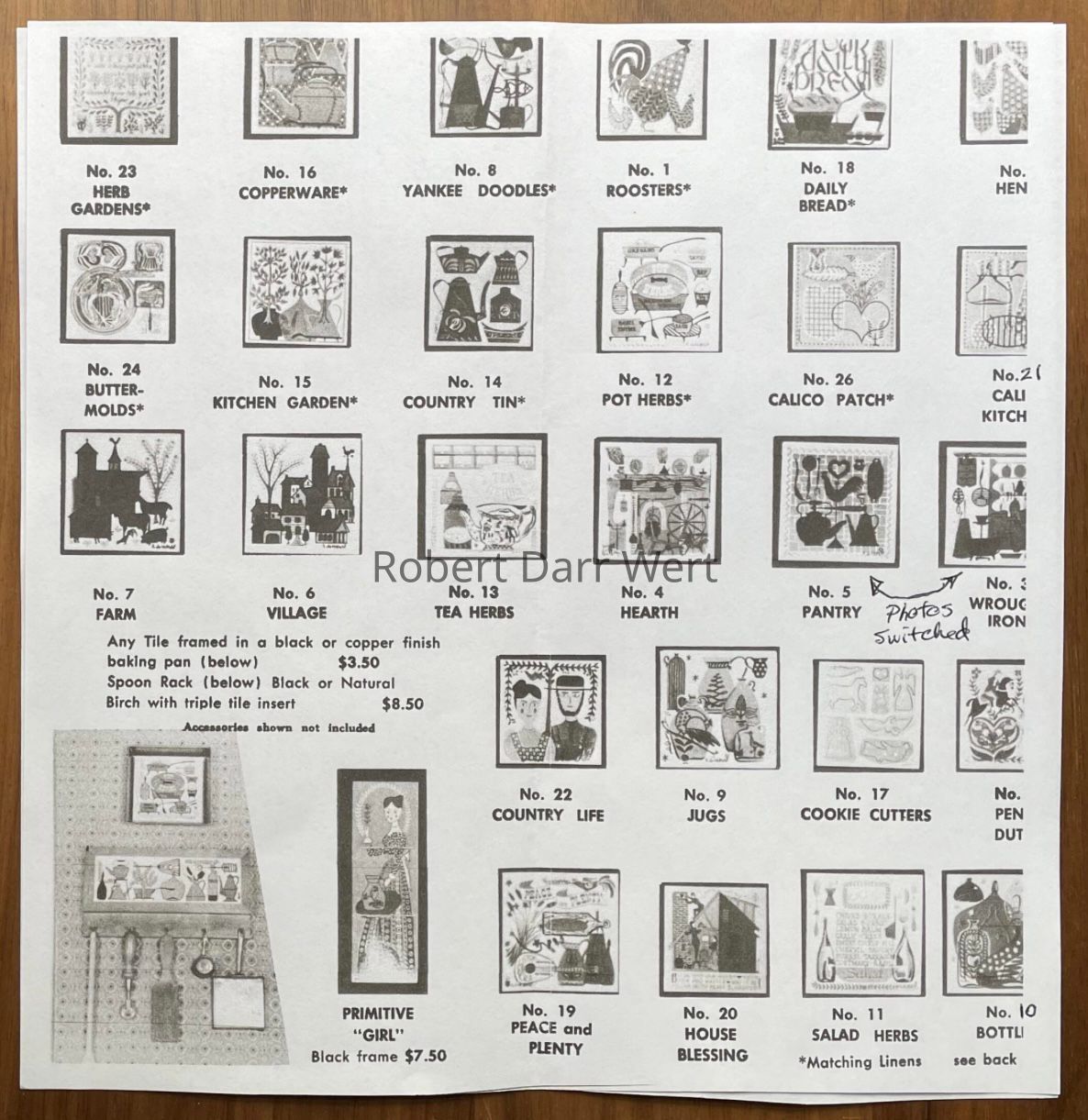 This tile appears in the c.1953 brochure “Robert Darr Wert/Country Print Tiles”, the c.1956 brochure “Country Print Tiles designed by Robert Darr Wert”, the c.1960 brochure “Robert Darr Wert/Country Prints Tiles”, and in an ad for Elliots Furniture of Billings, Montana, in 1957; see images.