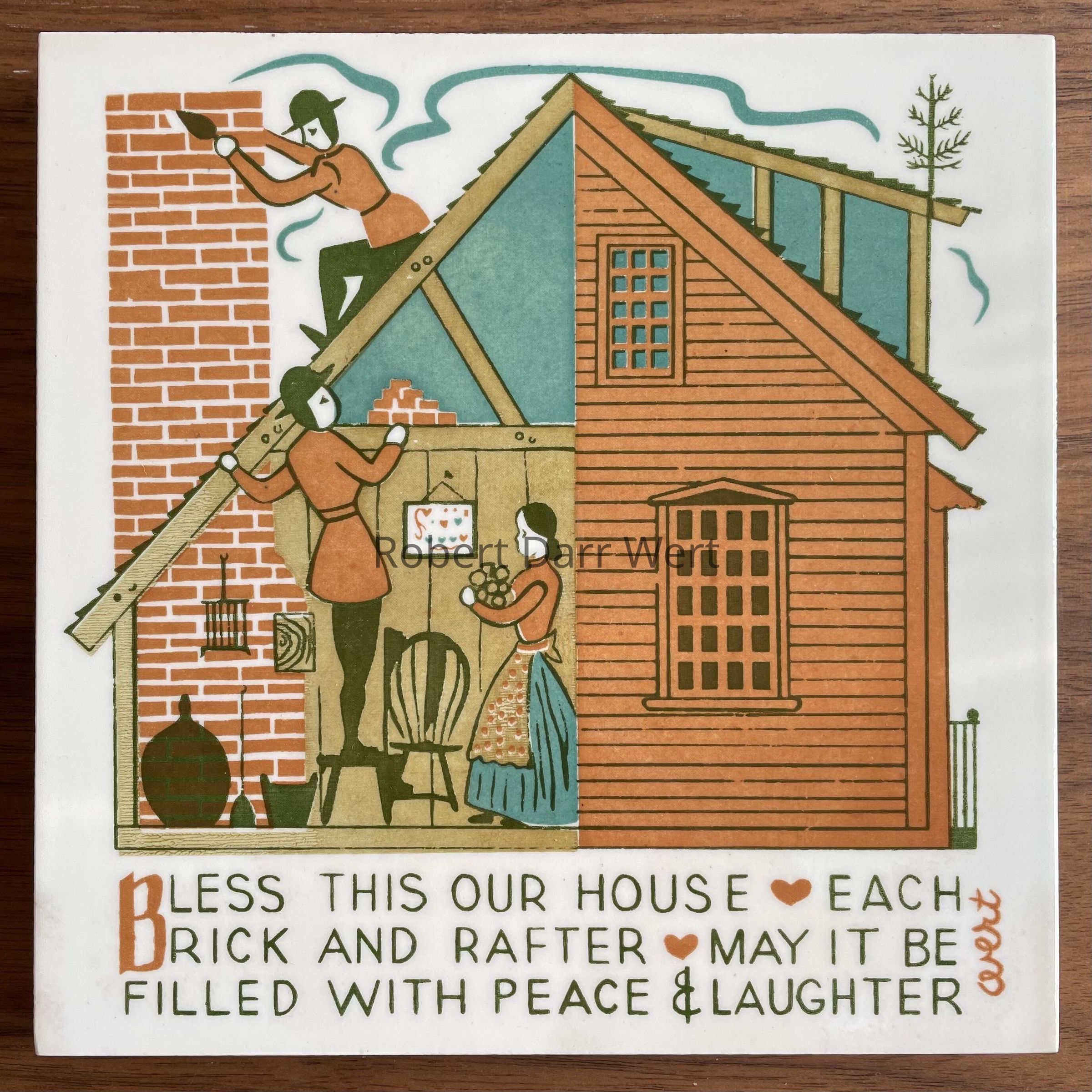 A four-color silkscreen underglaze print on a white tile blank depicting a saltbox house under construction, with a house blessing printed below. The saltbox house is shown partially in section, revealing activity within: a woman carries an armload of logs for the fire, a man stands on a stool with one hand reaching toward a stack of bricks, another man sits on the roof while mortaring bricks on the chimney stack. Atop the front dormer is a small pine tree, a reference to the Northern European tradition of “topping-off”: the roof is completed first so the interior remains dry while finishing the house. When the roof is finished, a topping-off ceremony takes place, blessing the house and the success of the project.