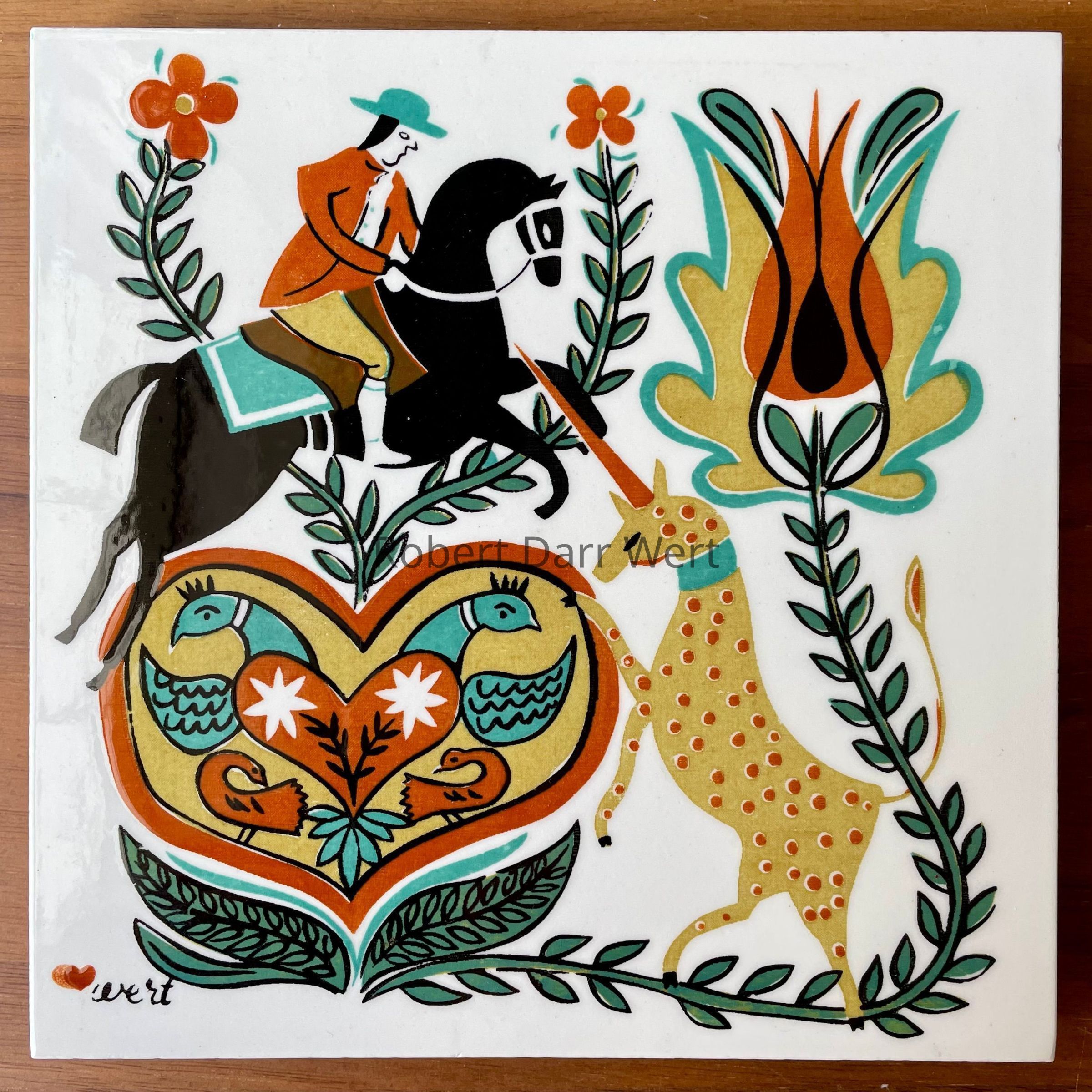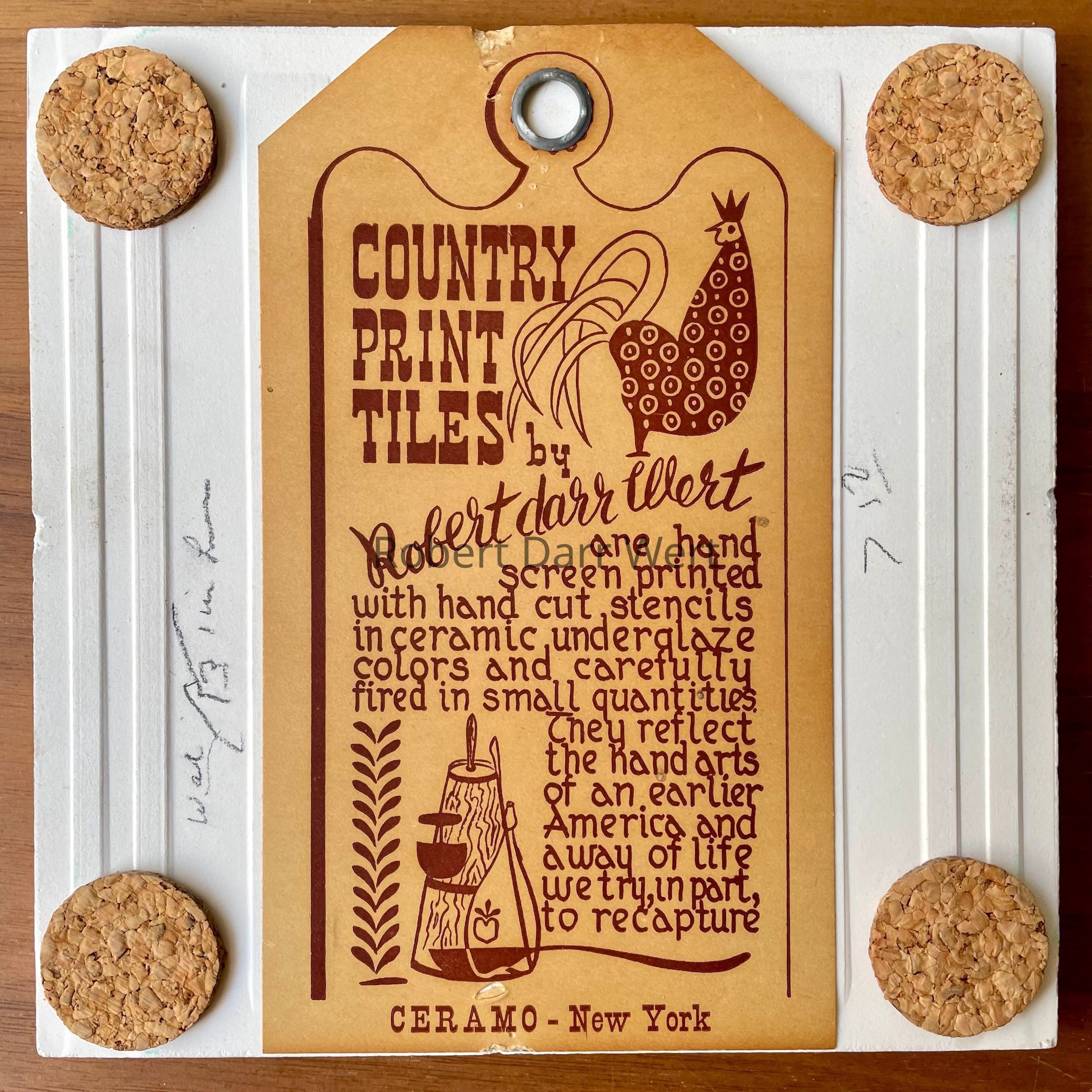 A four-screen/five-color silkscreen underglaze print on a white tile blank depicting Wert’s interpretation of Pennsylvania “Dutch” folk art iconography. This tile appears in the c.1953 brochure “Robert Darr Wert/Country Print Tiles”; see images.
