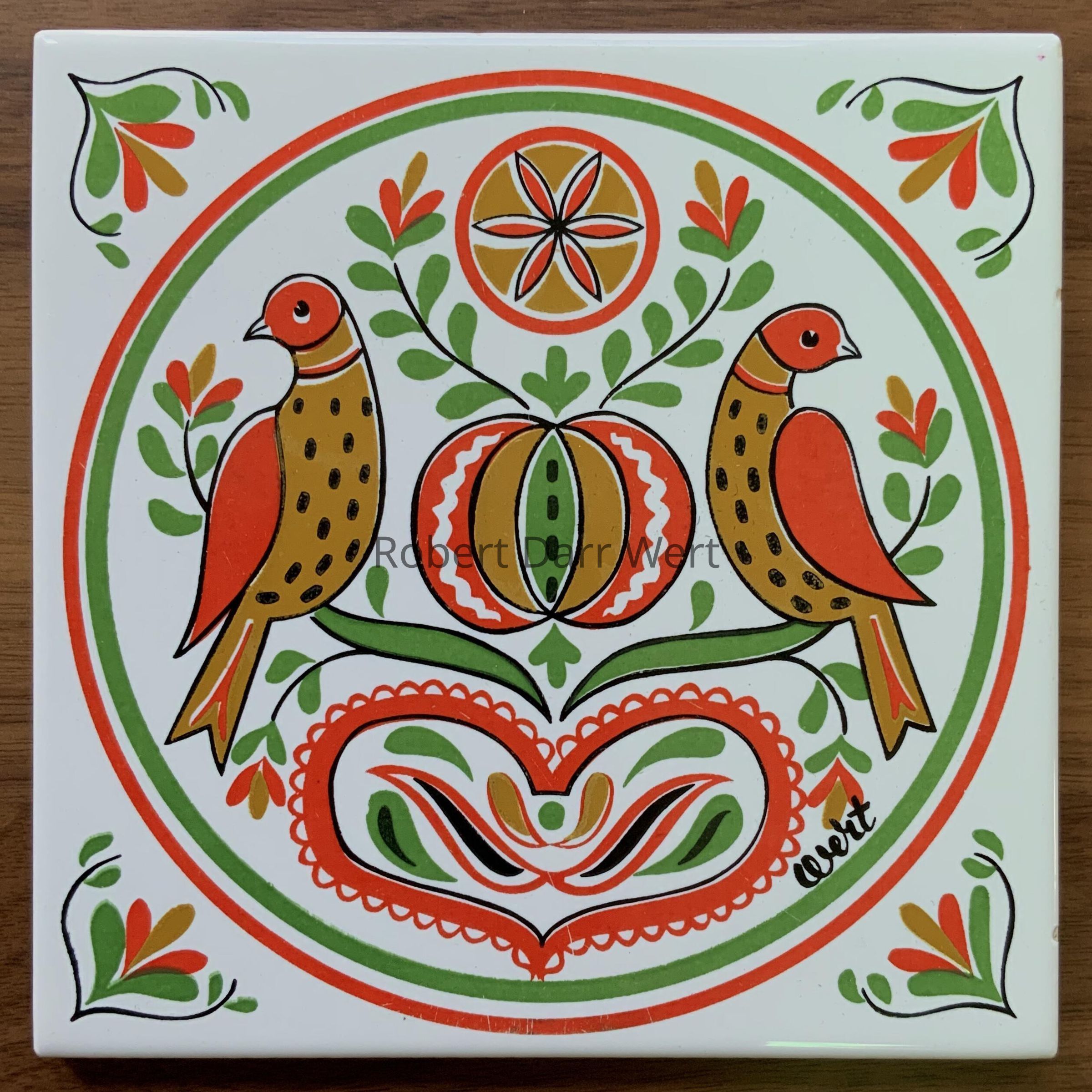A tile with a four screen/four color silkscreen overglaze depicting Wert’s interpretation of Pennsylvania “Dutch” iconography.