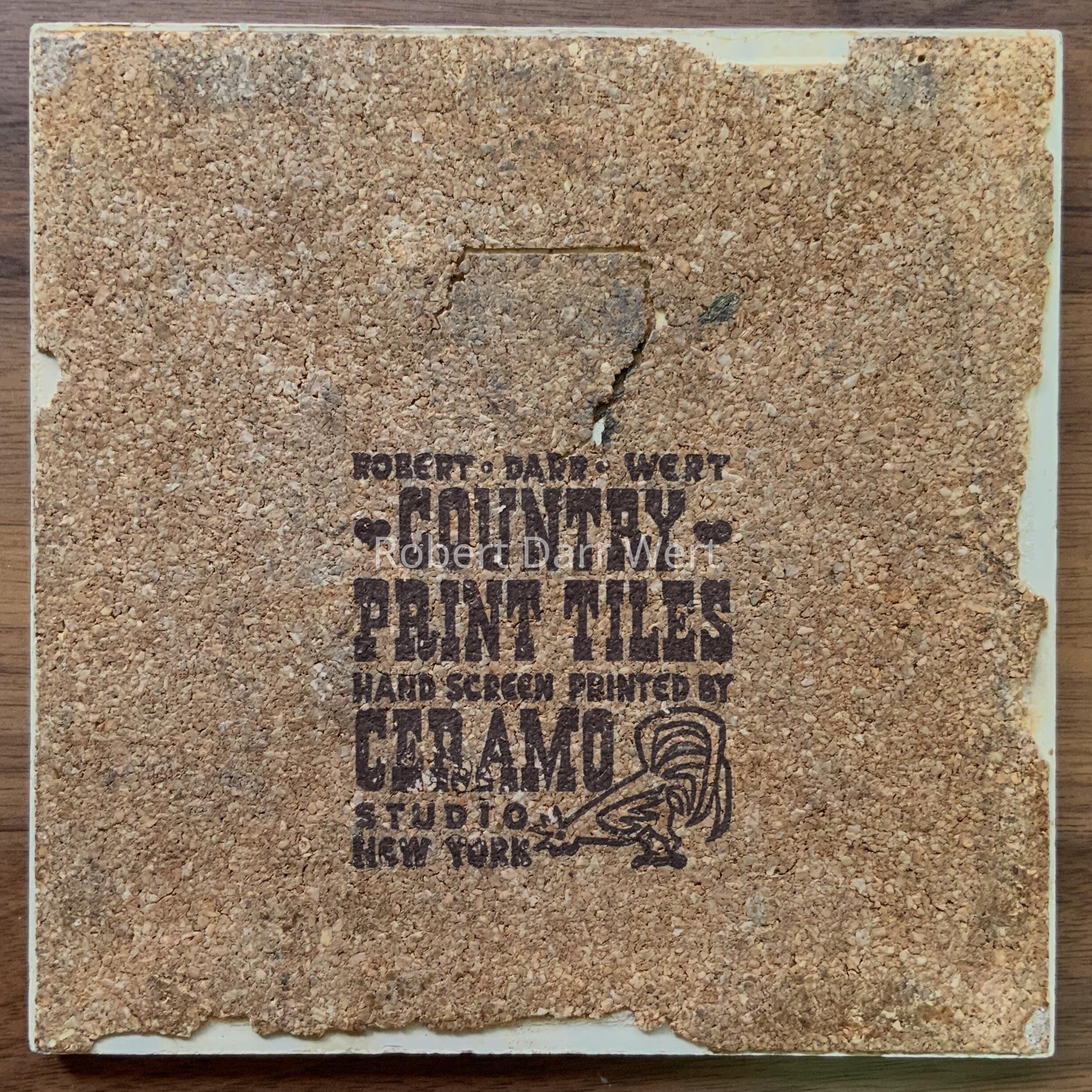 Design, screen production, and mixing of colored overglazes performed at the Country Prints workshop, Gill, MA. Screen printing of overglaze colors, firing and finishing by Ceramo Studio, NYC. This example is printed on the thinner tile body used by Country Prints/Ceramo Studio from 1962 onward.