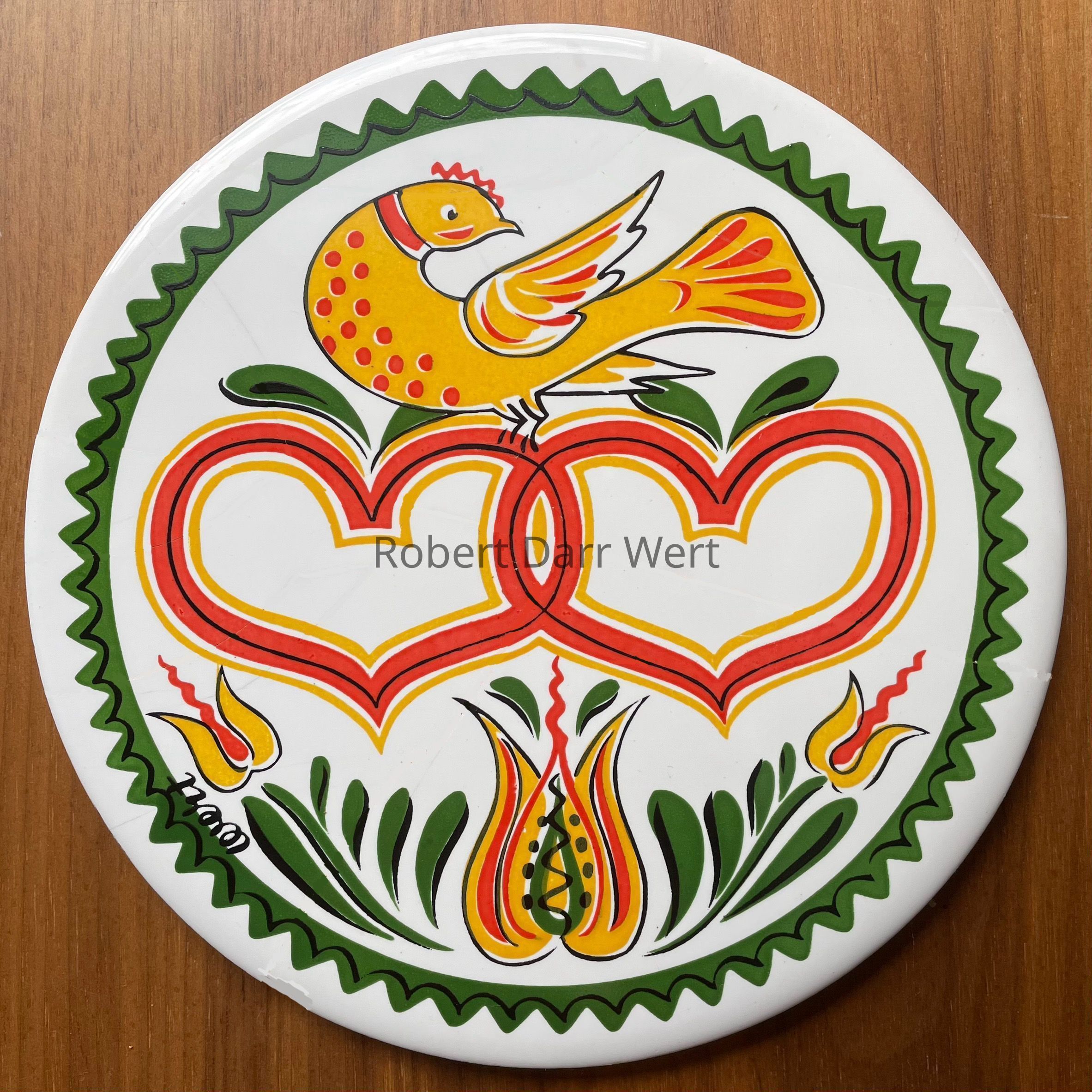 A four-color silkscreen overglaze print on a glazed white tile blank depicting Wert’s interpretation of Pennsylvania “Dutch” iconography.Made/Created
