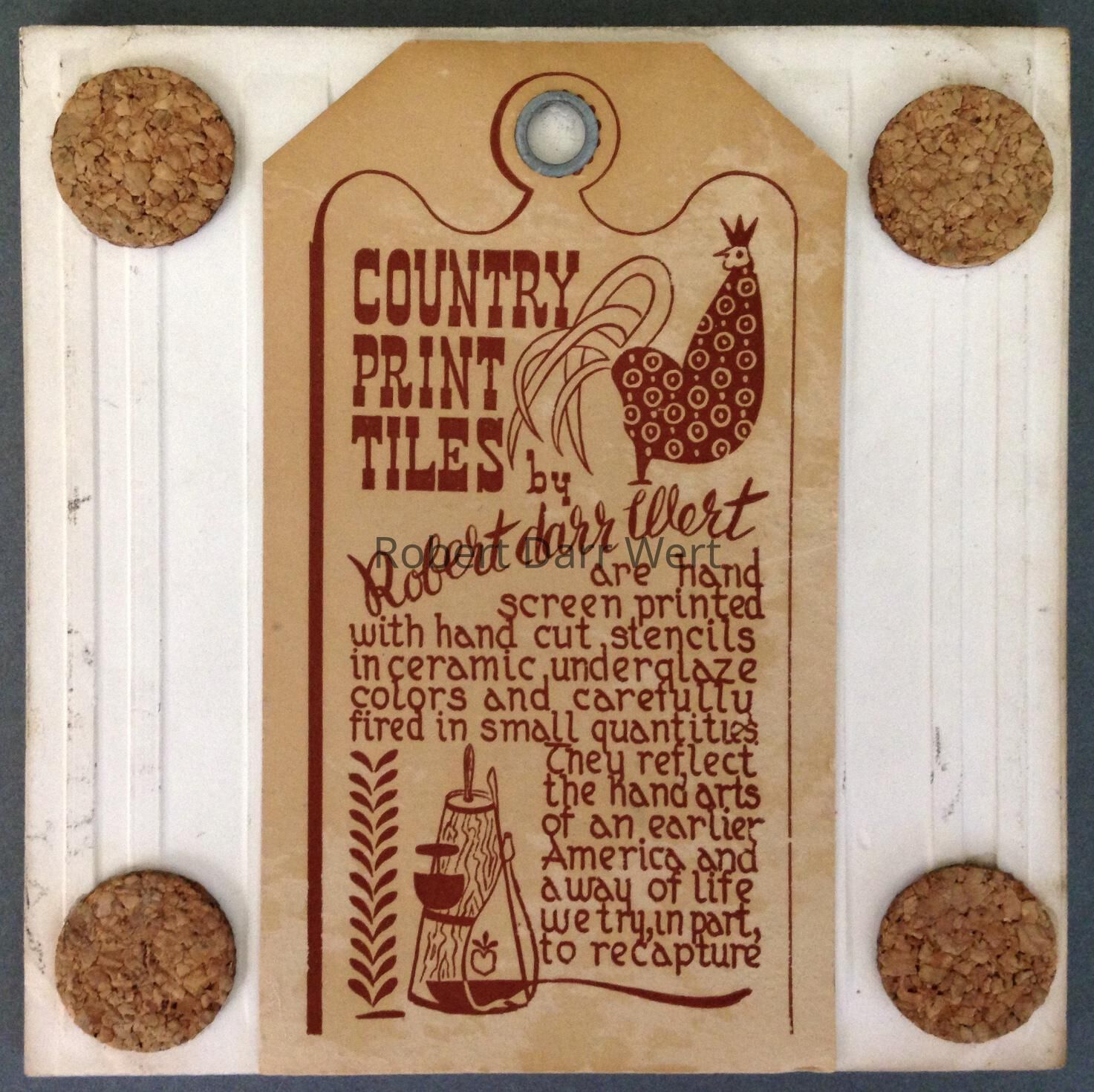 Front: “wert by hand”, lower right corner near rootball of tree. Back: Country Print Tiles label hanger.