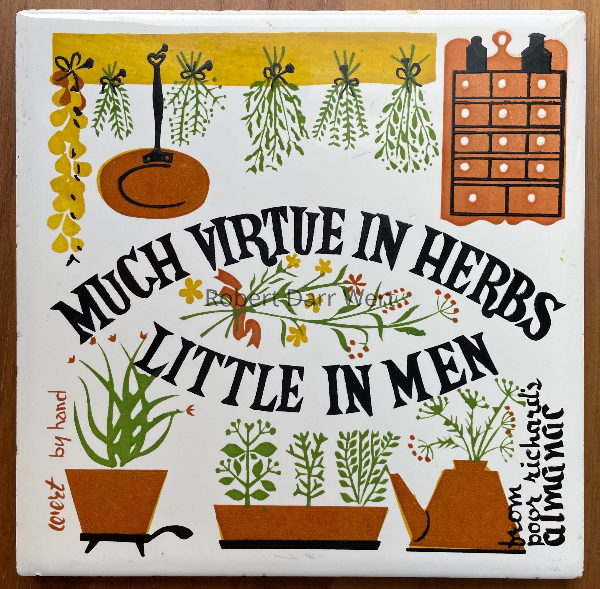 A four-screen/five-color silkscreen overglaze print on a glazed white tile blank depicting dried herbs hanging from a wooden beam, and fresh herbs growing in copper containers supporting the maxim from Poor Richard’s Almanac, “Much virtue in herbs, little in men.”
