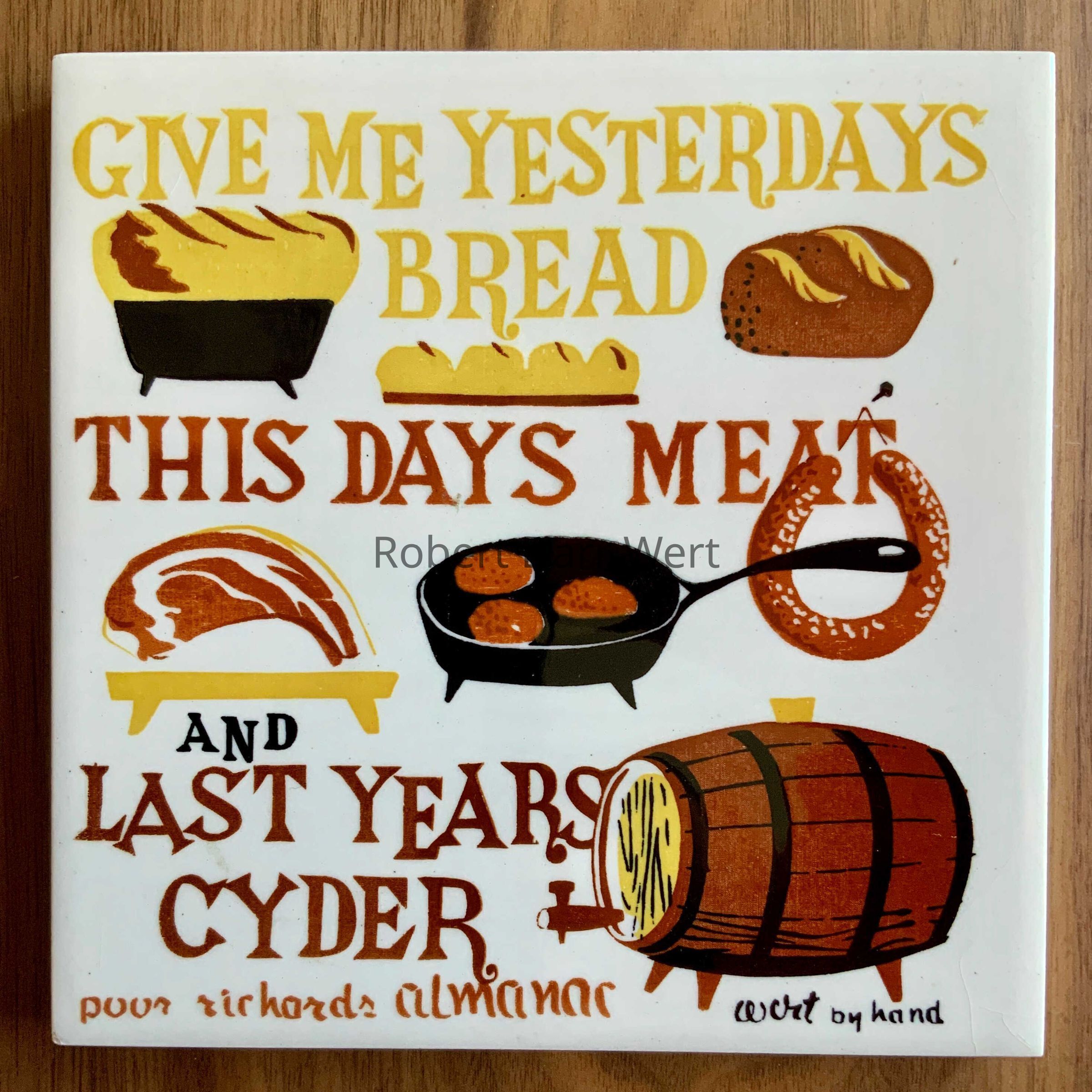 A four-color silkscreen underglaze print on a white tile blank highlighting a maxim from Poor Richard’s Almanac, “GIVE ME YESTERDAYS BREAD, THIS DAYS MEAT AND LAST YEARS CIDER”. The maxim is reinforced by illustrations of breads, meat and a wooden cider cask with a spigot.