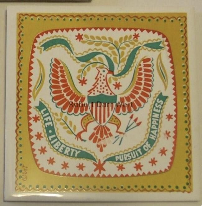 A three-color silkscreen underglaze print on a white tile blank inspired by an early American applique quilt. At center an American eagle with a patriotic chest shield holds a furling banner in its beak. Below, another banner is emblazoned with a partial phrase from the Declaration of Independence, “Life, Liberty, Pursuit of Happiness”. Below are thirteen red six-point stars representing the original thirteen states of the union. This design is from the late 1950’s, but this example is recolored and printed on the thinner tile body used by Country Prints/Ceramo Studio from 1962 onward. See previous entry for comparison.